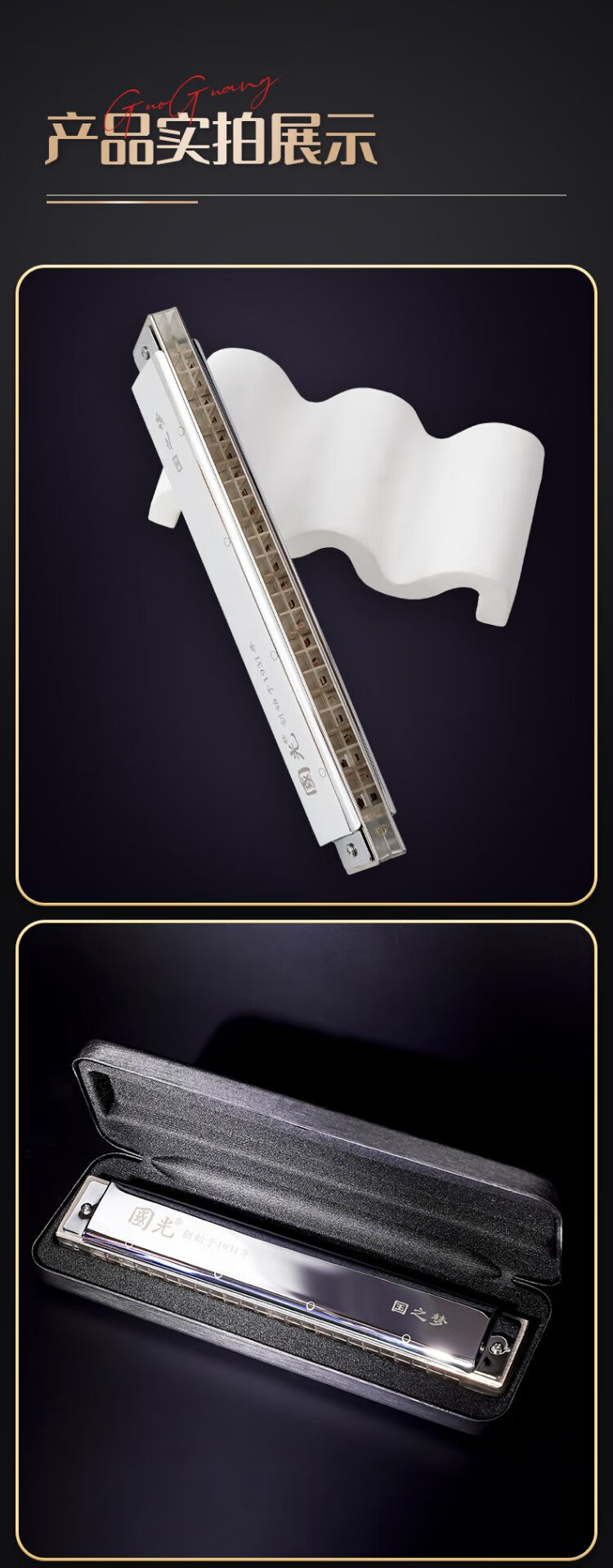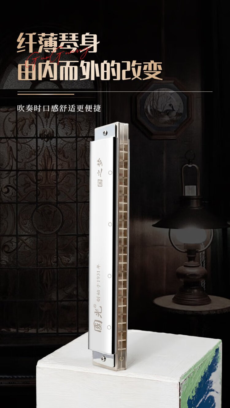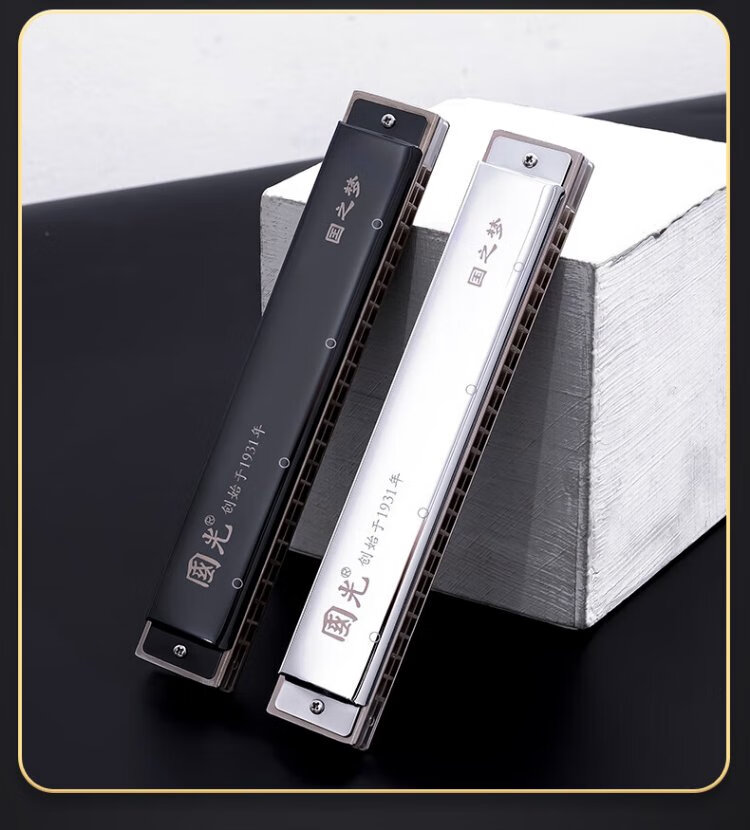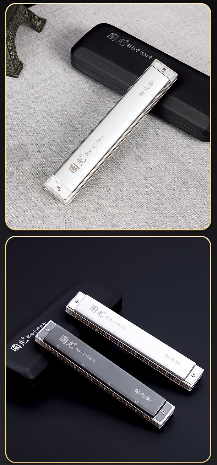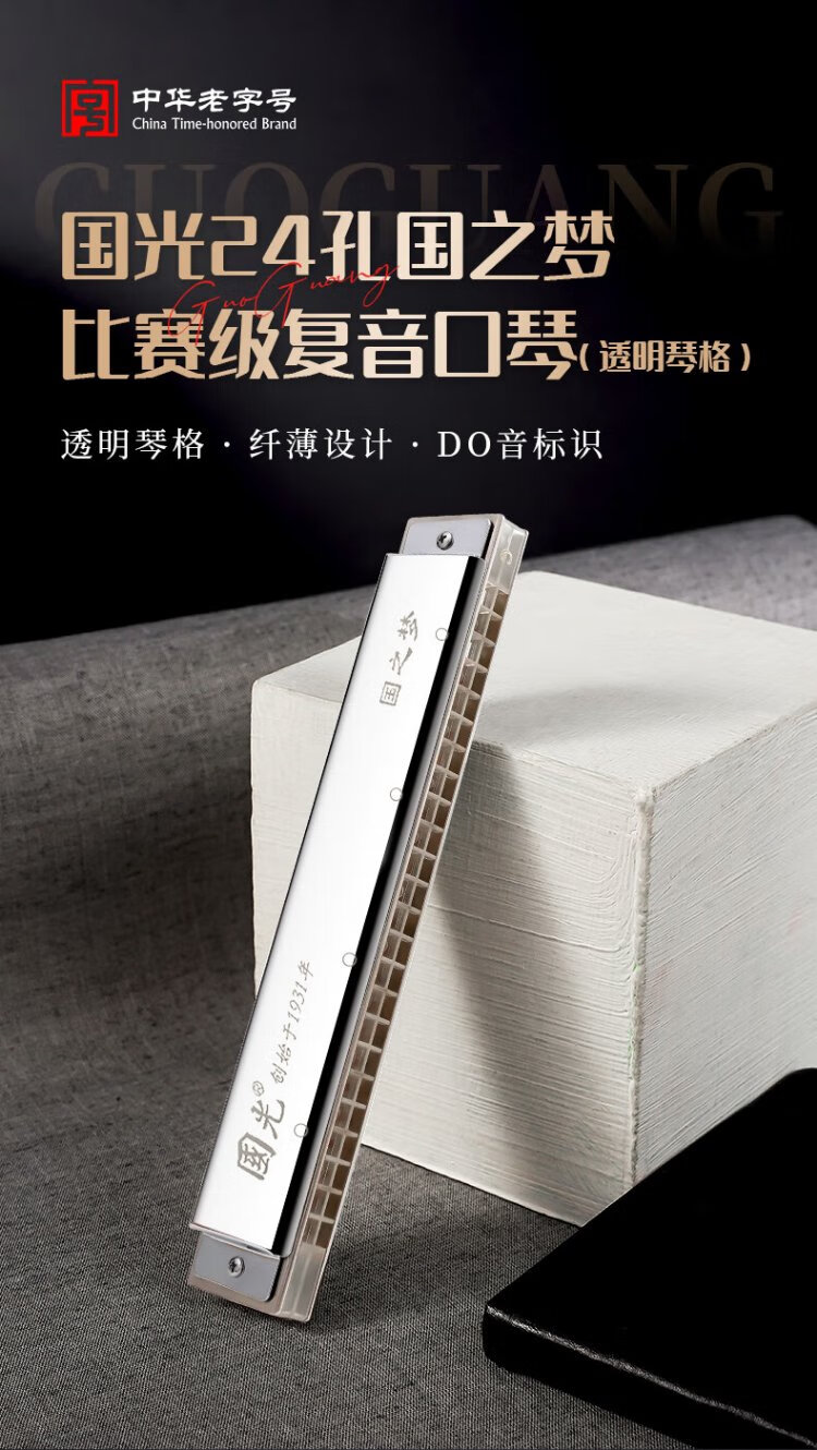 Guoguang 24-hole Guozhimeng competition-grade advanced polyphonic C-key streamer silver harmonica (transparent fret, with teaching materials)