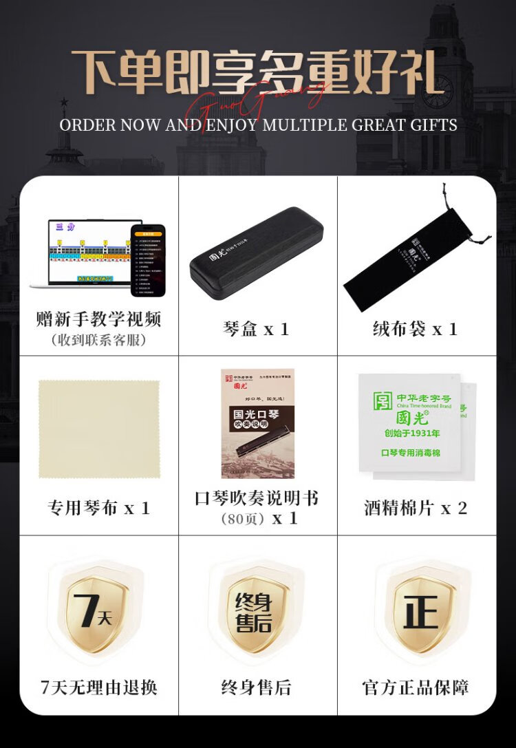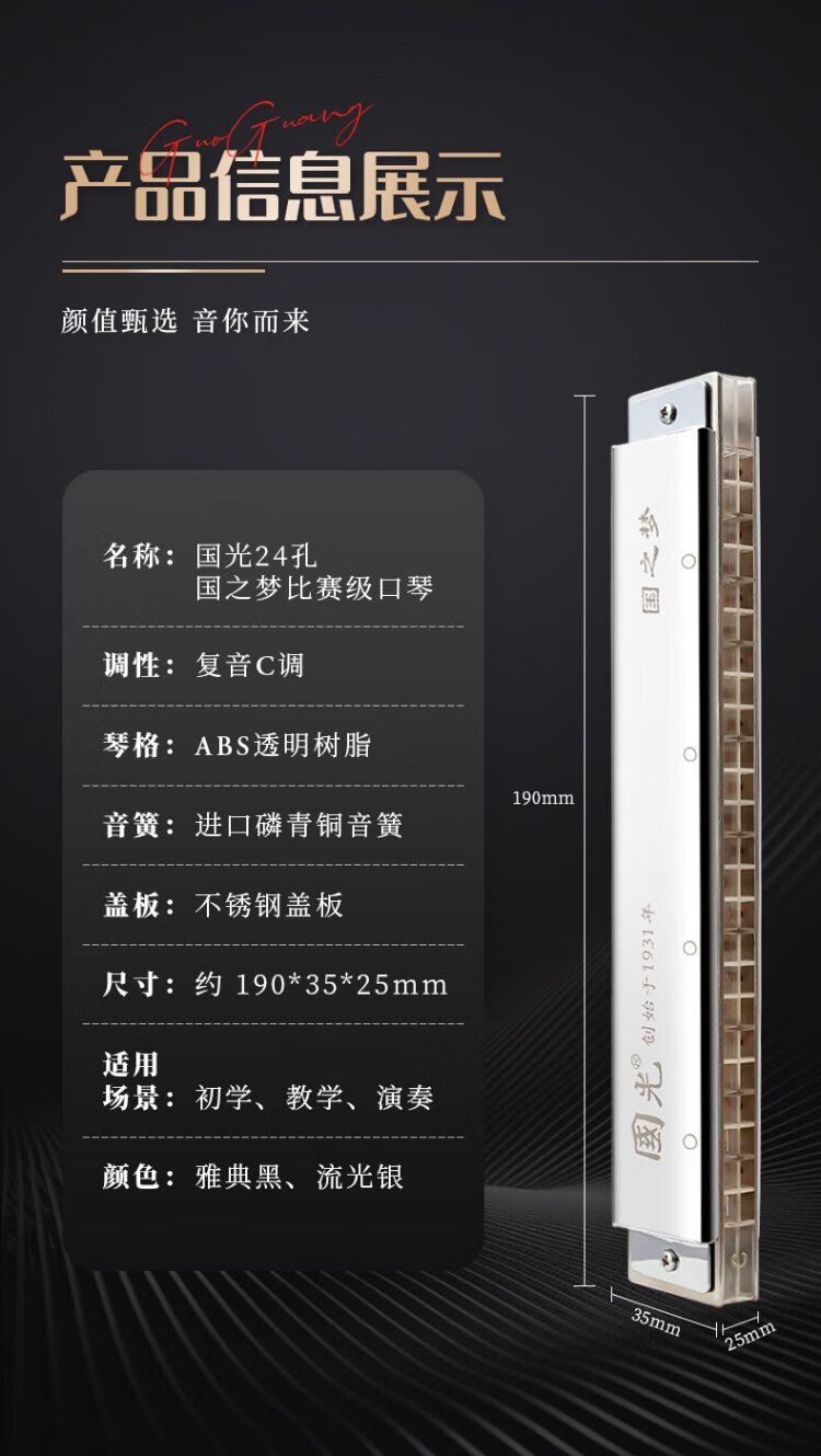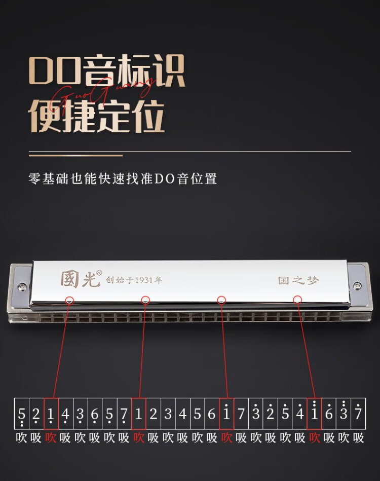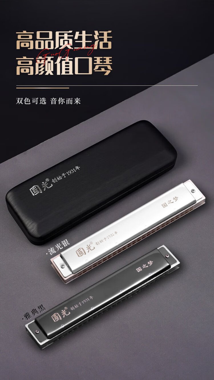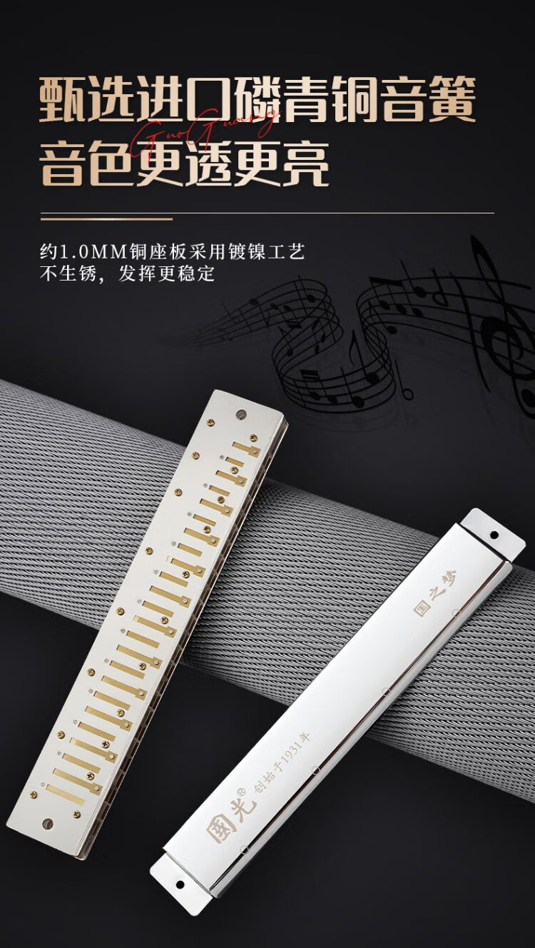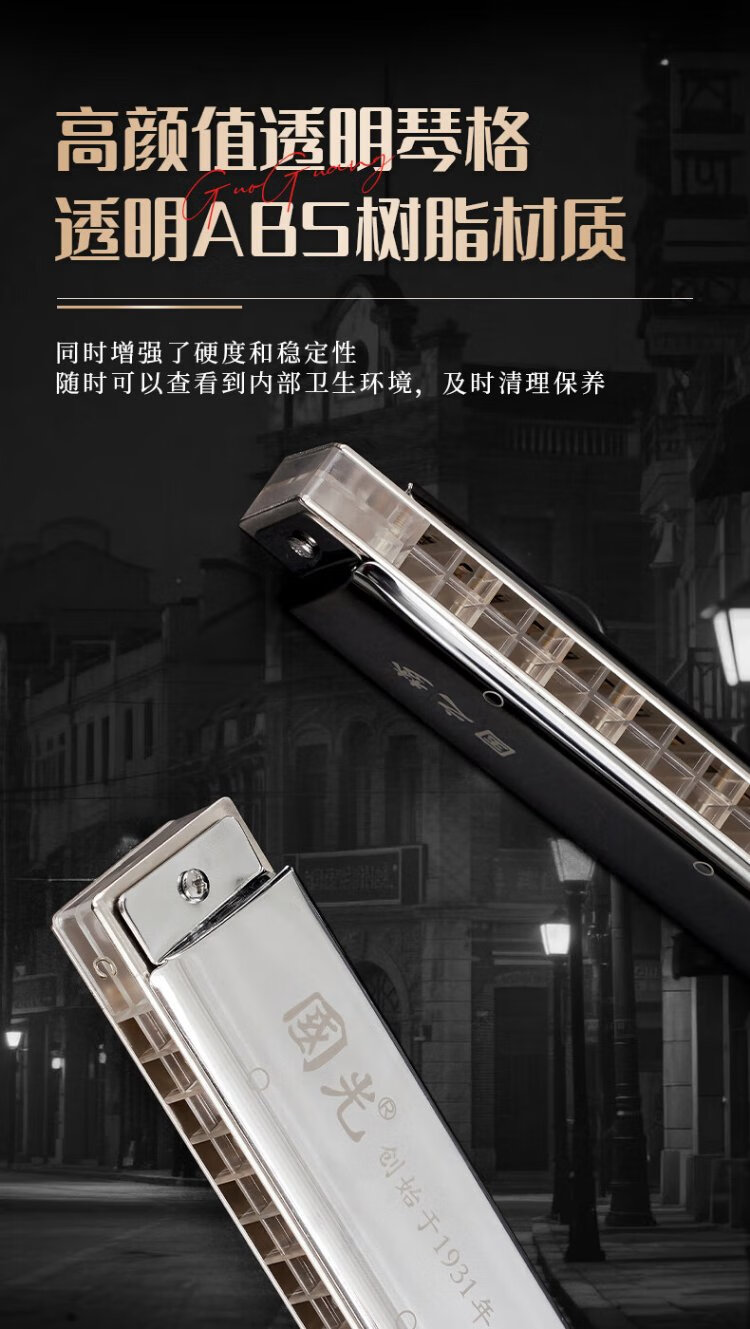 Guoguang 24-hole Guozhimeng competition-grade advanced polyphonic C-key streamer silver harmonica (transparent fret, with teaching materials)