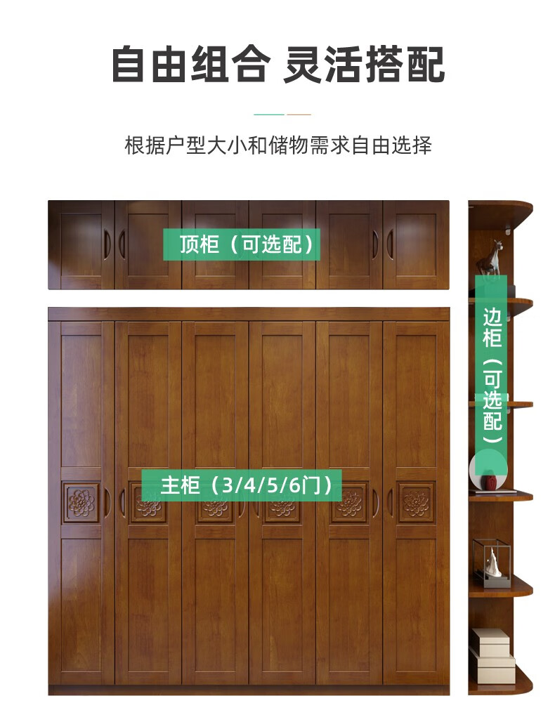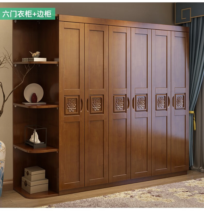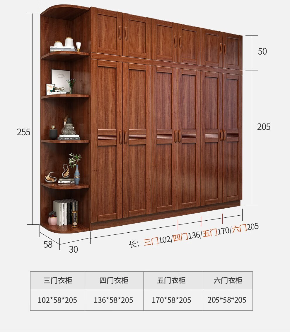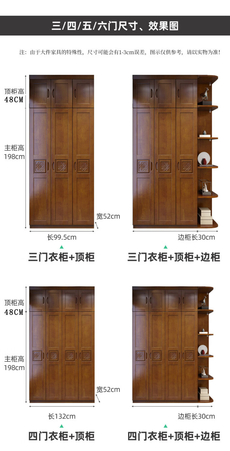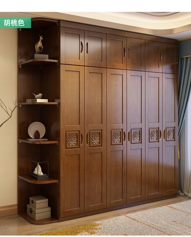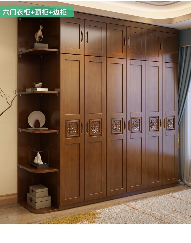 Millennium Shengshi Wardrobe Solid Wood Wardrobe Bedroom Simple Modern Chinese Style Multi-Door Combination Large Wardrobe Wooden Assembly Furniture Walnut Color Without Top Three Doors