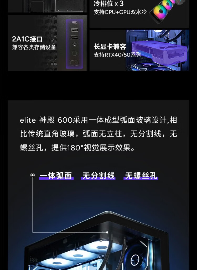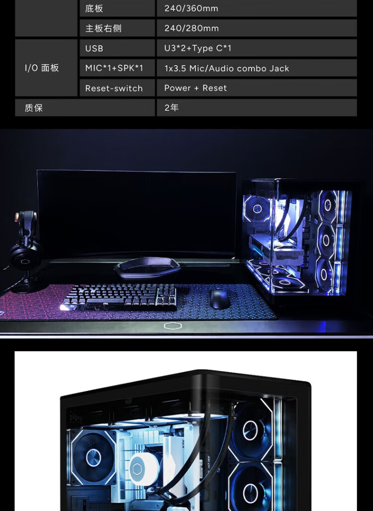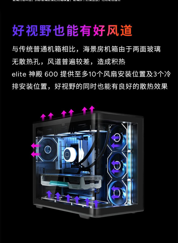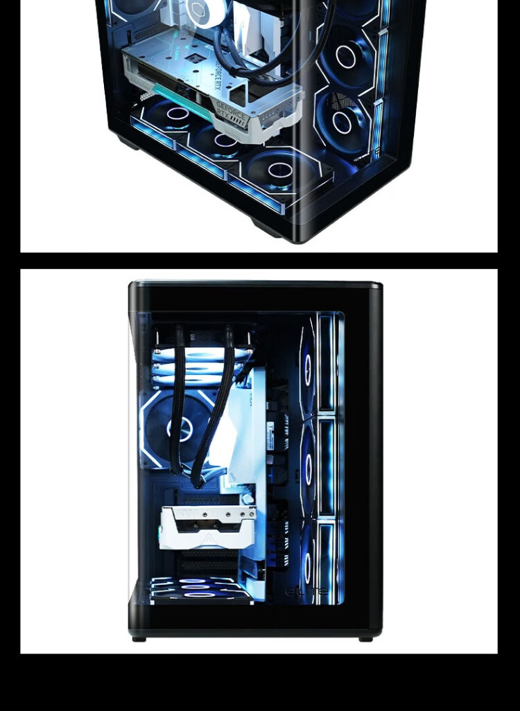 95% new CoolerMaster elite Temple 600 black ATX ocean view case integrated curved glass no columns/supports 360 water cooling/Type-c