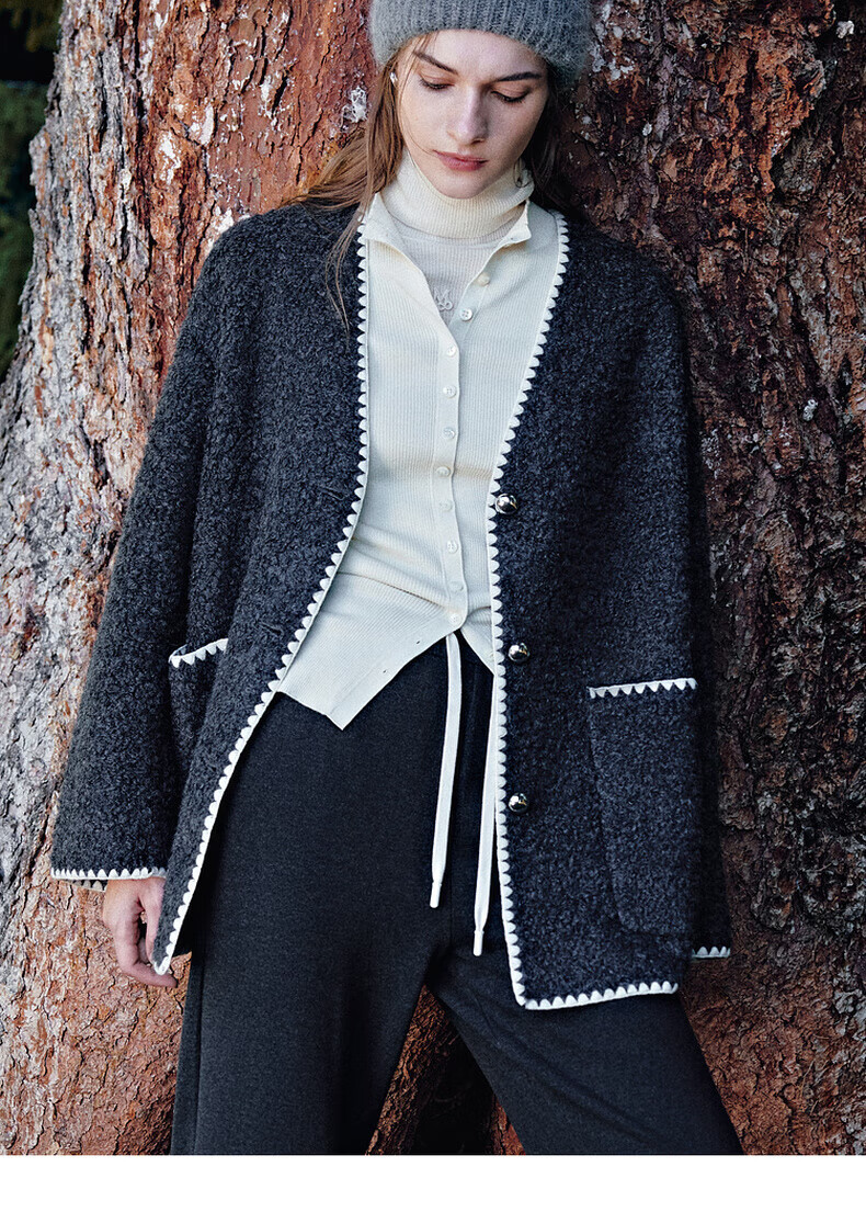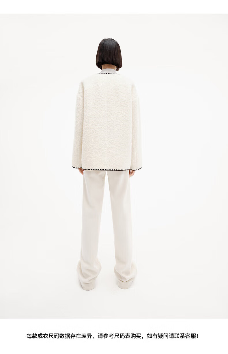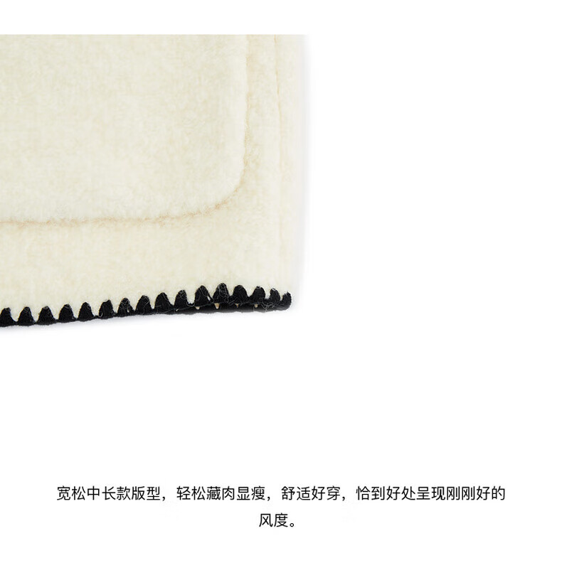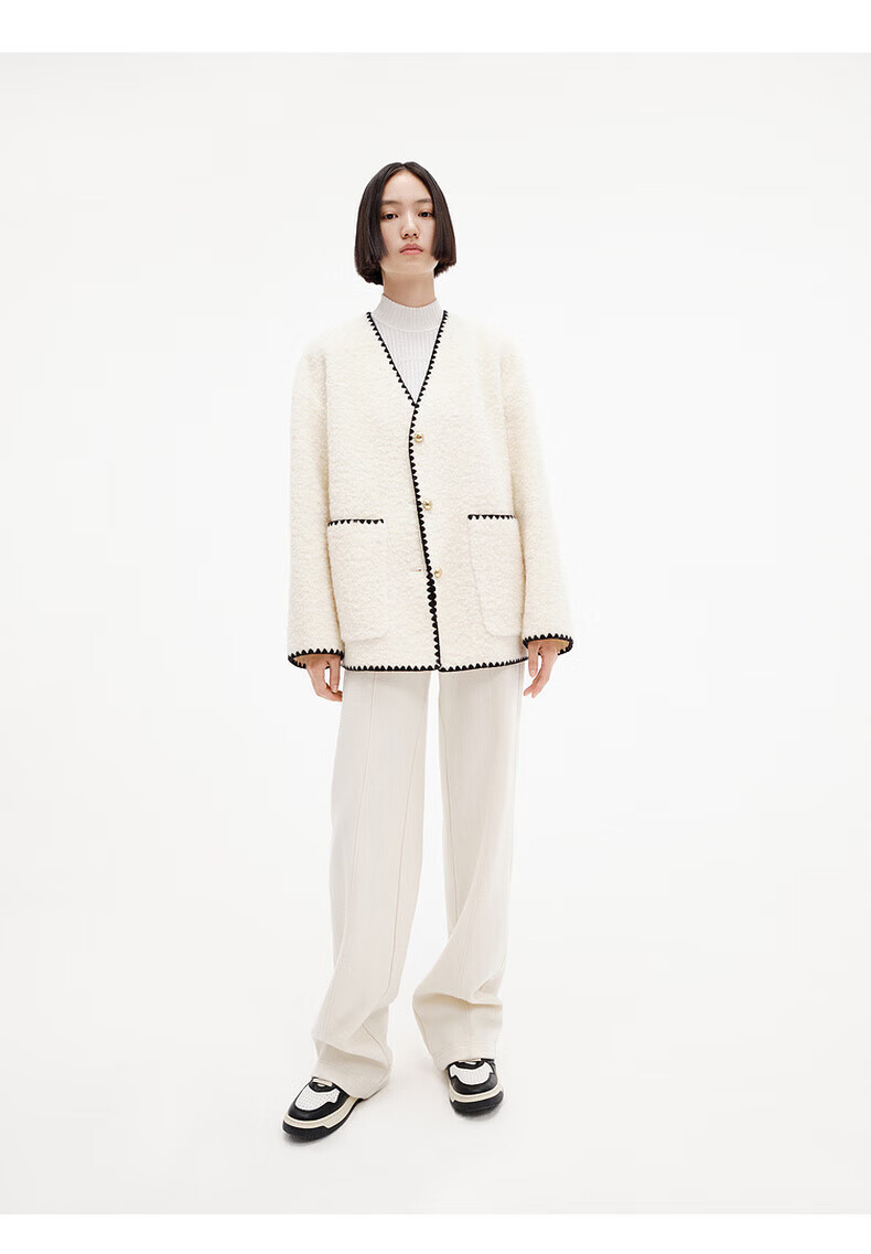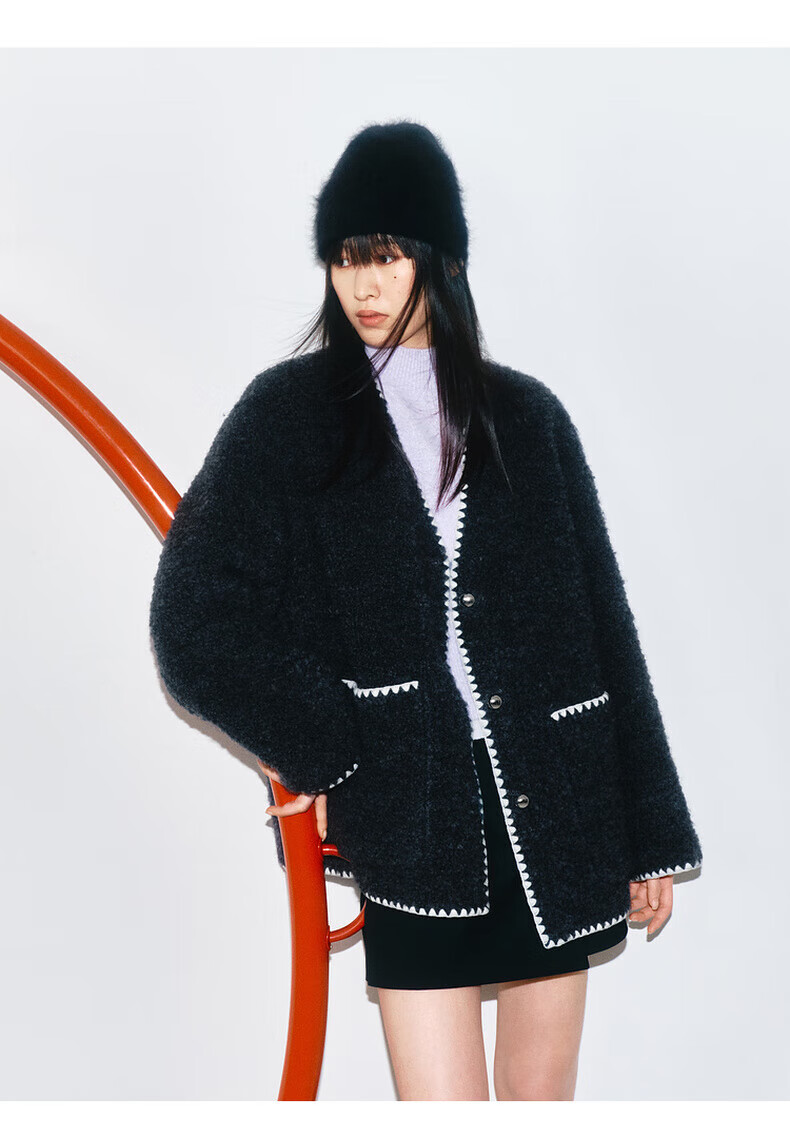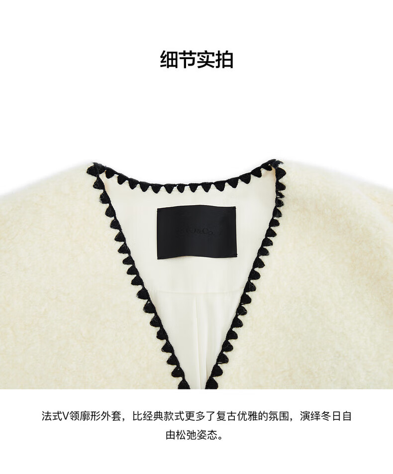 MO&Co. Black and white contrasting V-neck loose mid-length wool coat French women's style