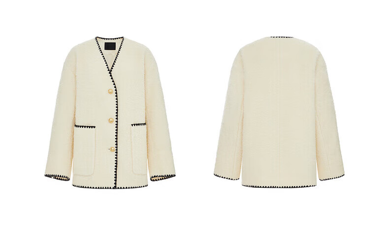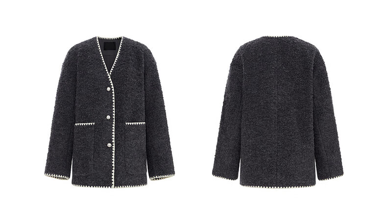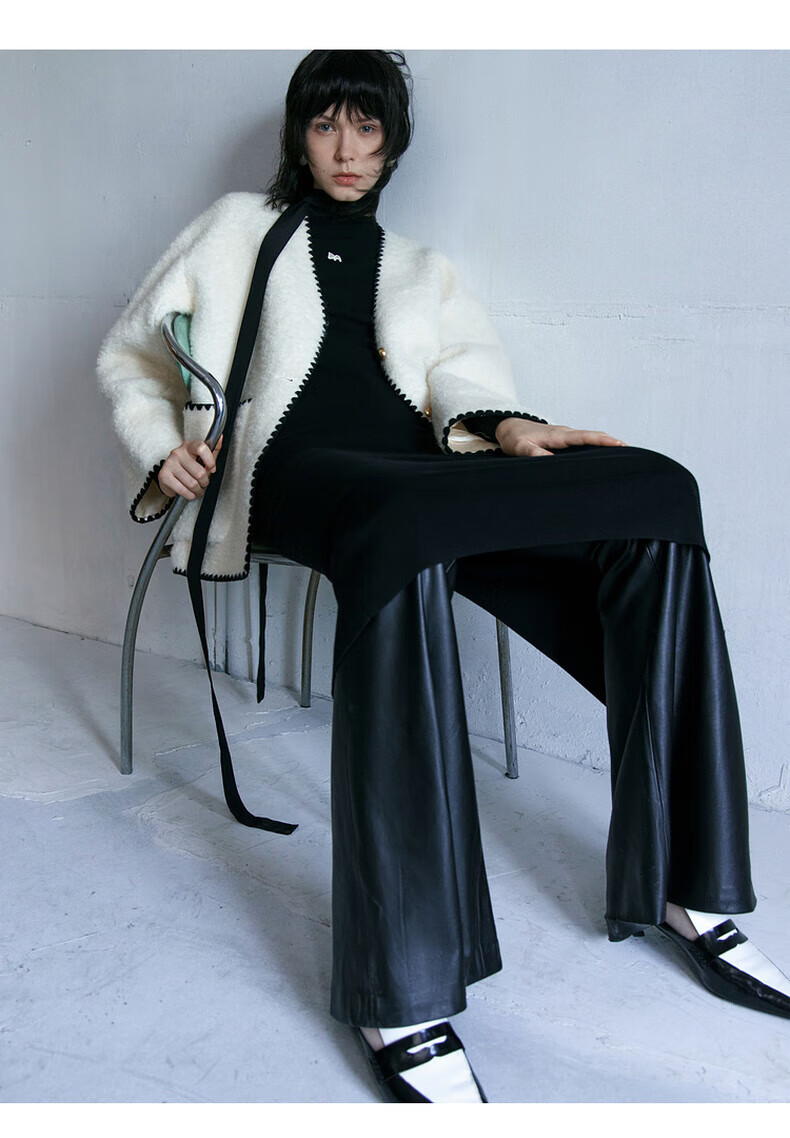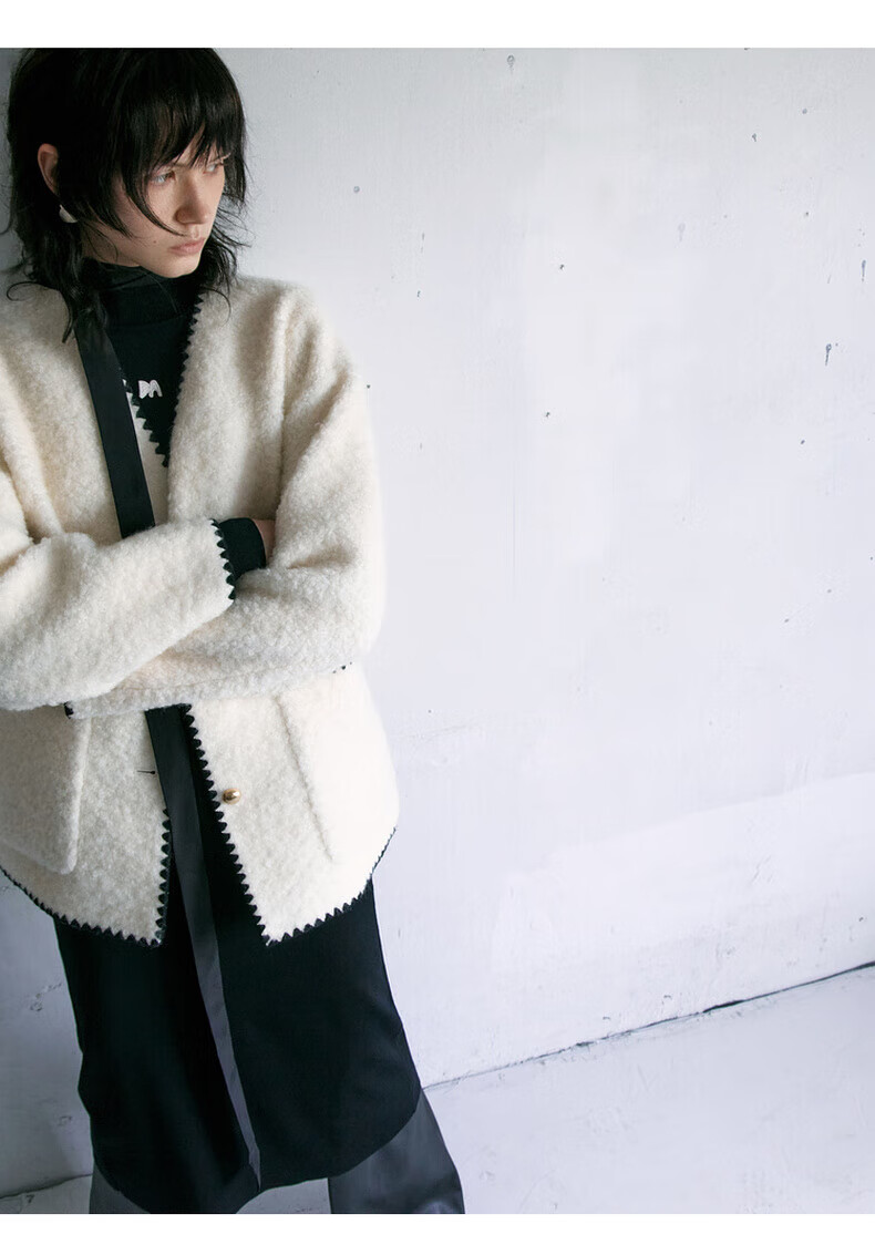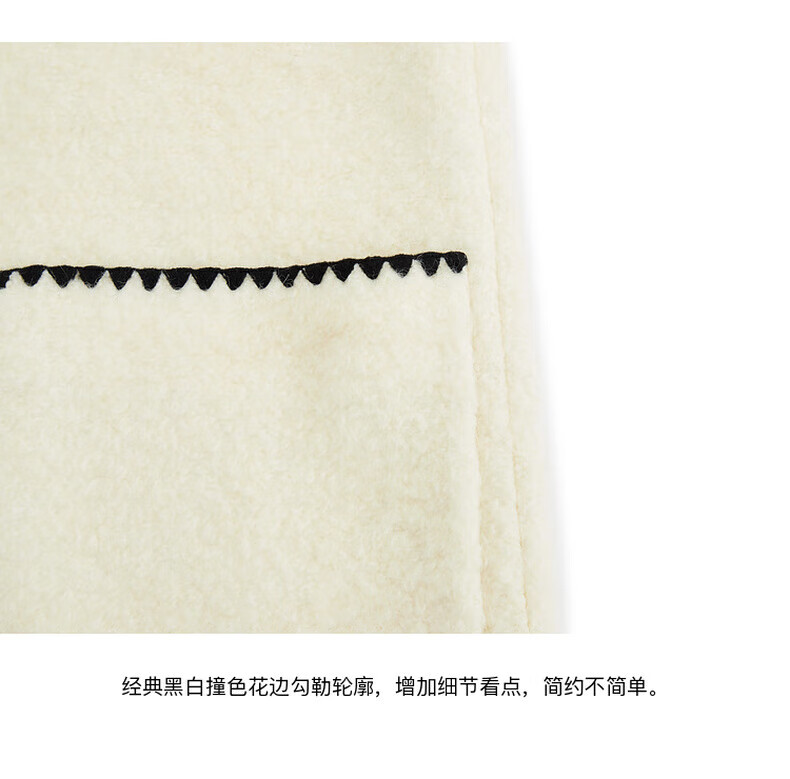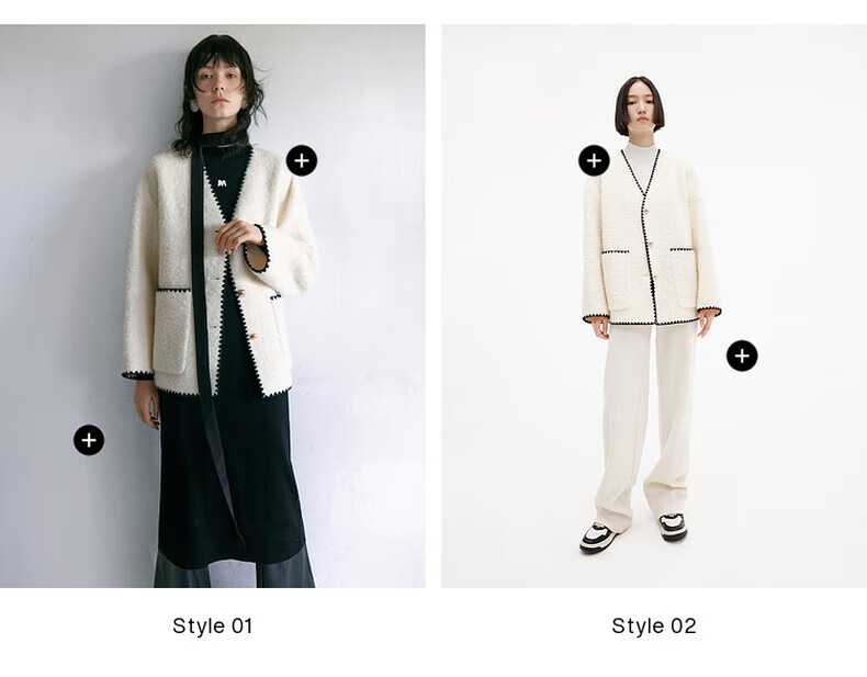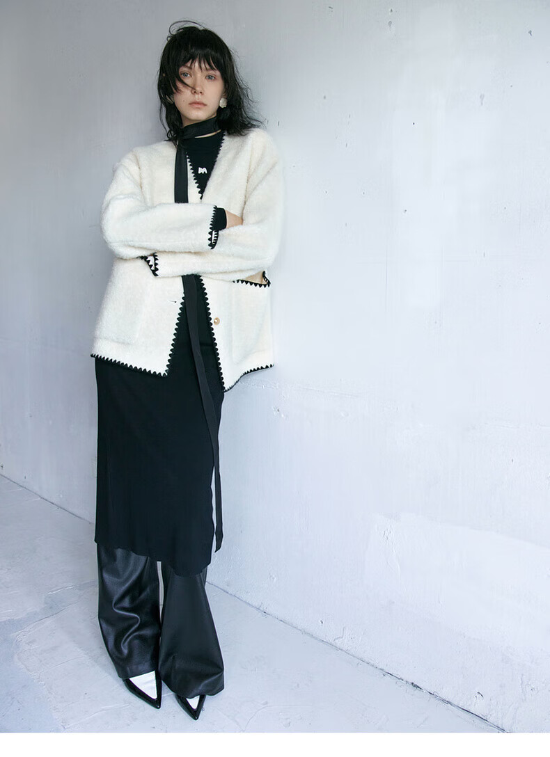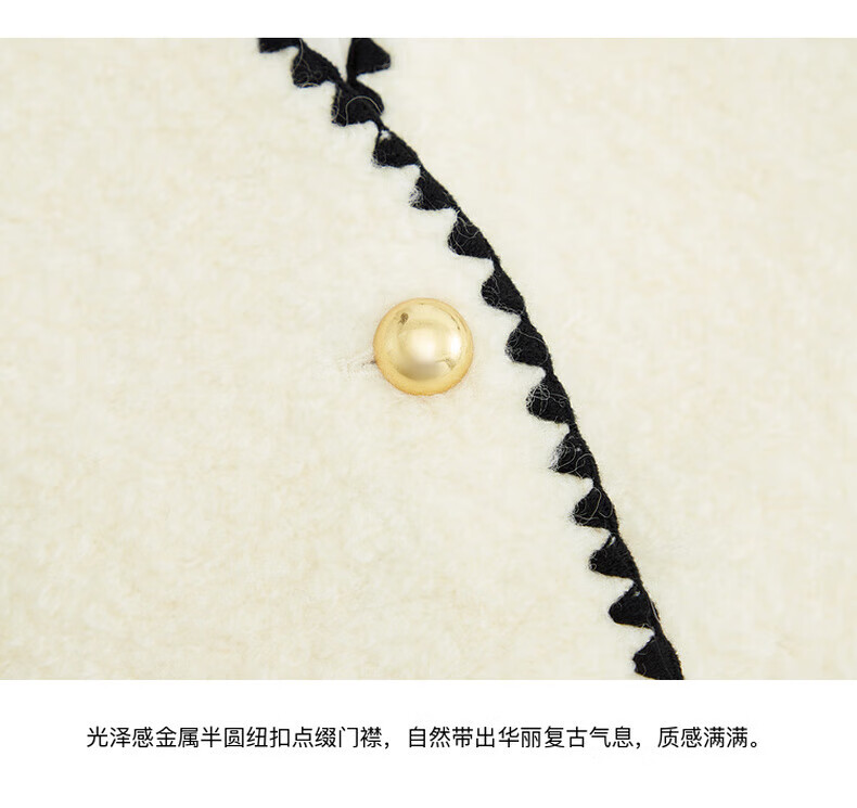 MO&Co. Black and white contrasting V-neck loose mid-length wool coat French women's style
