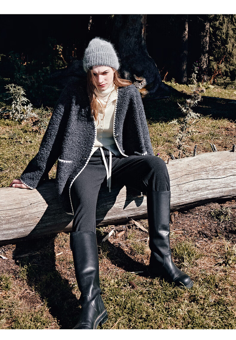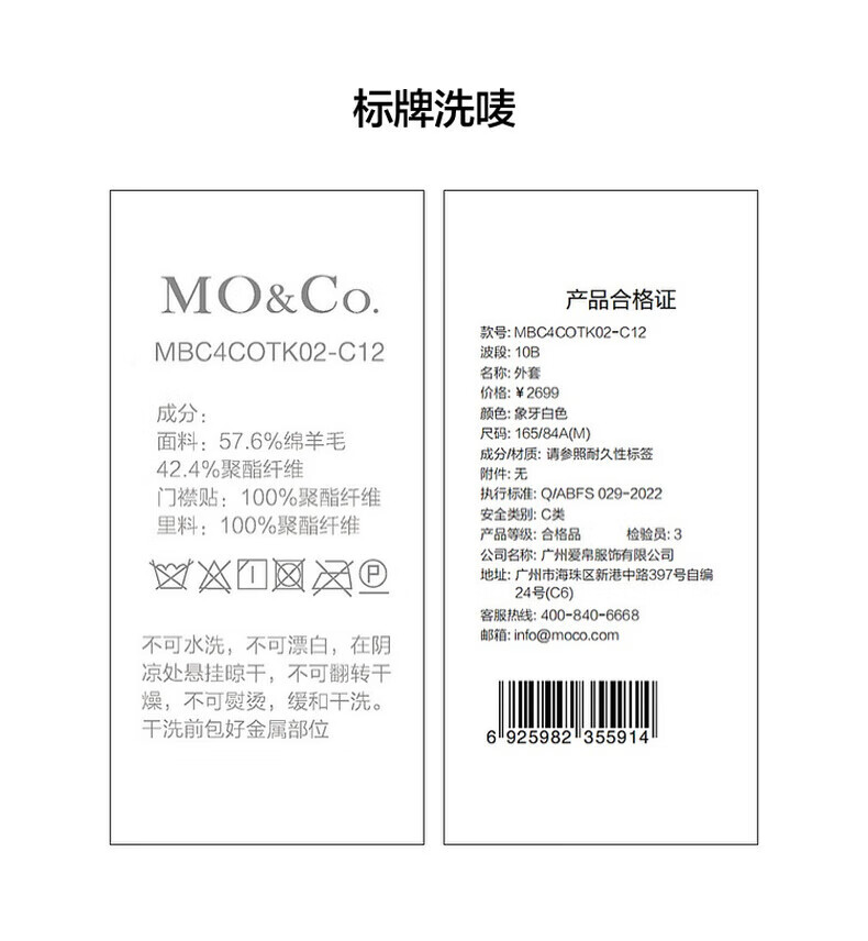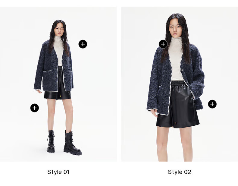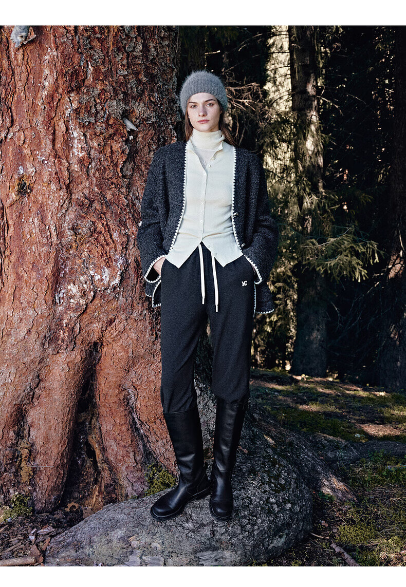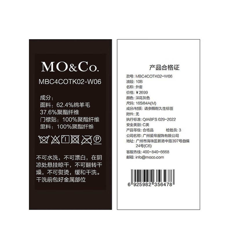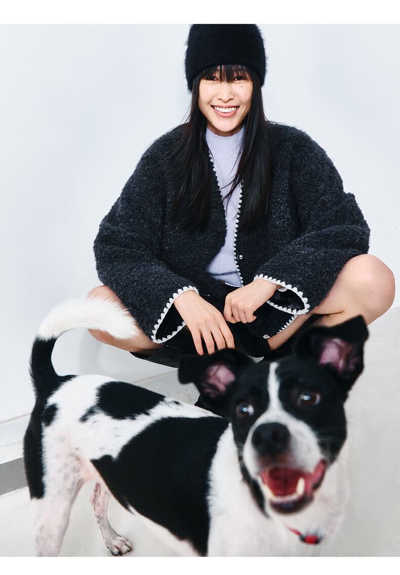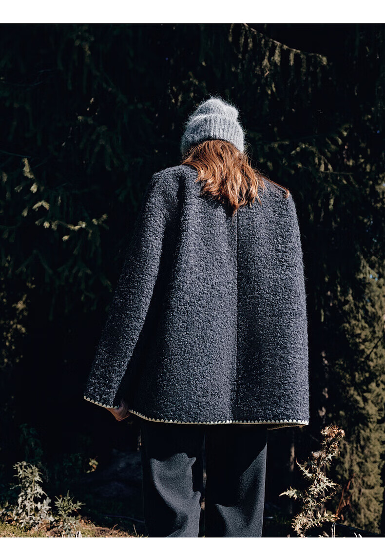 MO&Co. Black and white contrasting V-neck loose mid-length wool coat French women's style