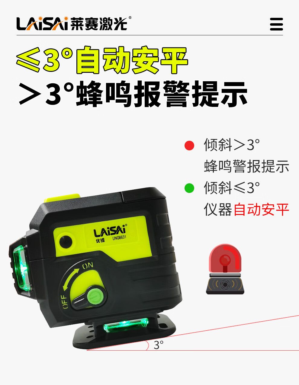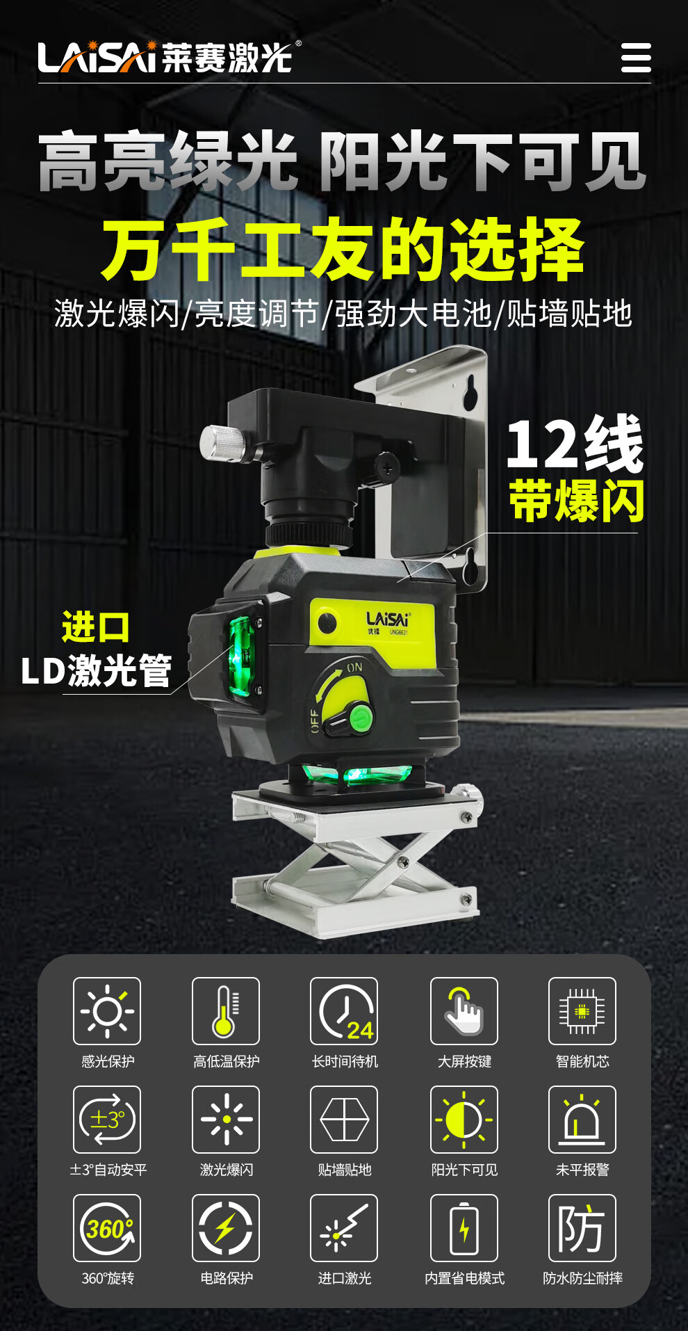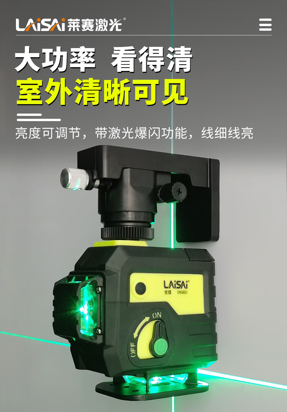 莱赛激光 莱赛红外线水平仪蓝光绿光12线贴墙贴地仪优镭6631强光高精度 12线双小锂电,贴墙贴地UNG6631