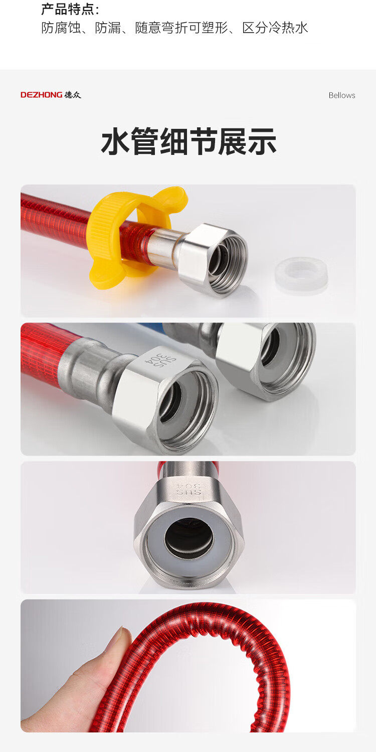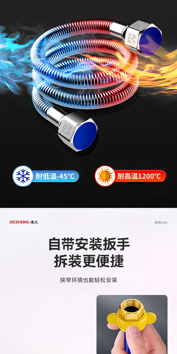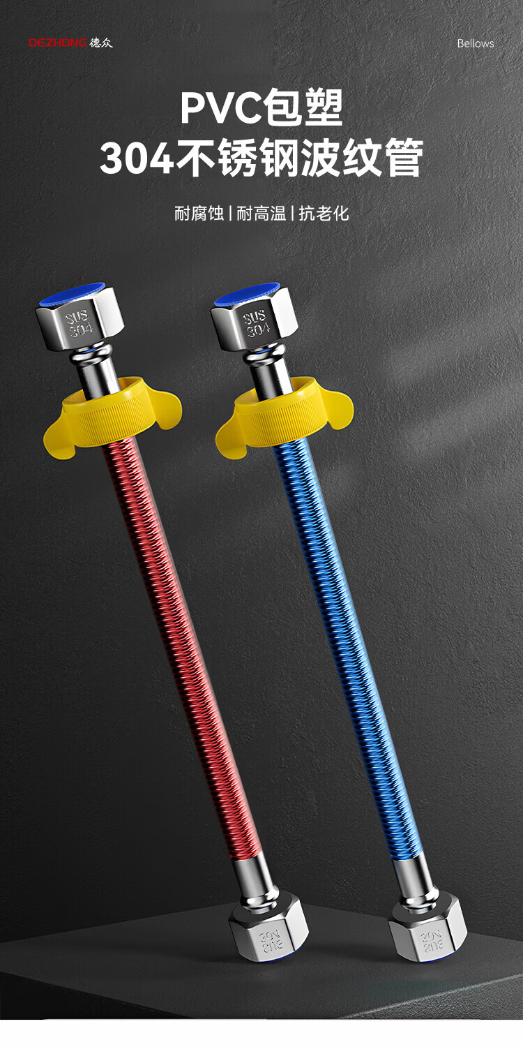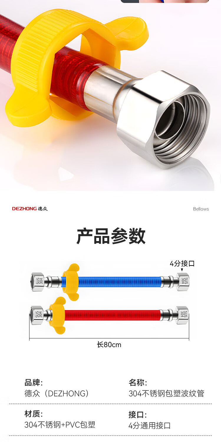 Dezhong 304 stainless steel corrugated pipe, special for water heater corrugated pipe, 4-point interface explosion-proof and leak-proof, gas water heater inlet pipe, thickened pressure-resistant faucet hot and cold water pipe 80cm, 2 pieces