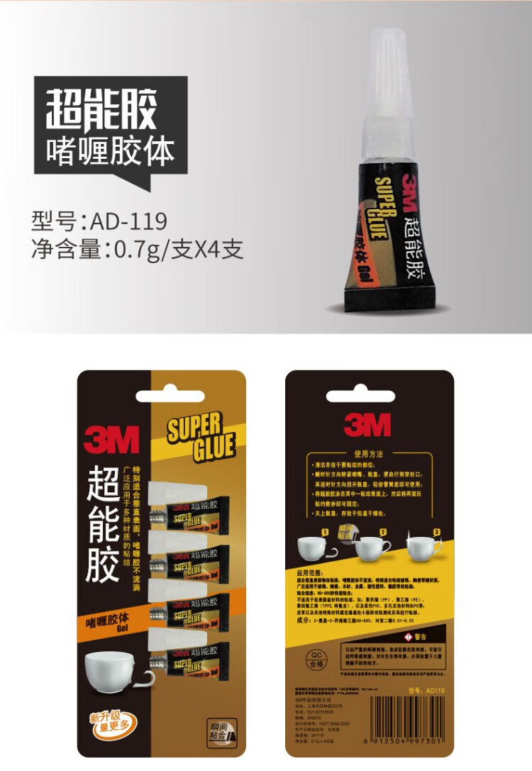3M glue strong quick-drying glue glass ceramic wood metal plastic rubber bonding quick-drying glue AD119 transparent gel quick-drying glue 0.7G/piece*4
