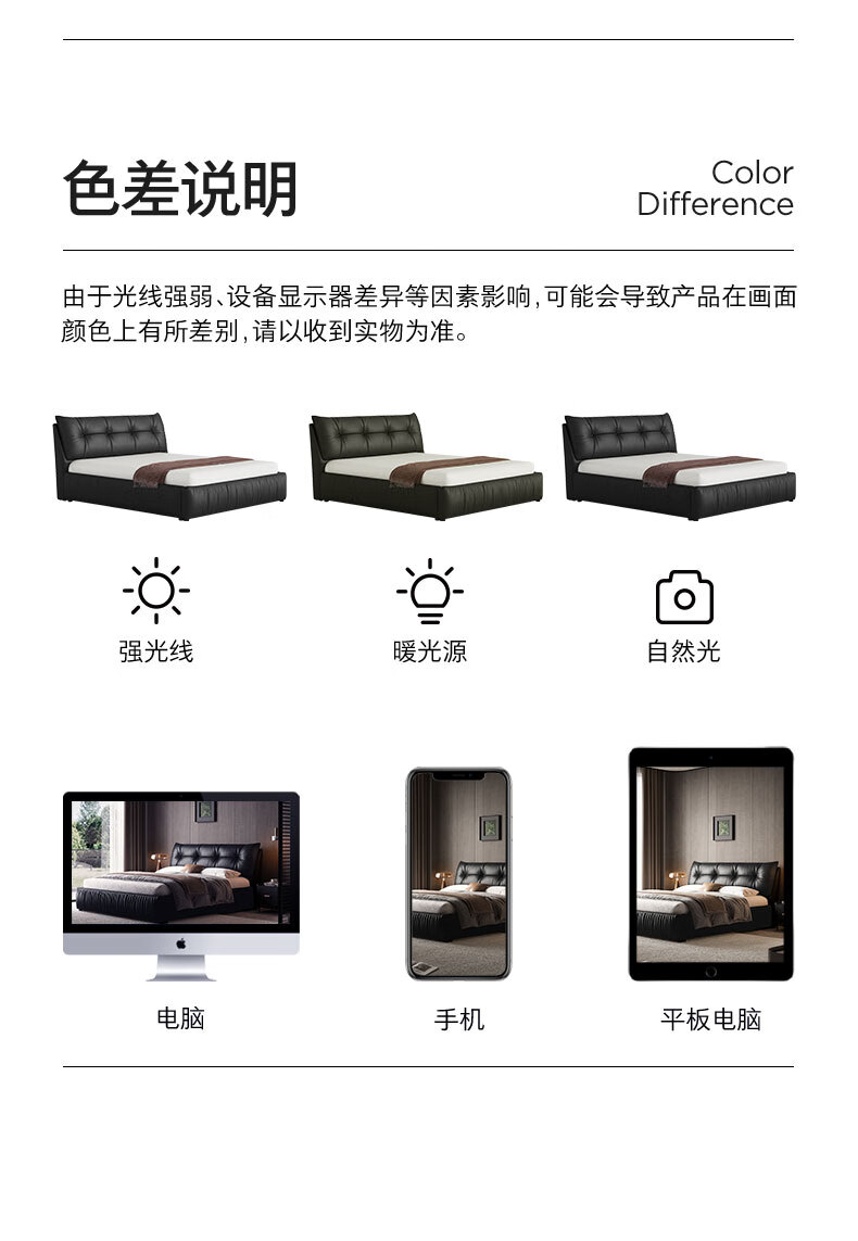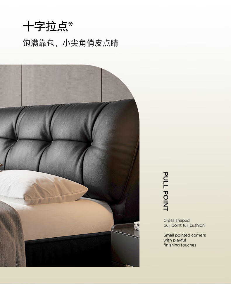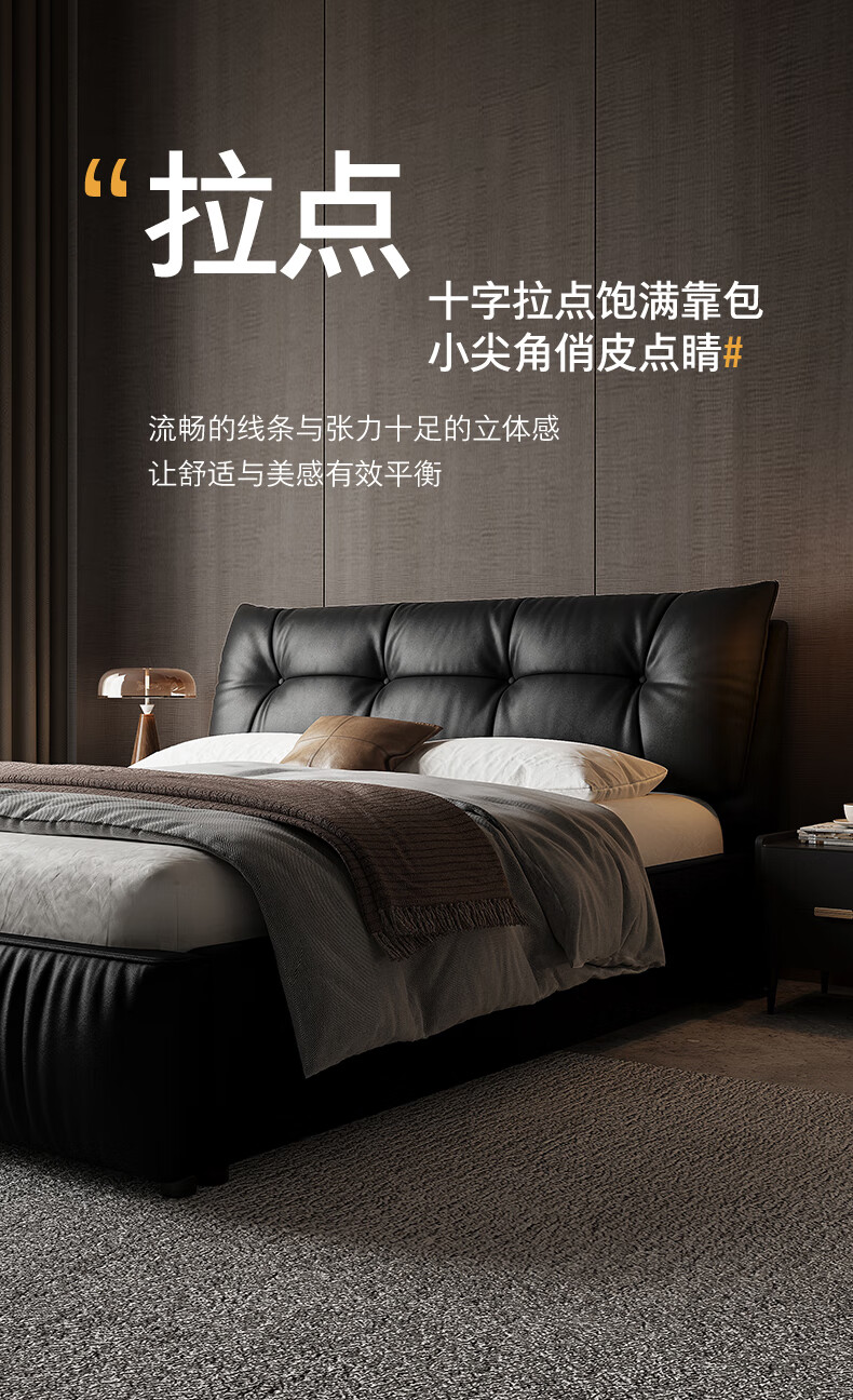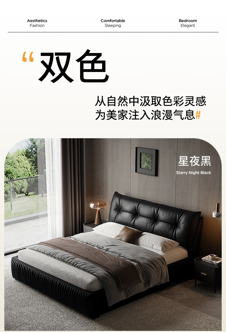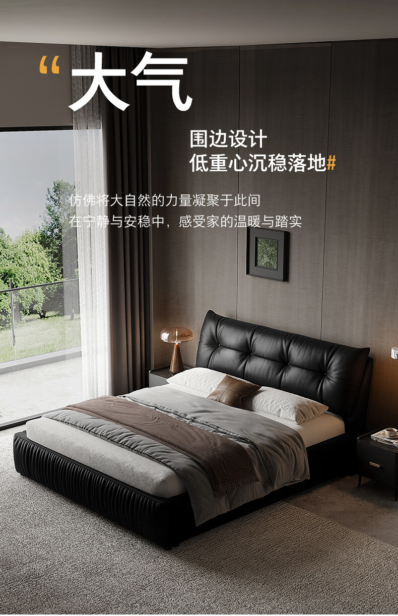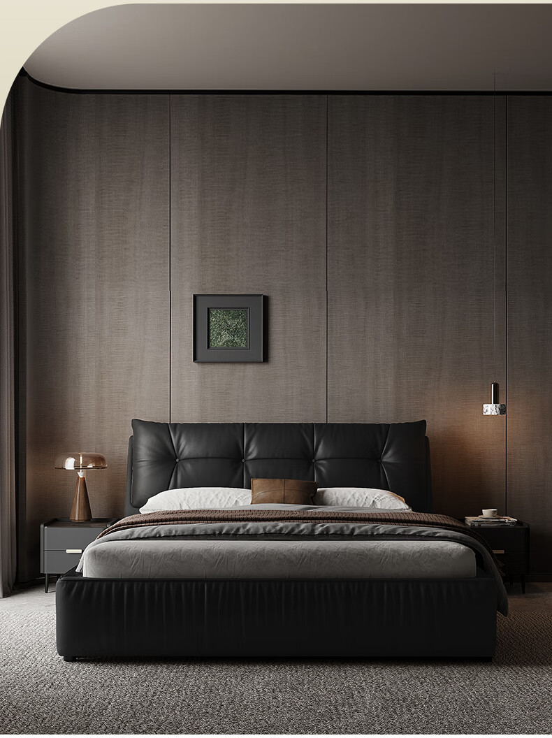KUKA Italian style light luxury floor-standing first-layer cowhide bed, starry night black, edge feathers 1.8*2.0M