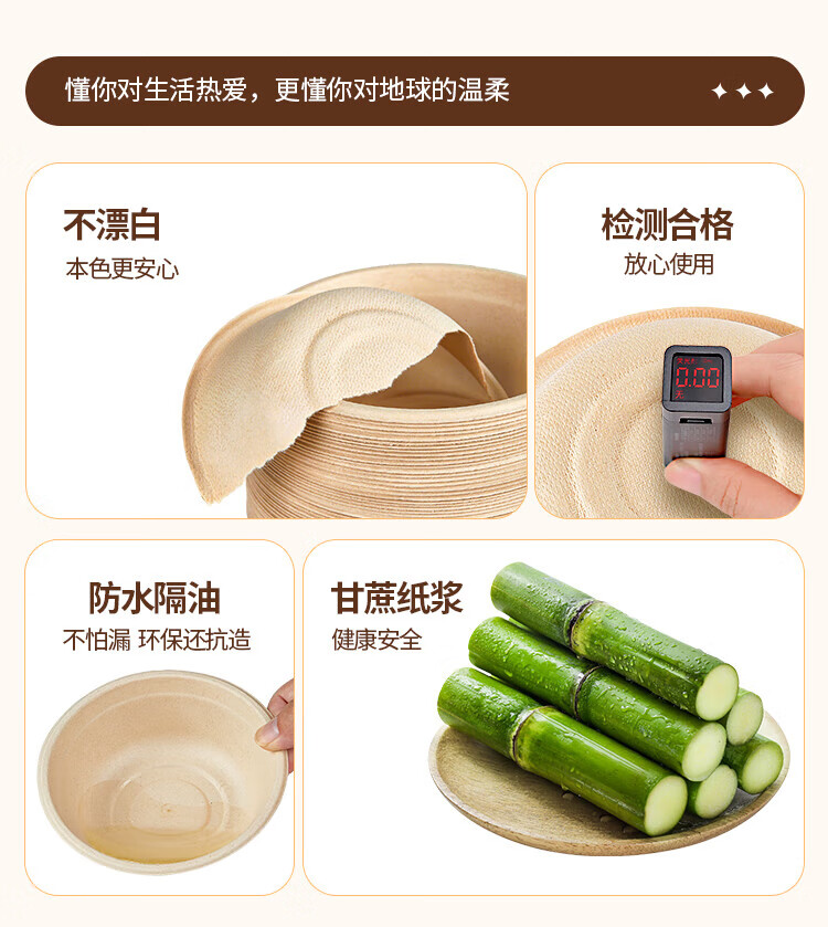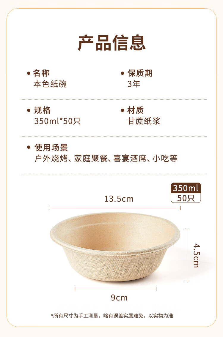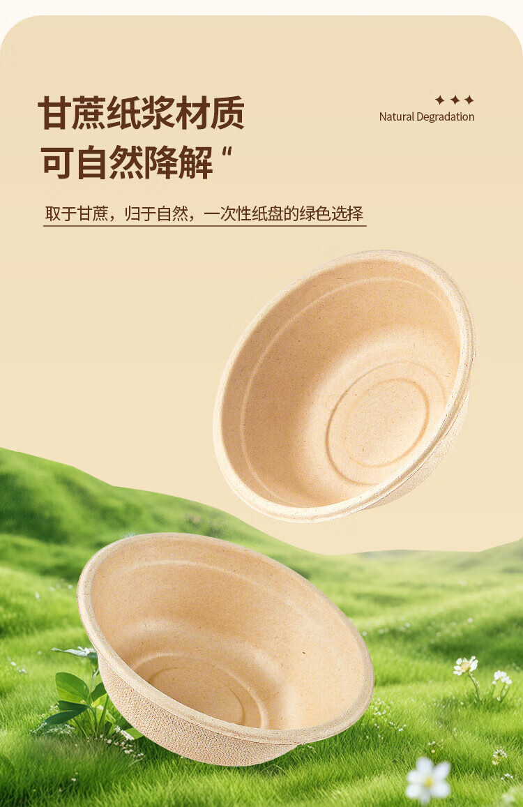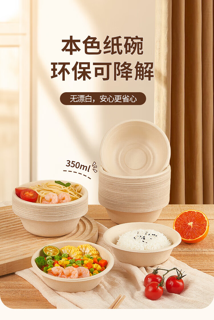 Youao sugarcane pulp paper plate and paper bowl disposable tableware waterproof and oil-proof natural color degradable paper bowl 350ml*50 pieces