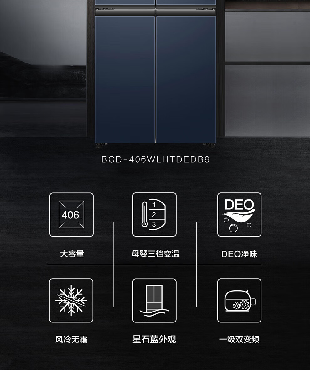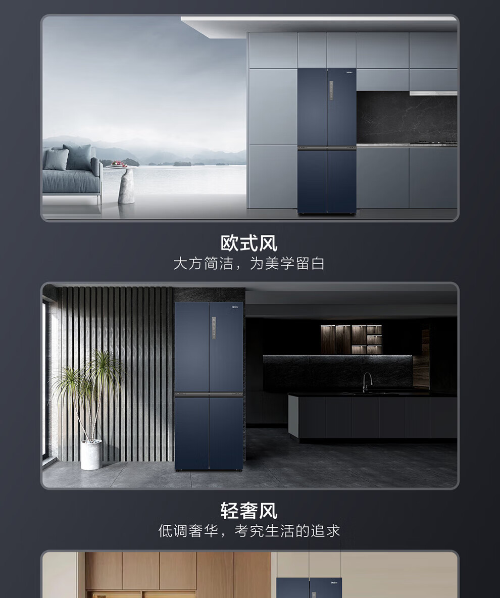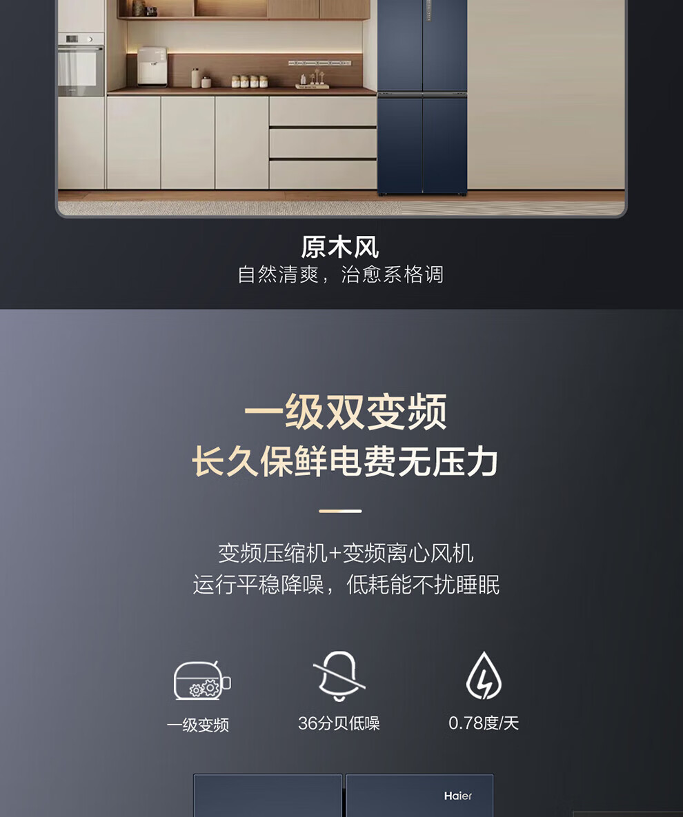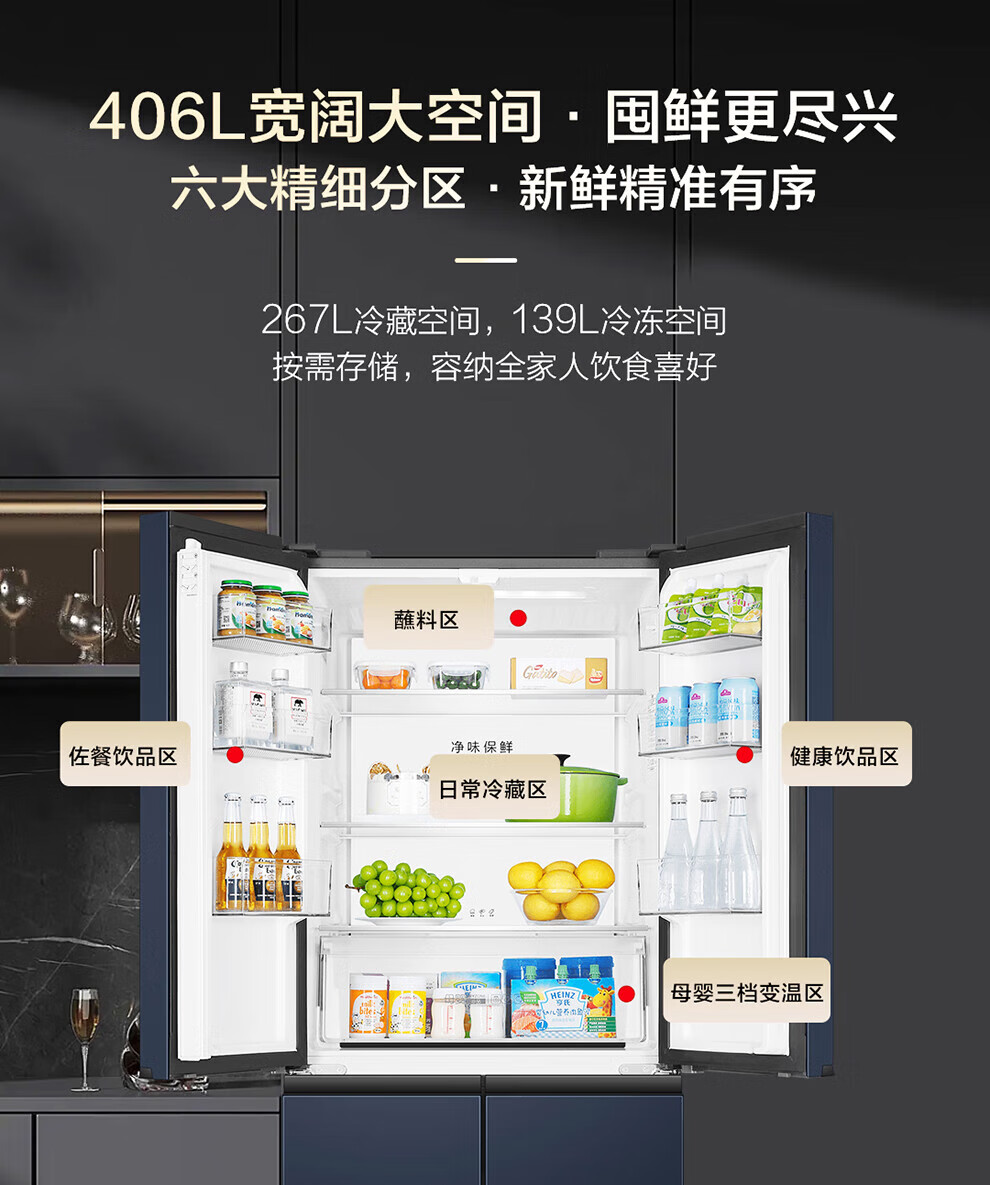 Haier refrigerator four-door cross-double door 406 liters frequency conversion energy-saving new level energy efficiency air-cooled frost-free ultra-thin household fresh pie series refrigerator trade-in subsidy high appearance 406 liters + clean taste and freshness + maternal and child space