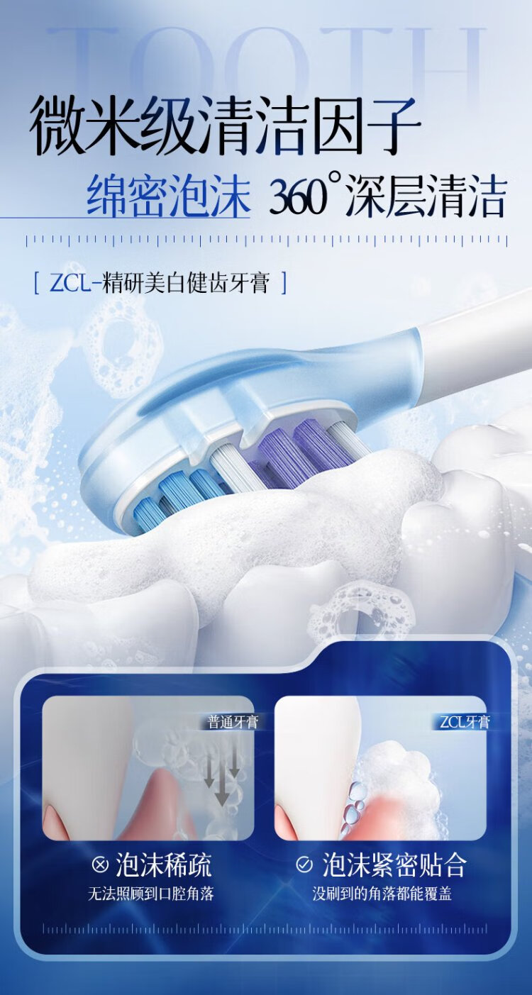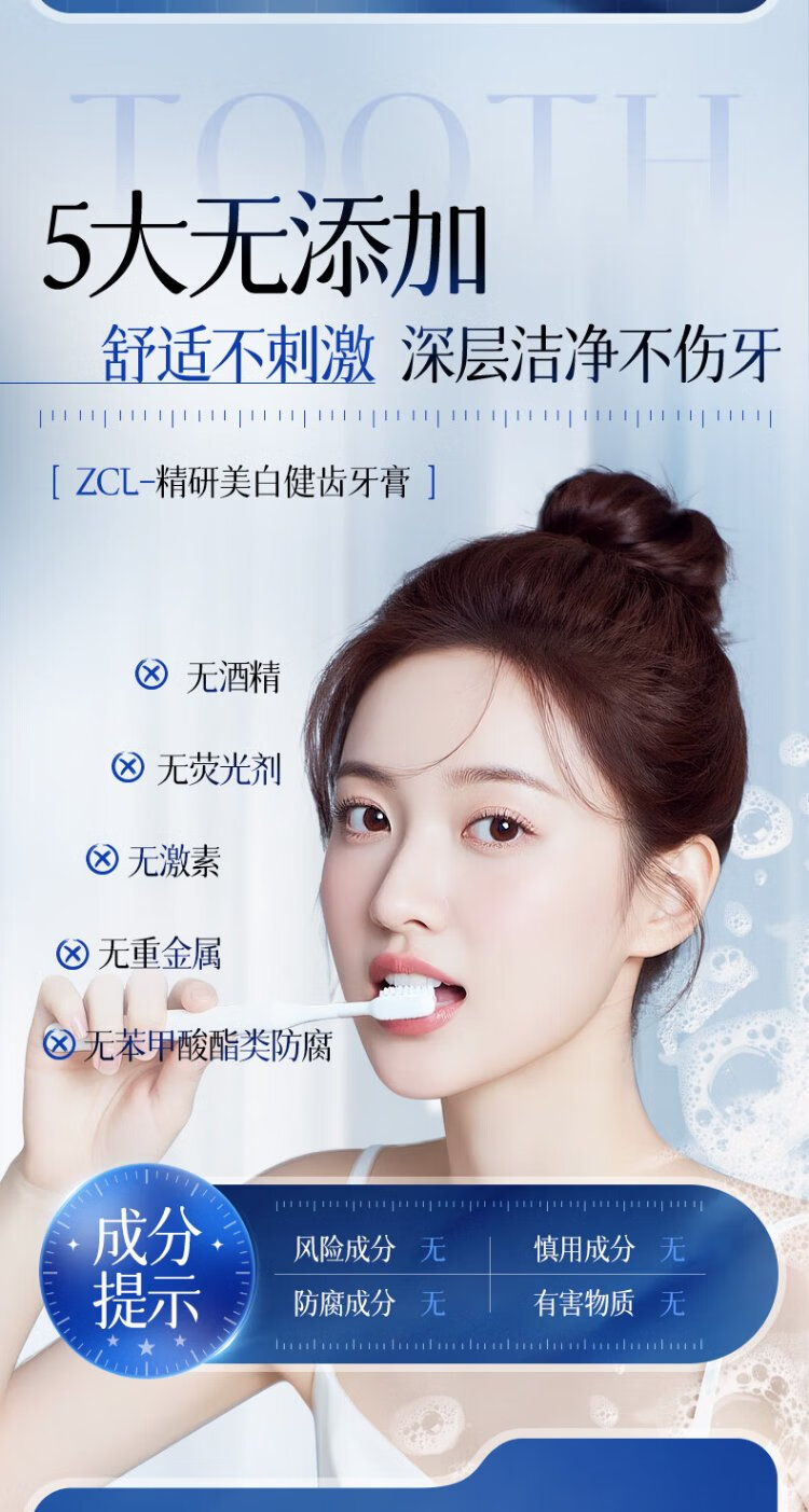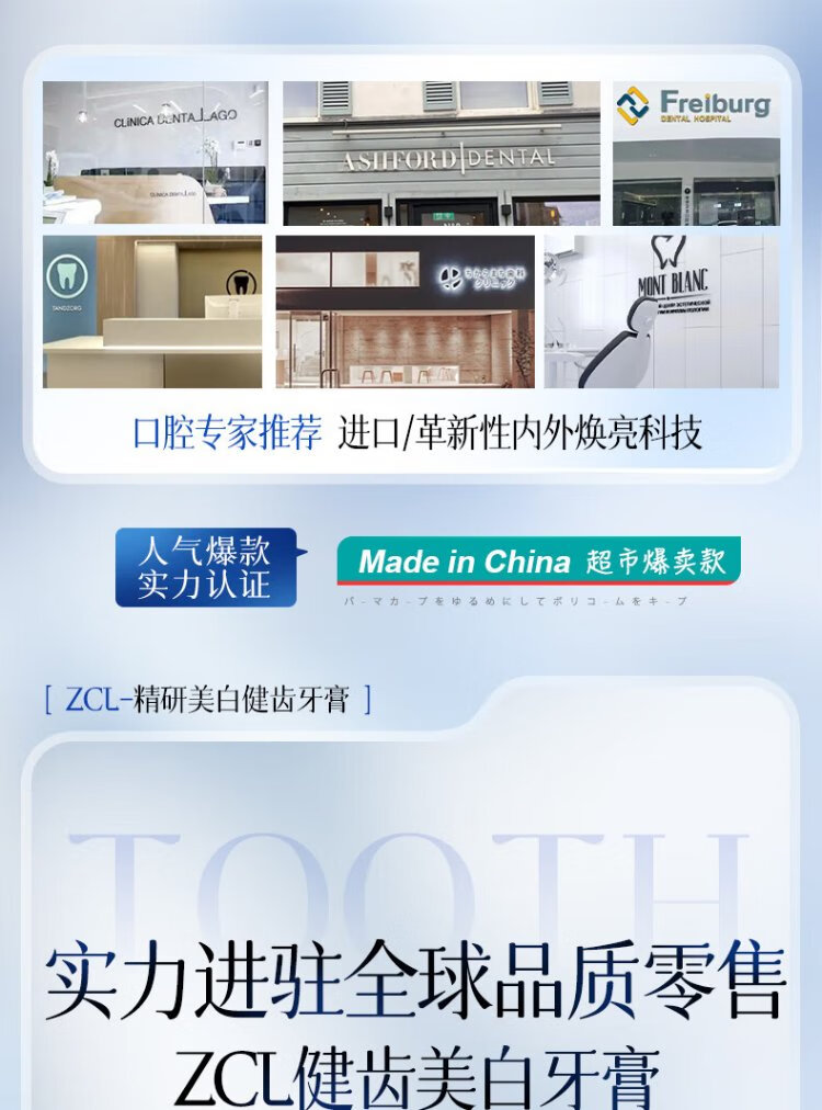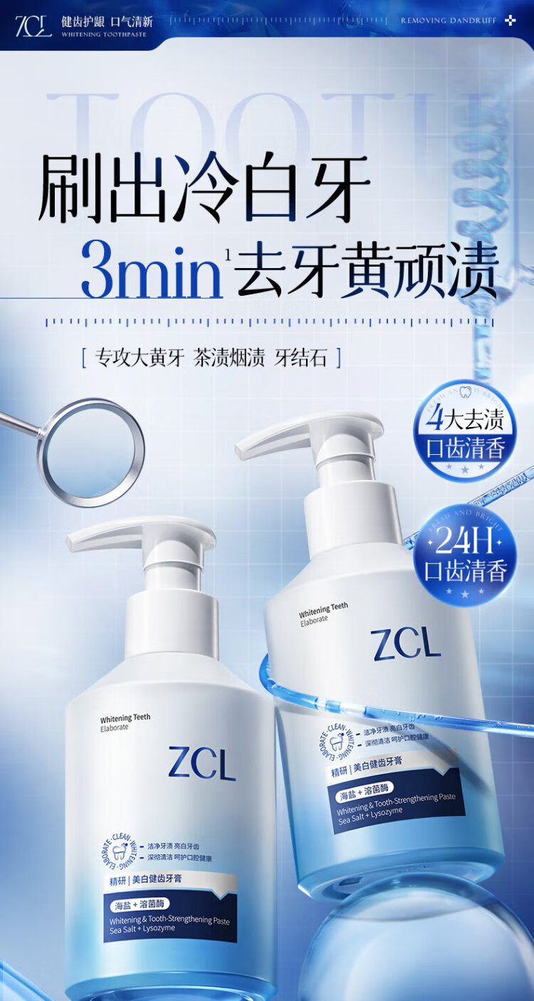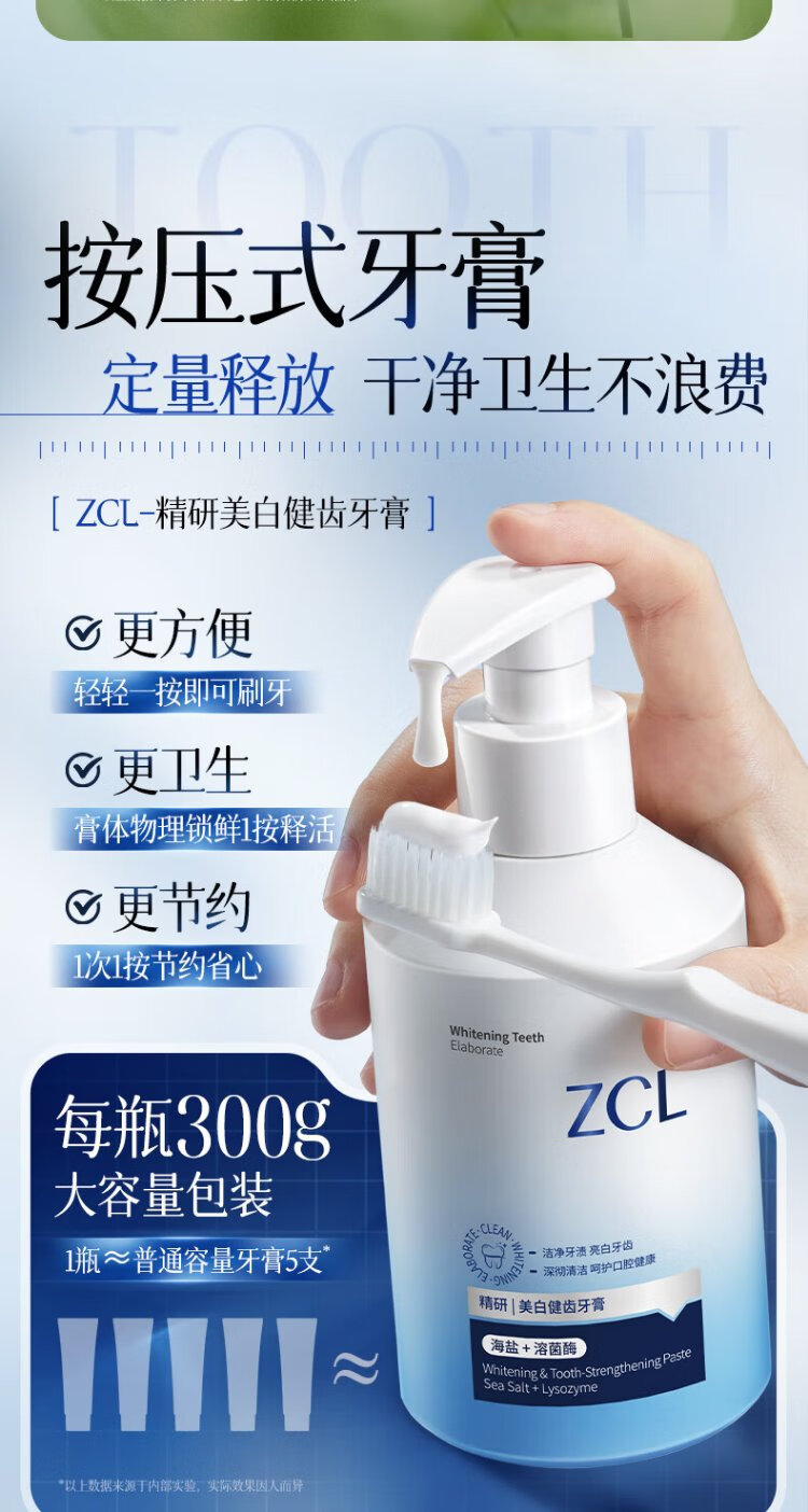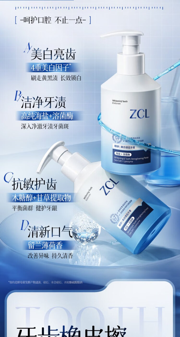 ZCL toothpaste whitens teeth, whitens teeth, inhibits bacteria, removes bad breath, freshens breath, protects gums, removes yellowing, removes tooth stains, and tartar for children