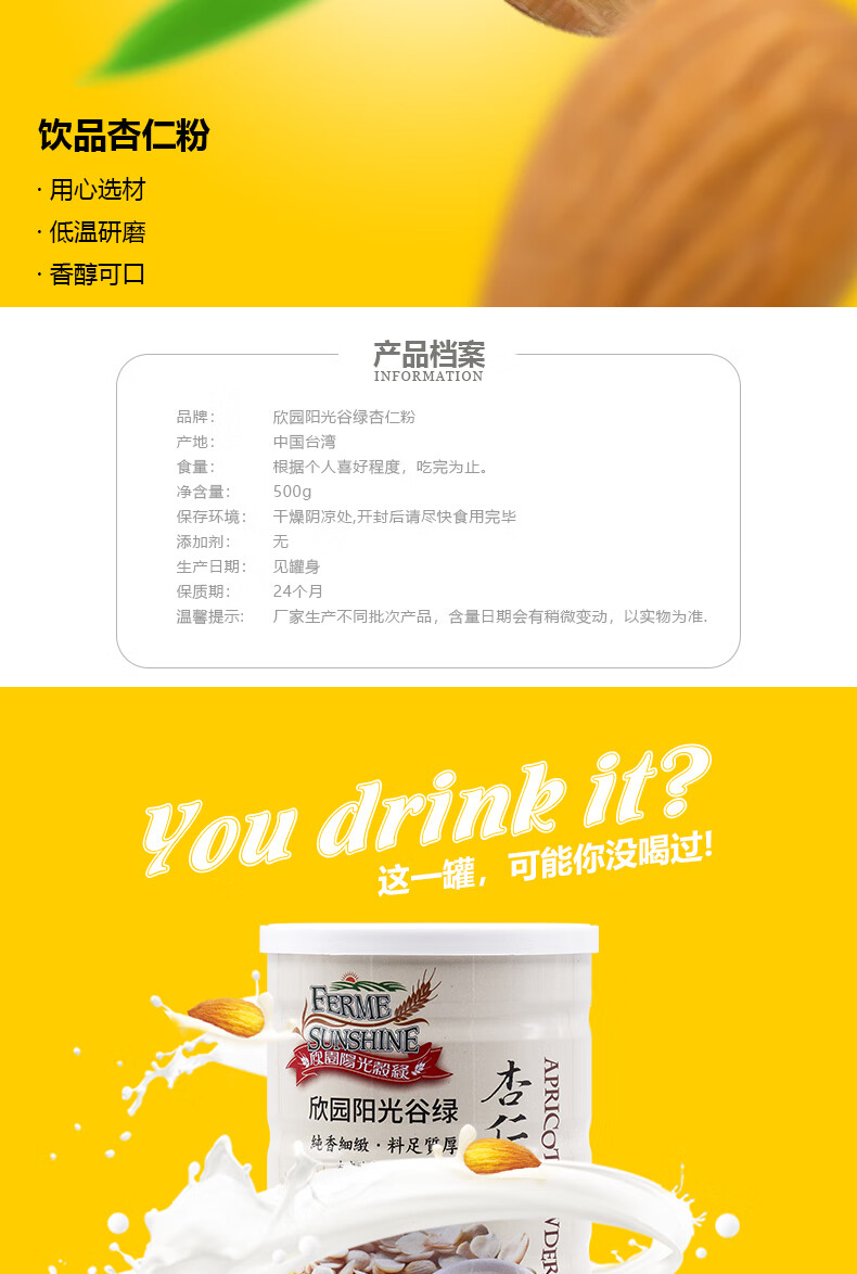 Xinyuan Sunshine Valley Green (FERME SUNSHING) Fudetai Taiwan Original Xinyuan Sunshine Valley Green Almond Powder 500g Brewed Southern Almond Almond Tea