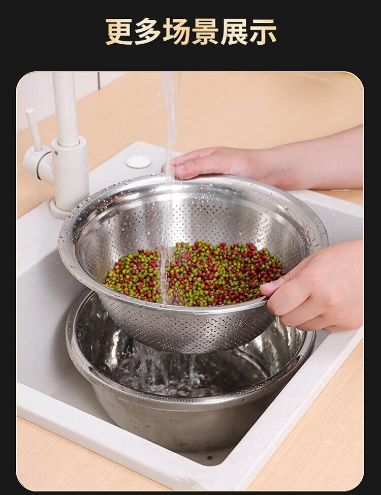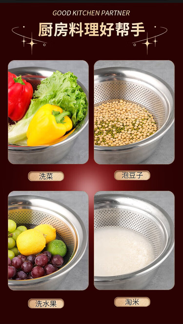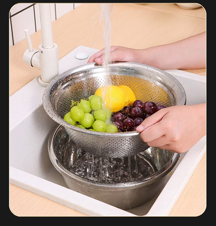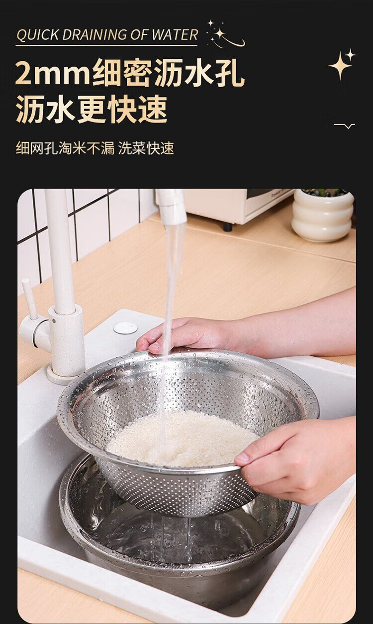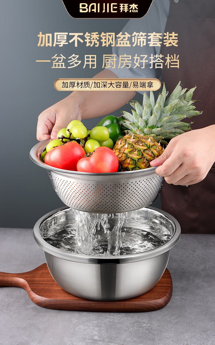 Baijie stainless steel drain basket washing basin rice washing basin kitchen fruit basin rice washing sieve drain basin large set 32cm