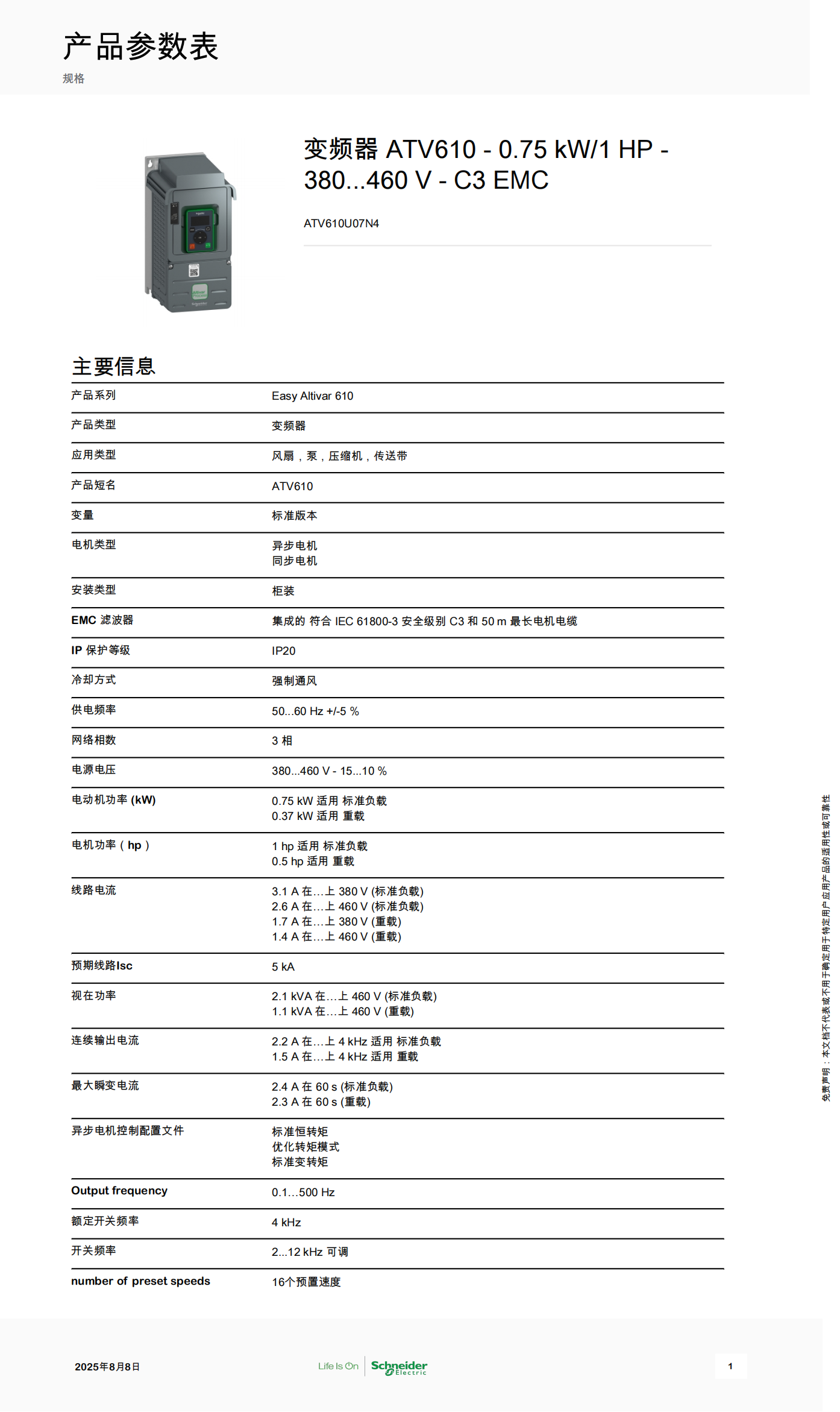 Schneider Electric Inverter ATV610 0.75 kW/1 HP C3 ATV610U07N4