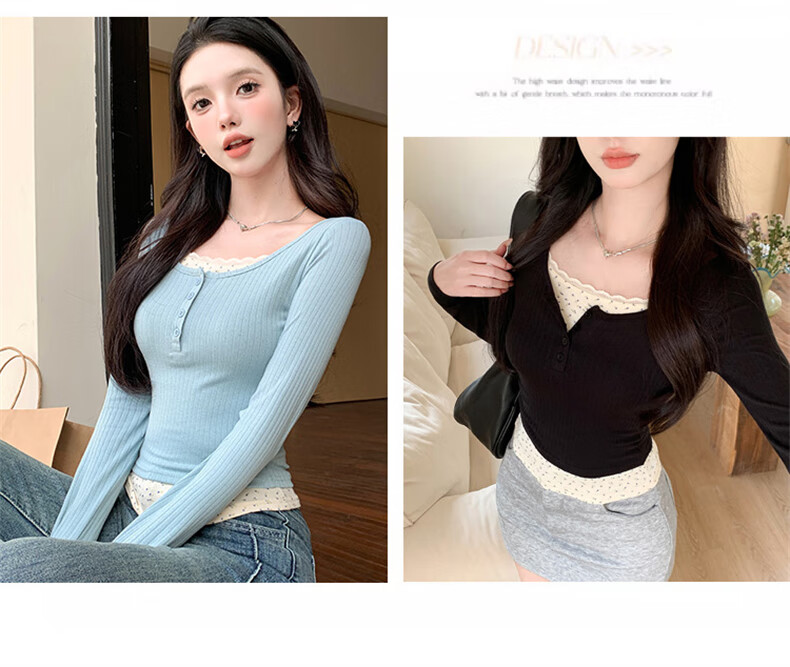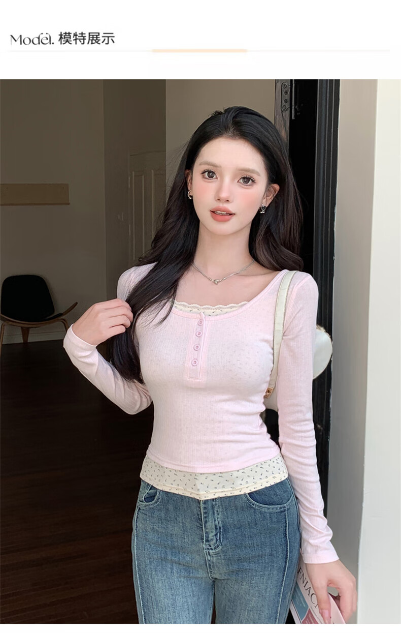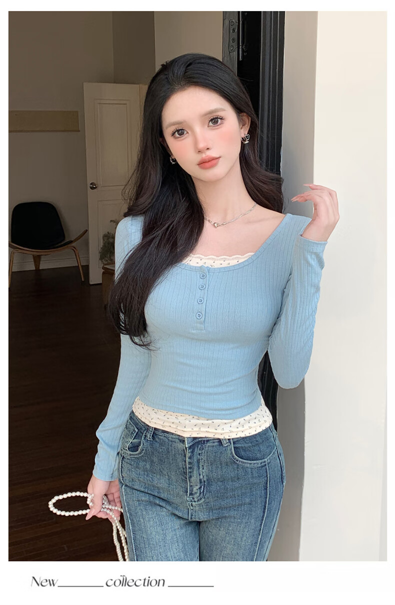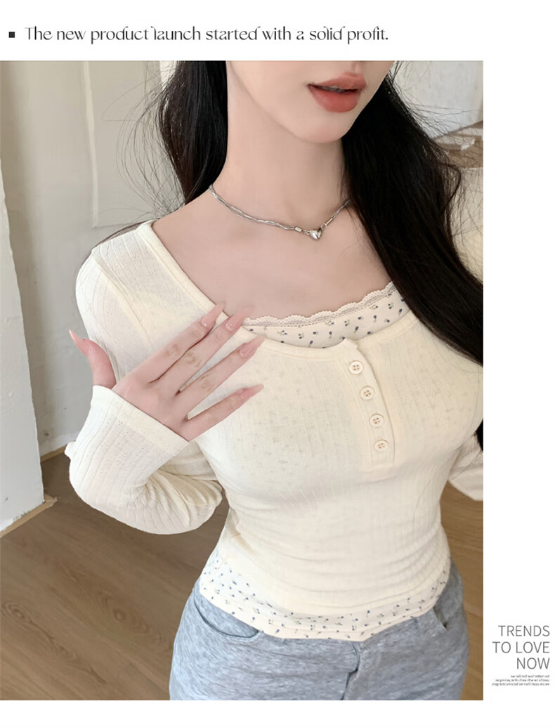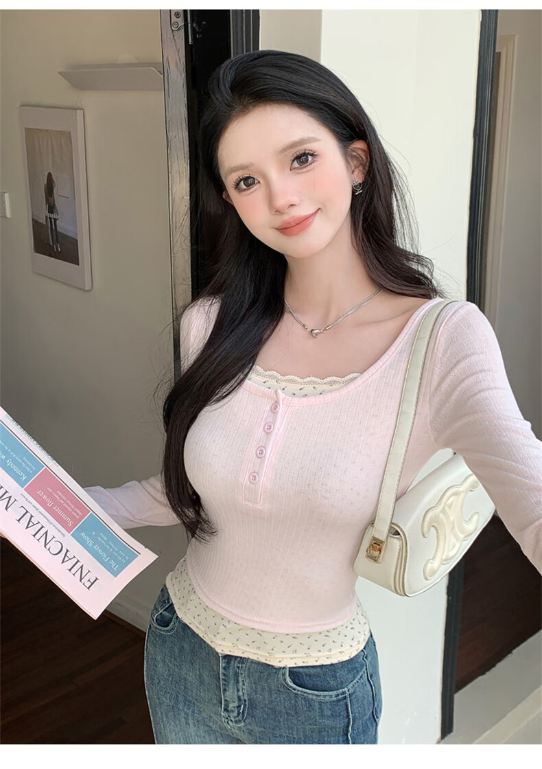 Langsha Floral Fake Two Piece Bottoming Shirt Women's Long Sleeve 2025 Autumn New Style Slim Fit Pure Sexy Hot Girl Lace Top
