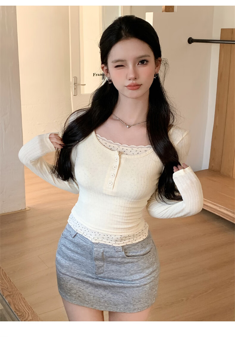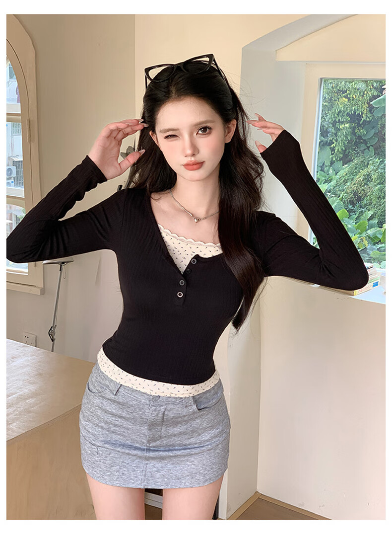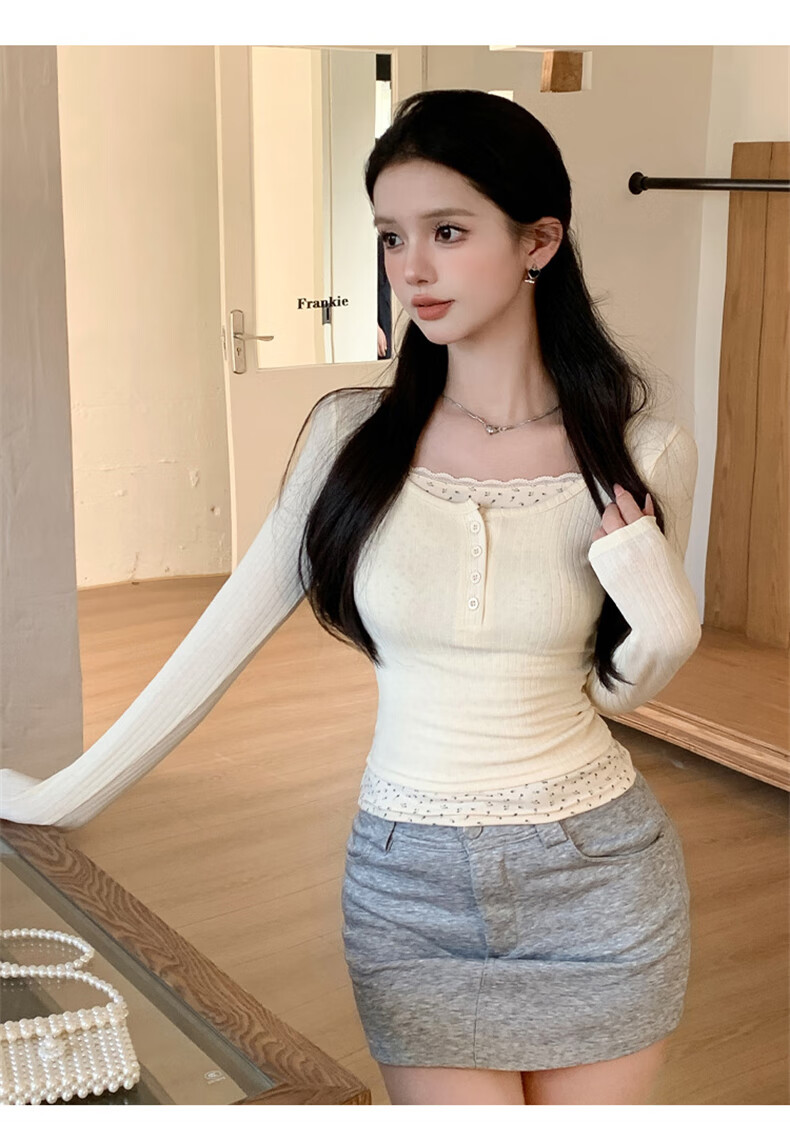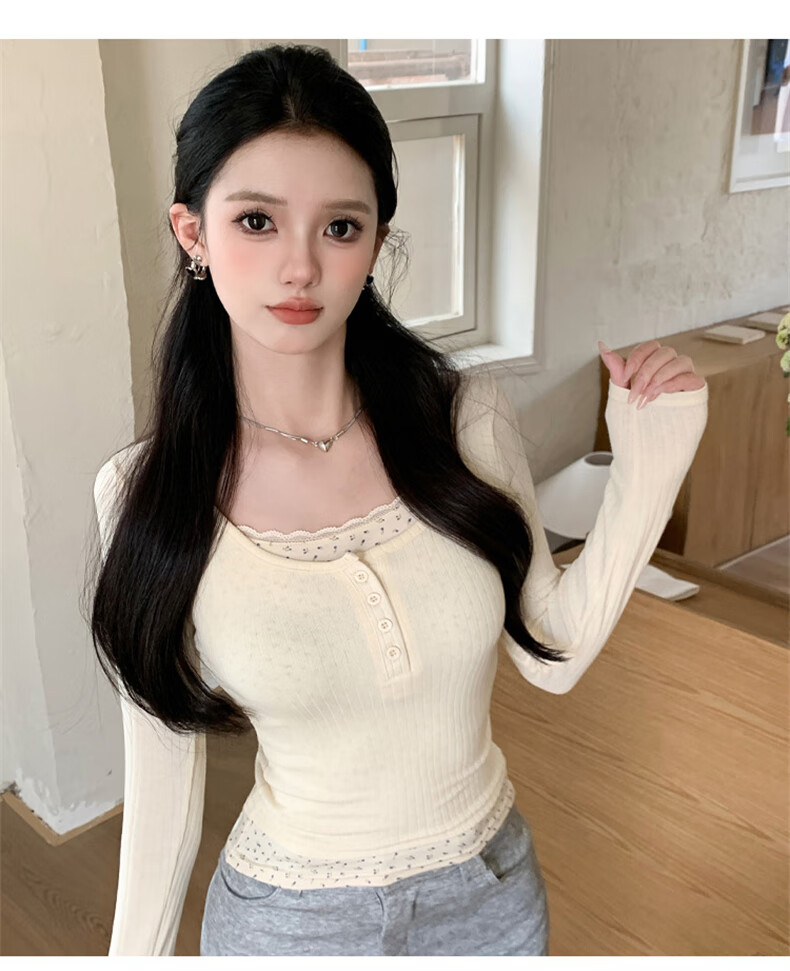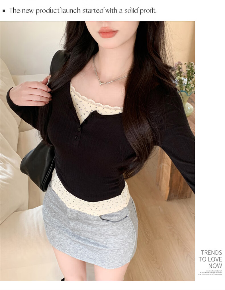 Langsha Floral Fake Two Piece Bottoming Shirt Women's Long Sleeve 2025 Autumn New Style Slim Fit Pure Sexy Hot Girl Lace Top