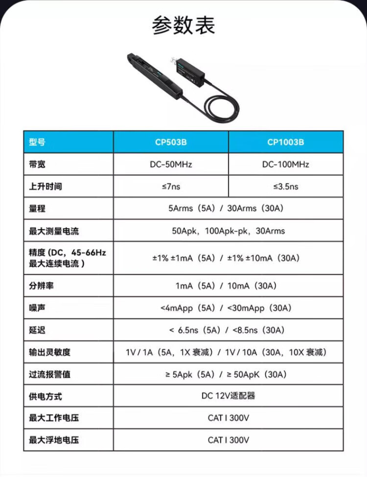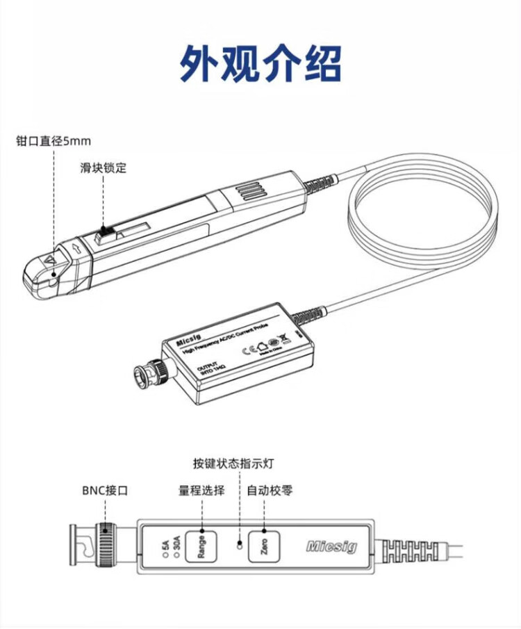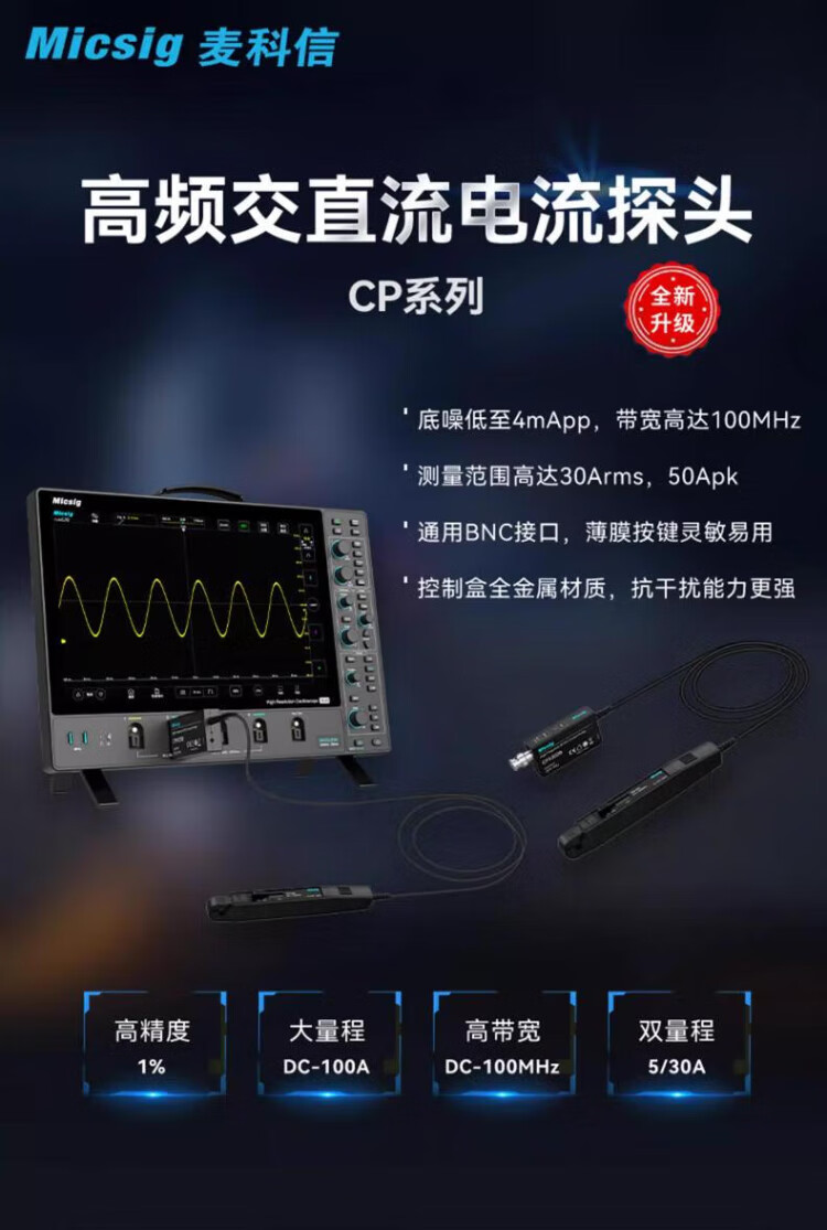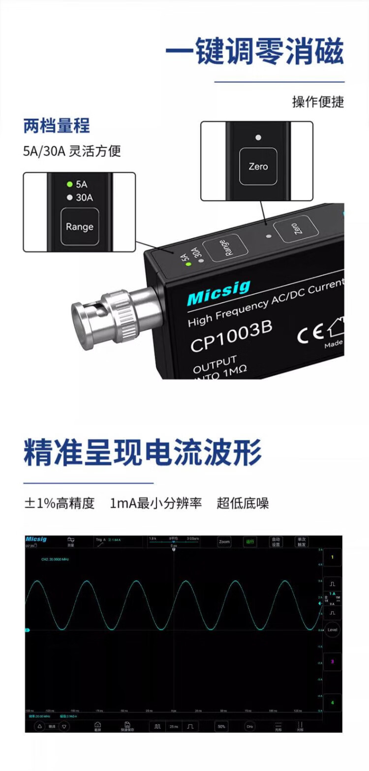 Micsig oscilloscope high frequency AC and DC current probe CP503B dual range 5A/30Arms bandwidth 50MHz