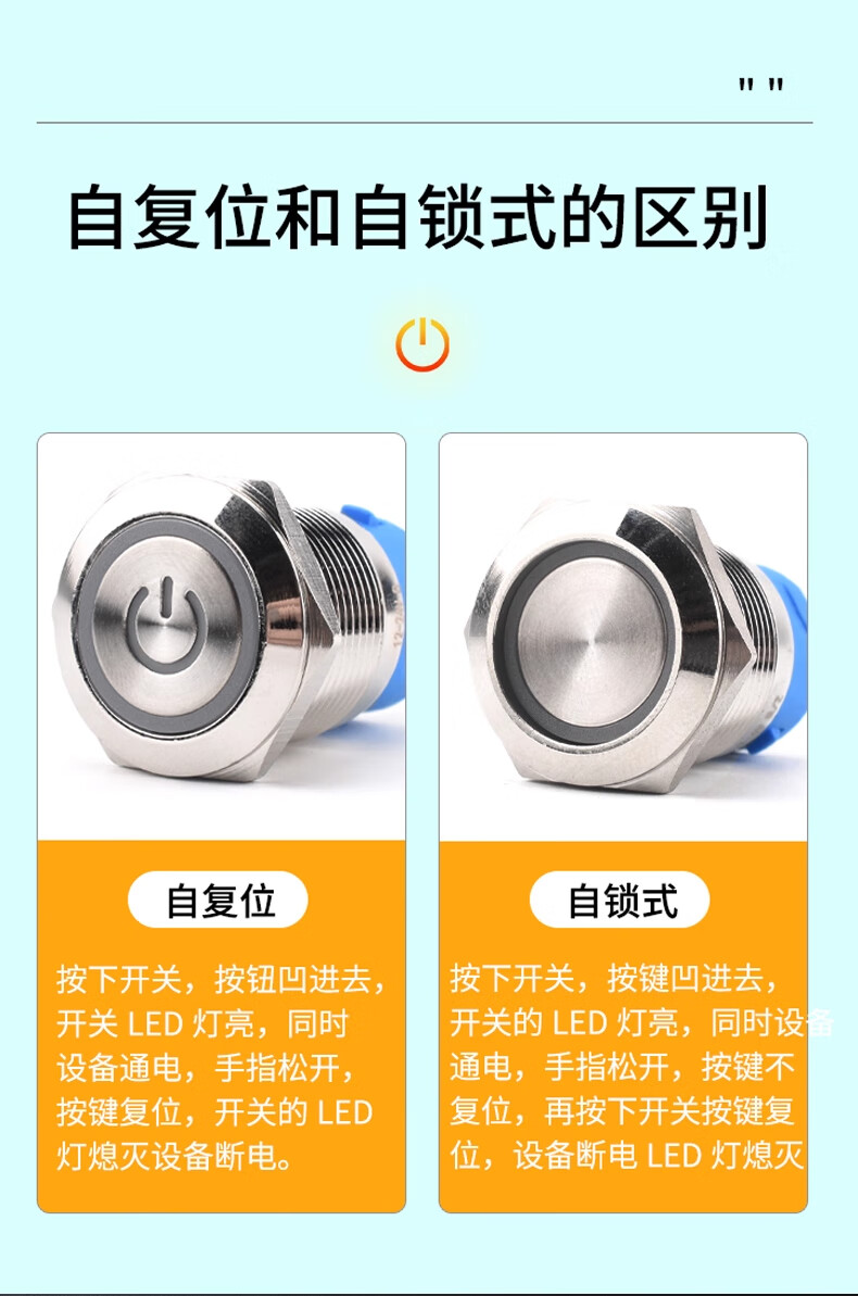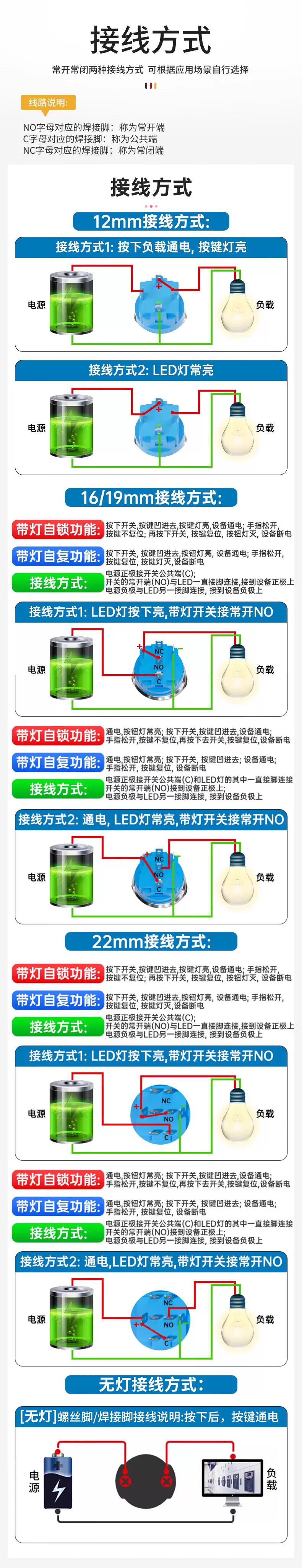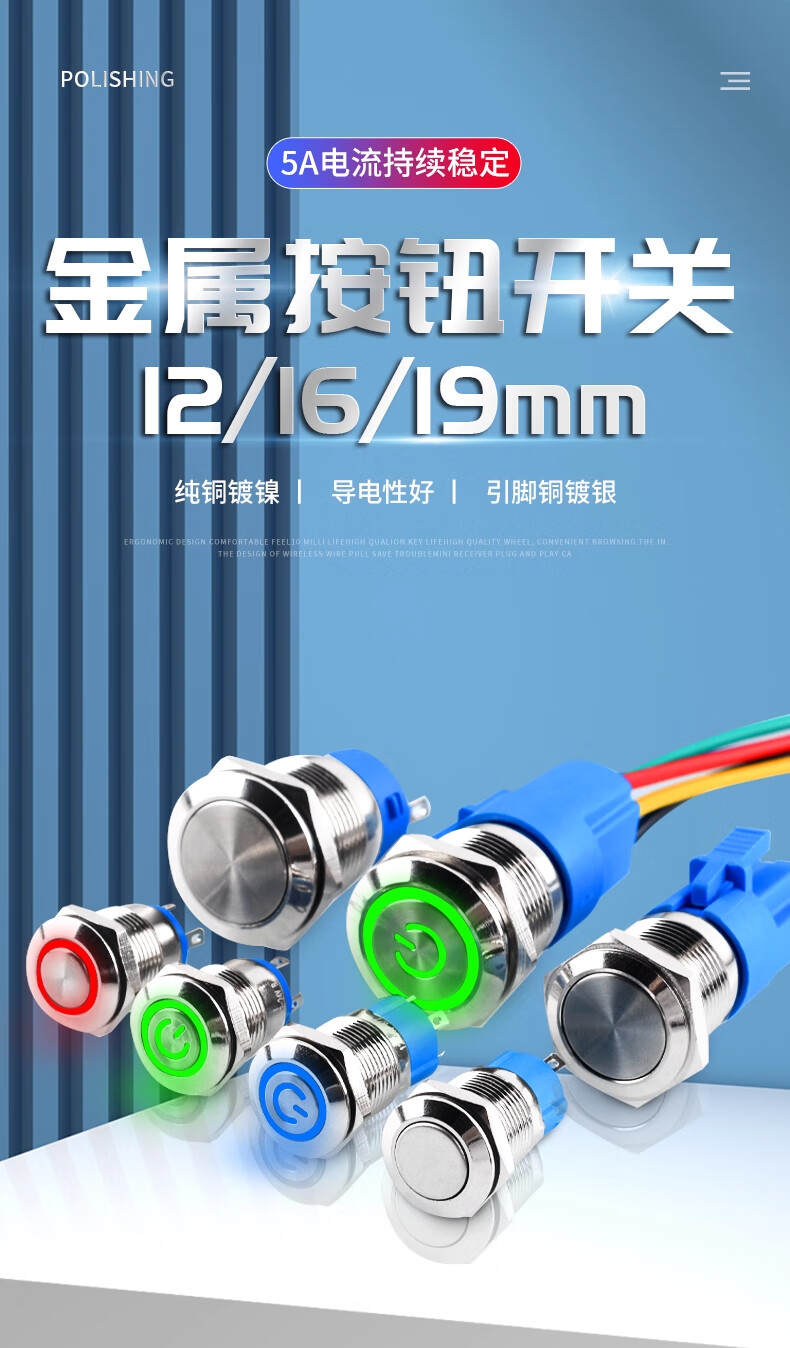 ZAVE metal button switch 19MM flat head power green light 12-24V with wire self-locking