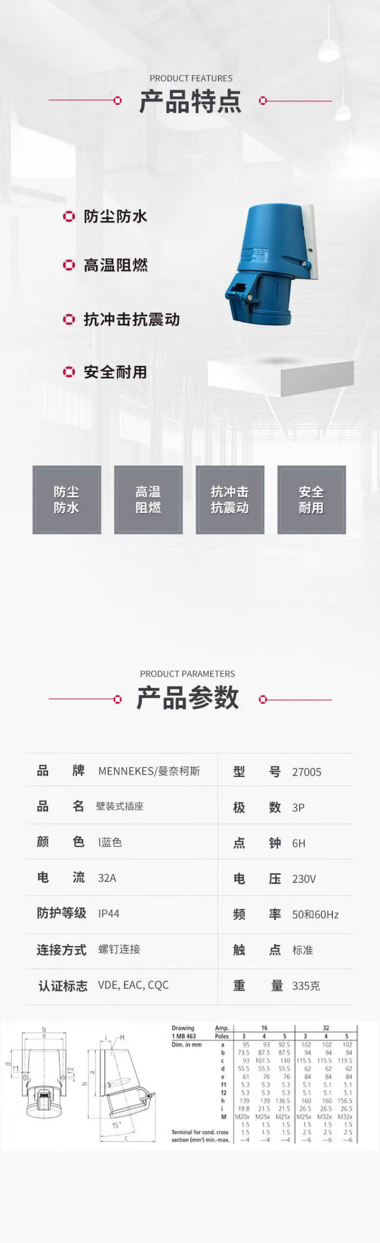 MENNEKES industrial socket 27005 3P 32A 230V IP44 exposed waterproof and dustproof industrial plug connector three-phase electric high power aircraft carrier head 3 core 32A+3P+230V-27005