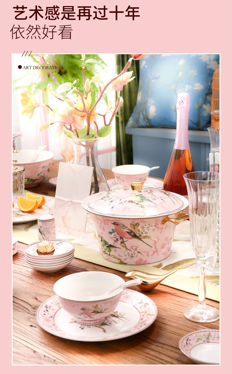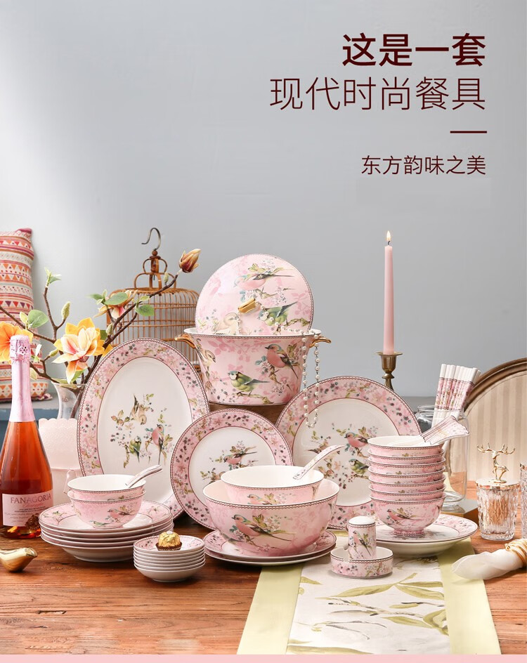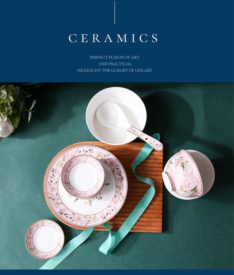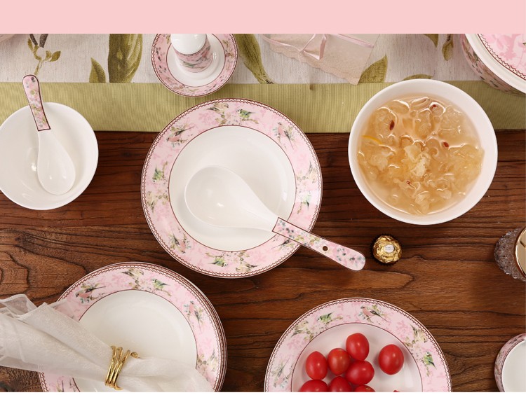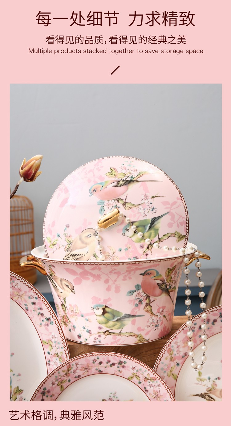 Heart Decoration Garden Pink Bird 46-piece bone china tableware set, high-end dishes, home dining plates, spoons, gift box, wedding and housewarming gift set, Pink Bird 46-piece tableware + 10 pairs of chopsticks - gift box