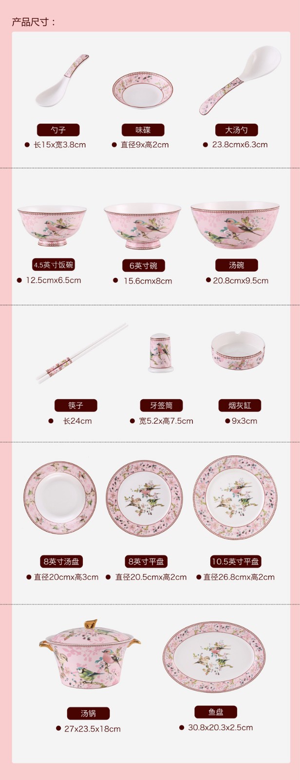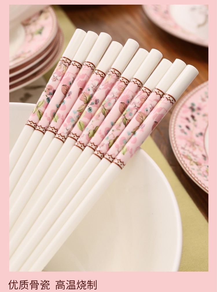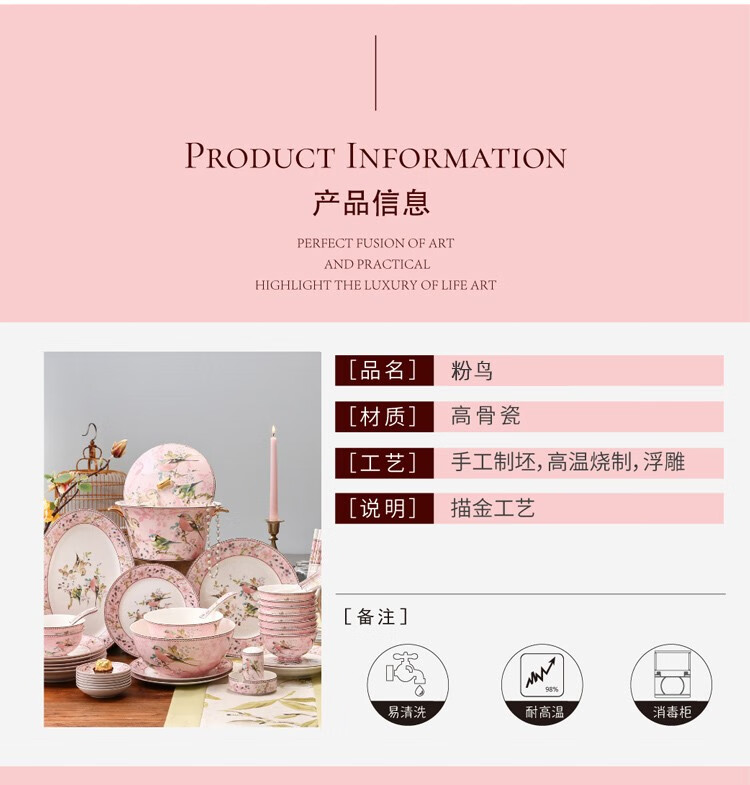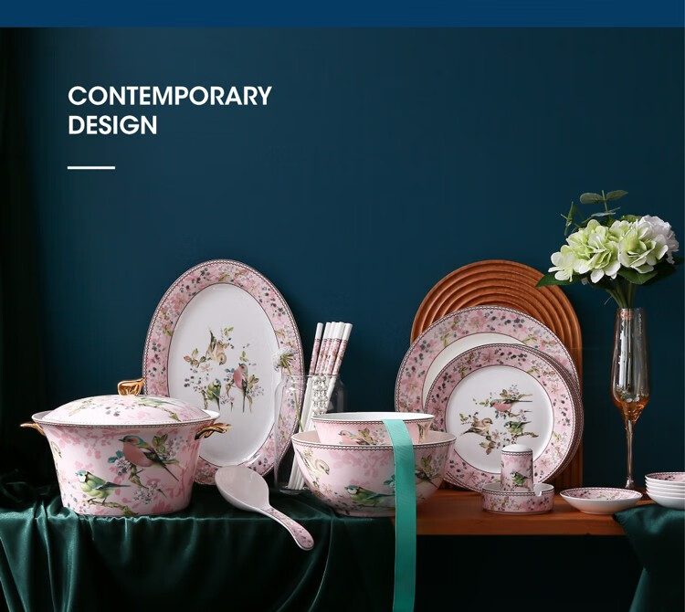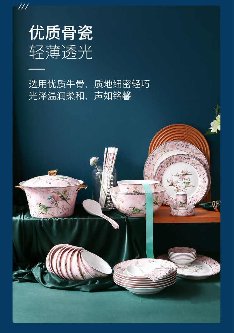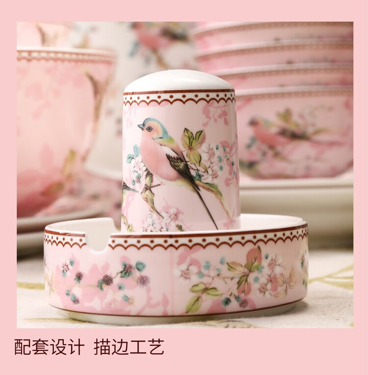 Heart Decoration Garden Pink Bird 46-piece bone china tableware set, high-end dishes, home dining plates, spoons, gift box, wedding and housewarming gift set, Pink Bird 46-piece tableware + 10 pairs of chopsticks - gift box