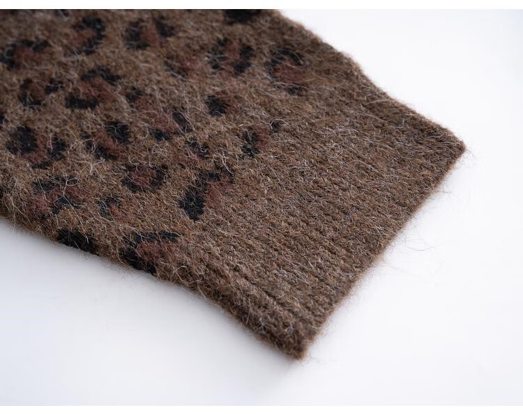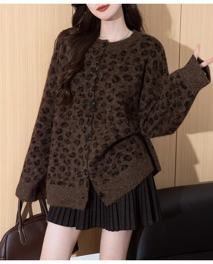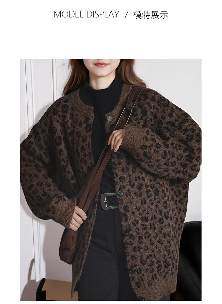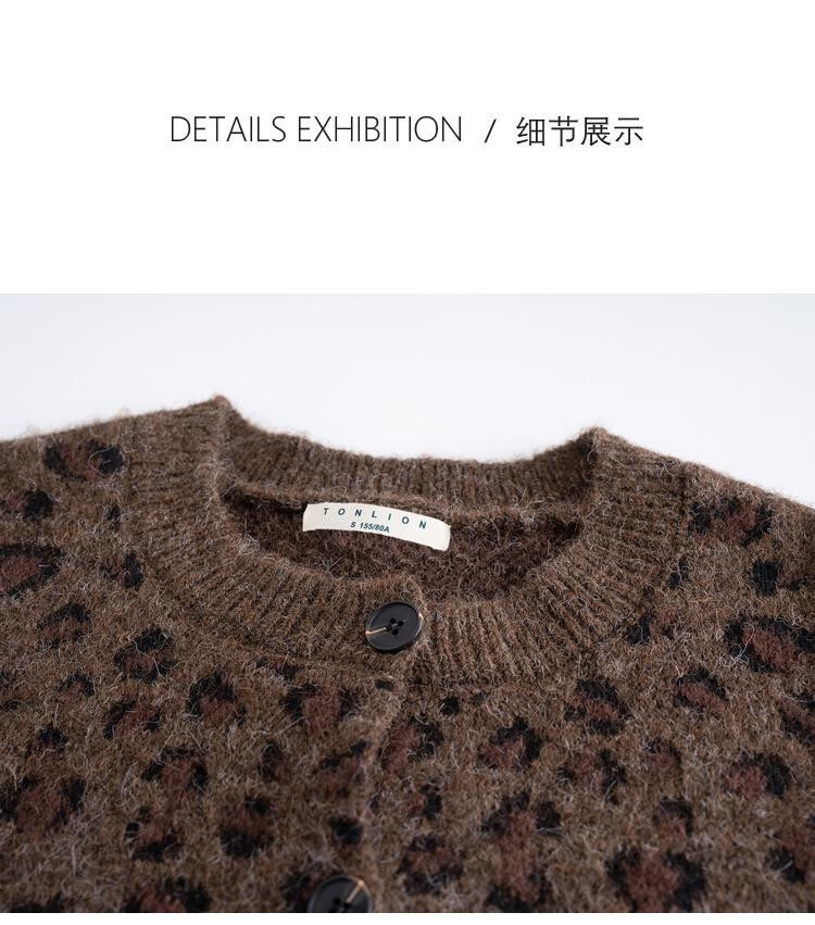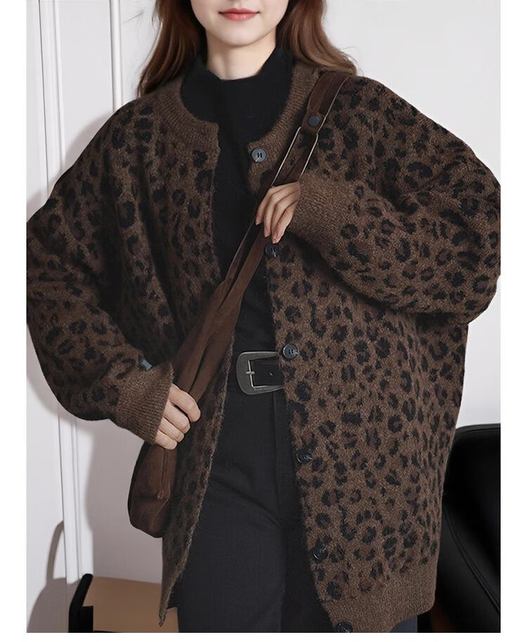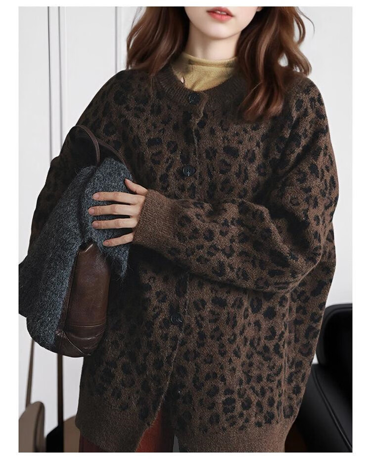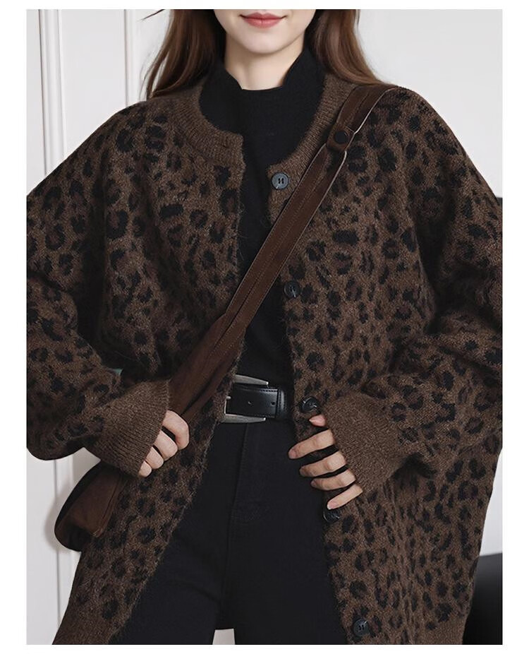 TonLion 2025 Autumn and Winter Retro Leopard Pattern Round Neck Loose Cardigan Jacket for Women