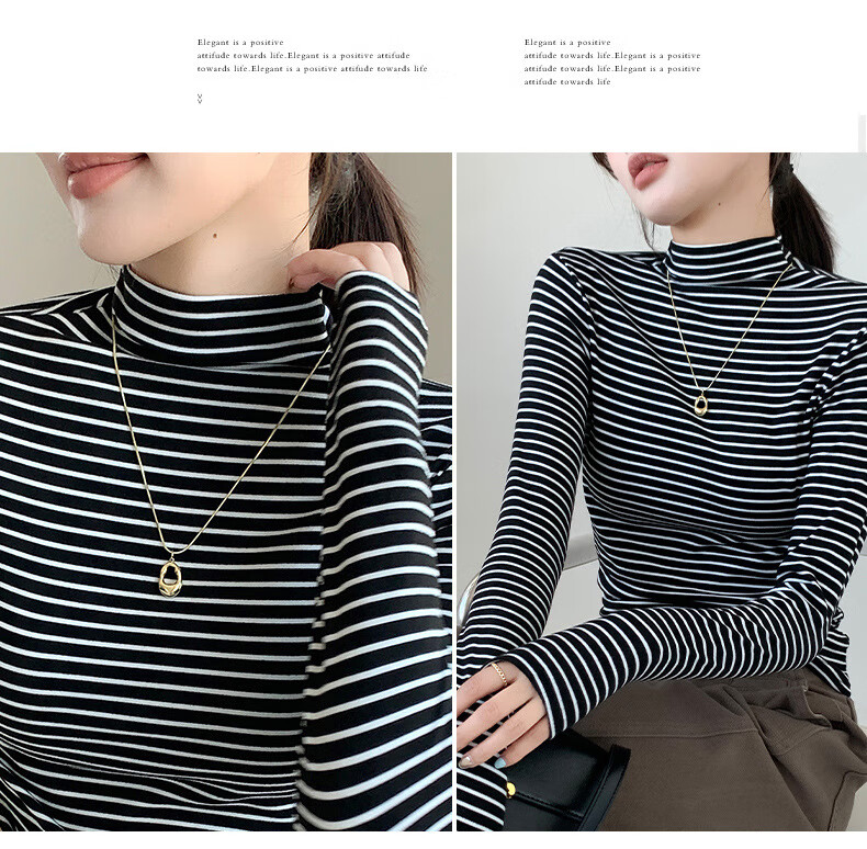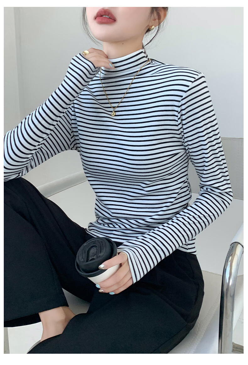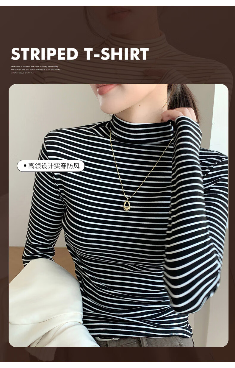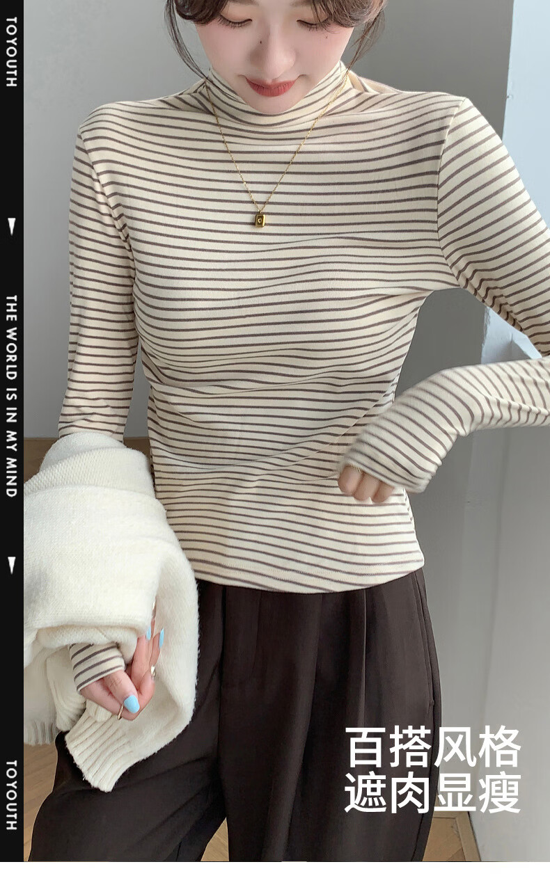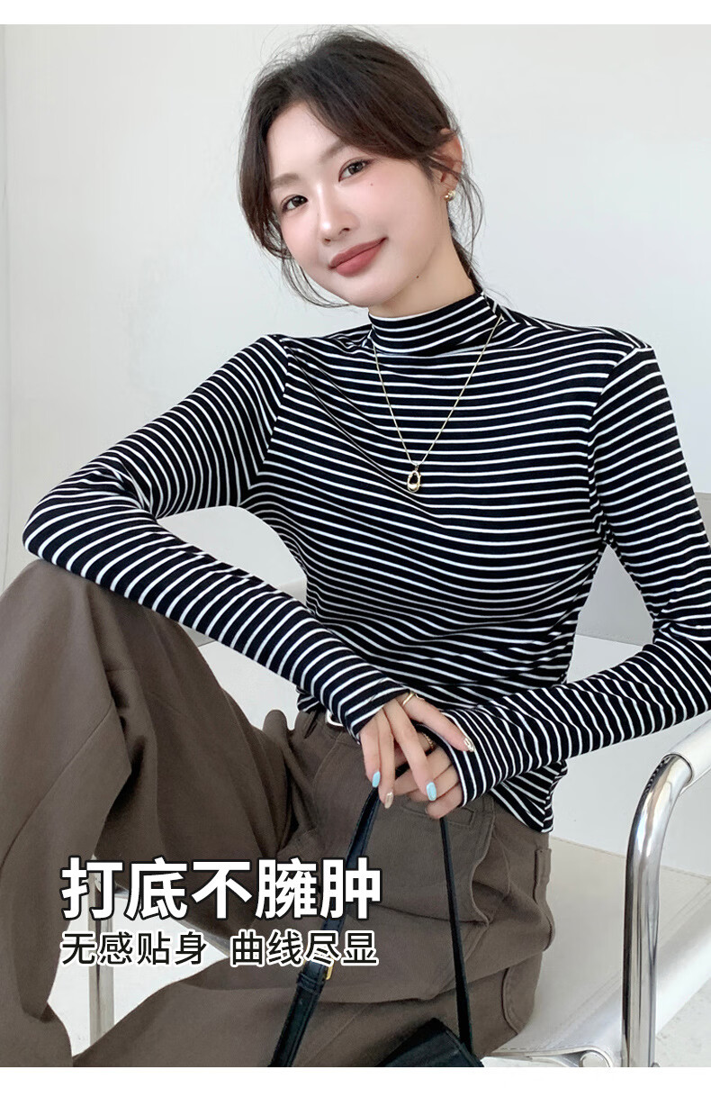 Langsha striped bottoming shirt for women winter 2025 new double-sided brushed half-high collar slim slim long-sleeved inner top