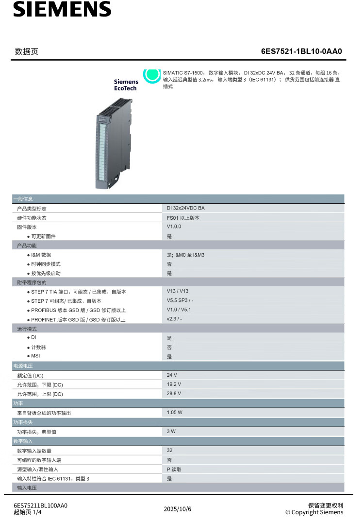 Siemens S7-1500PLC digital input module 6ES7521-1BL10-0AA0,DI 32xDC 24V BA