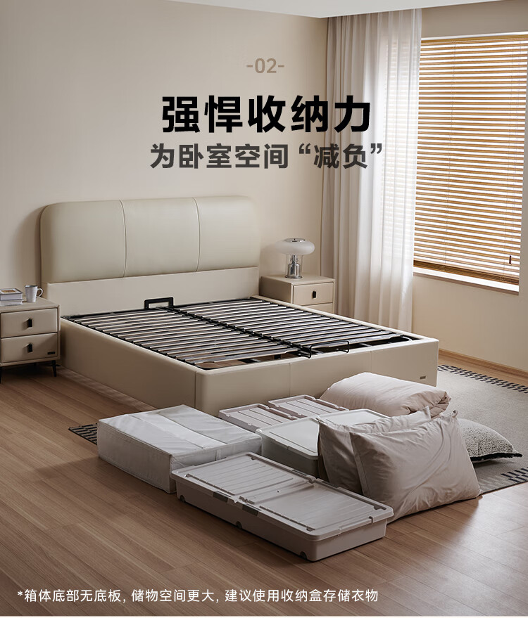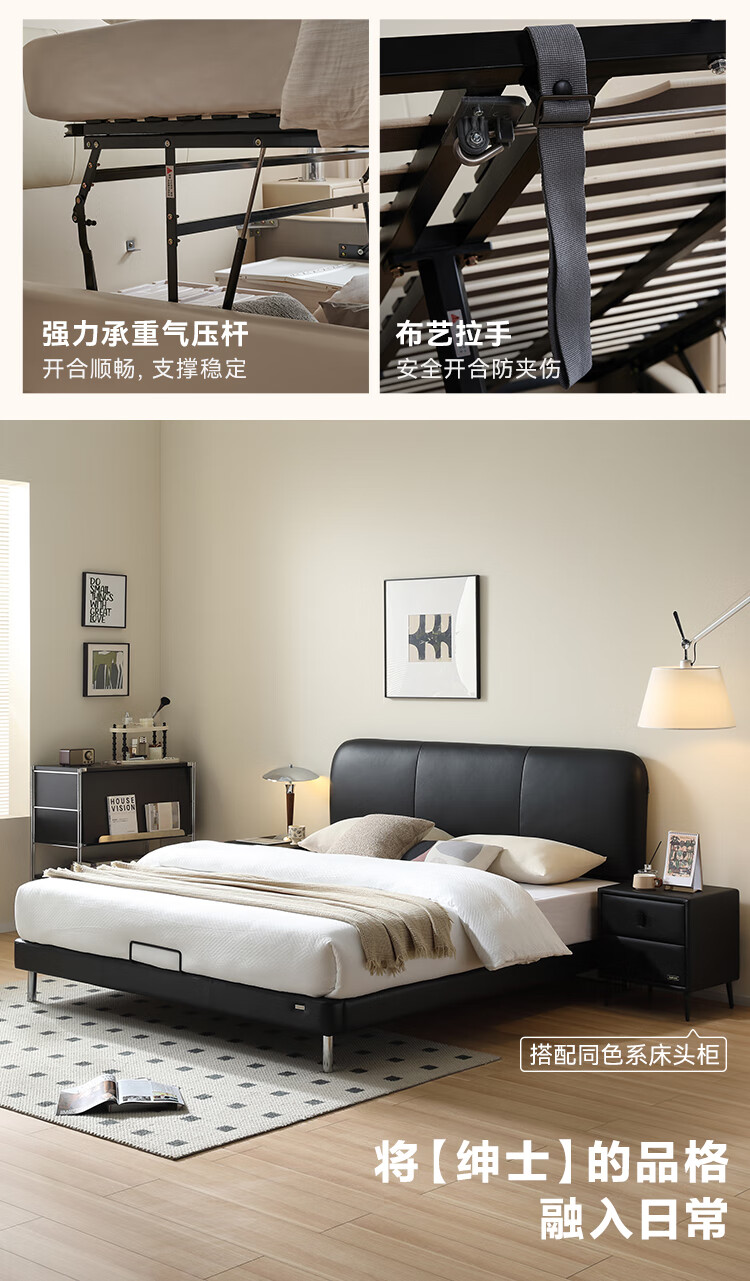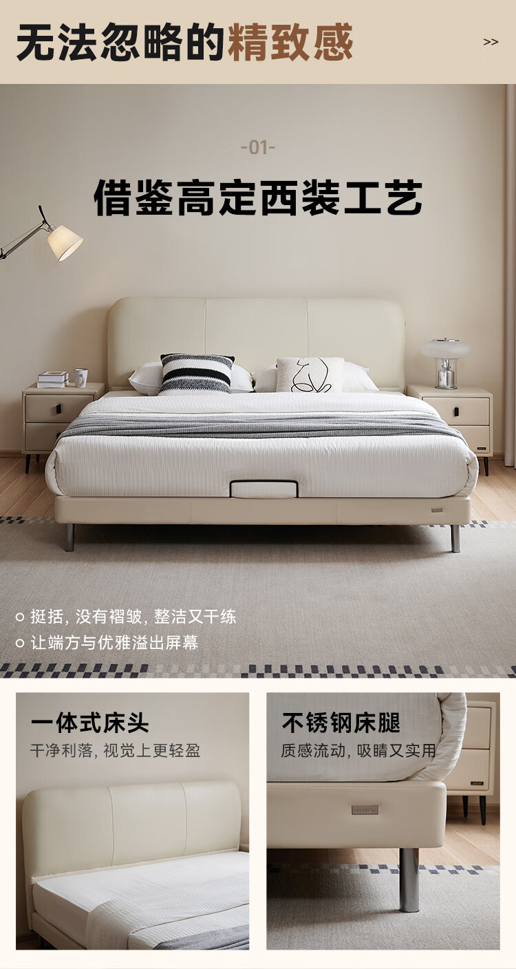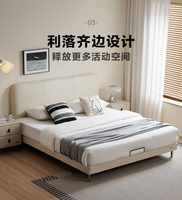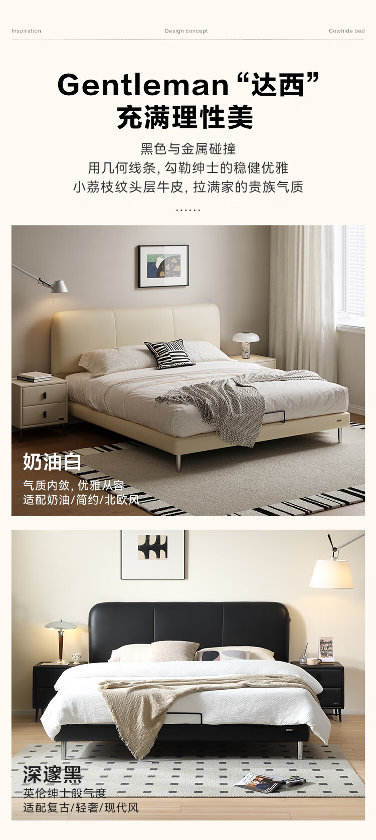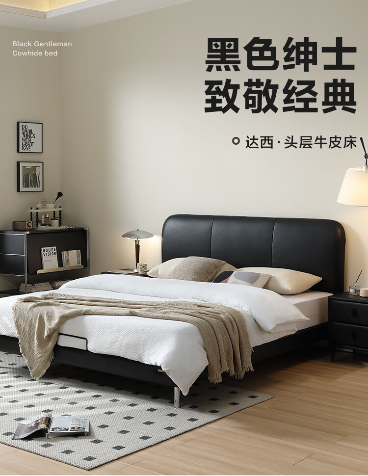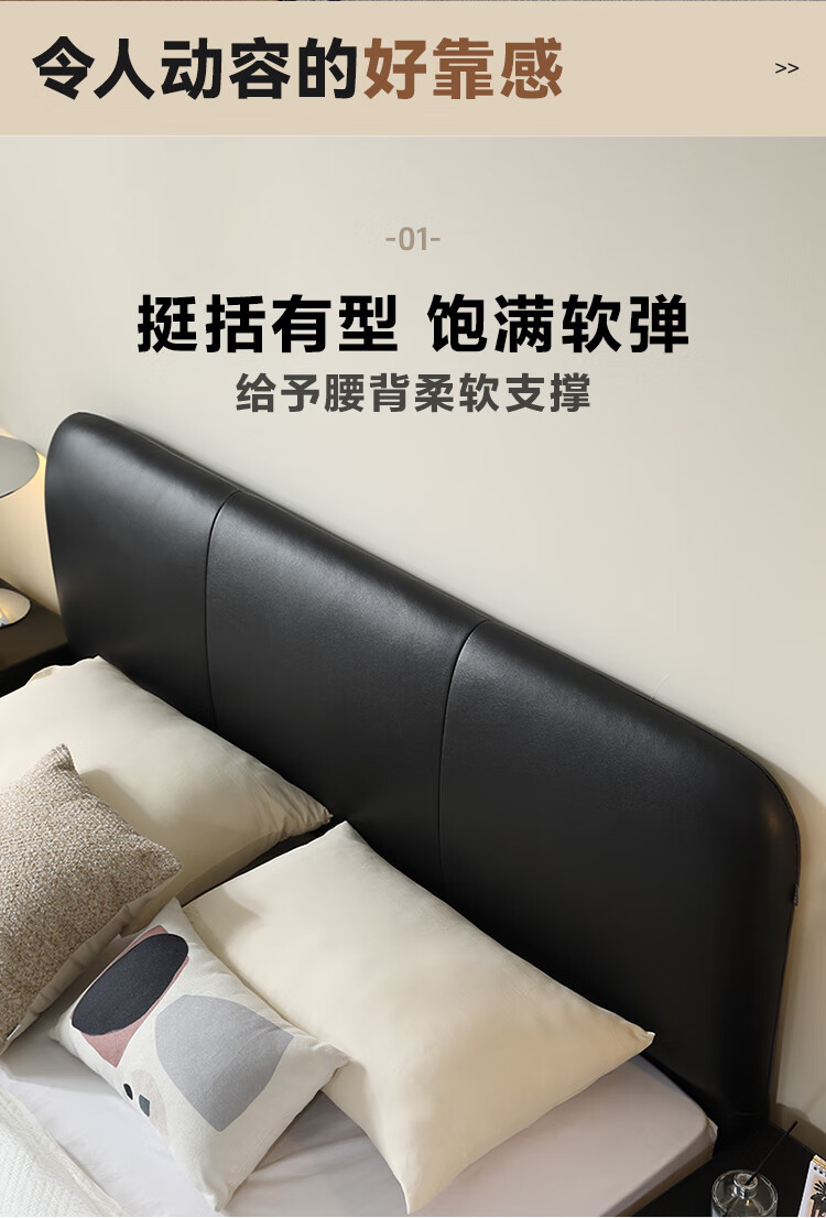 Quanyou Home Leather Bedside Cowhide Bedroom Double Soft Backrest Modern Simple Leather Art King Bed 1.5x1.9 Meters