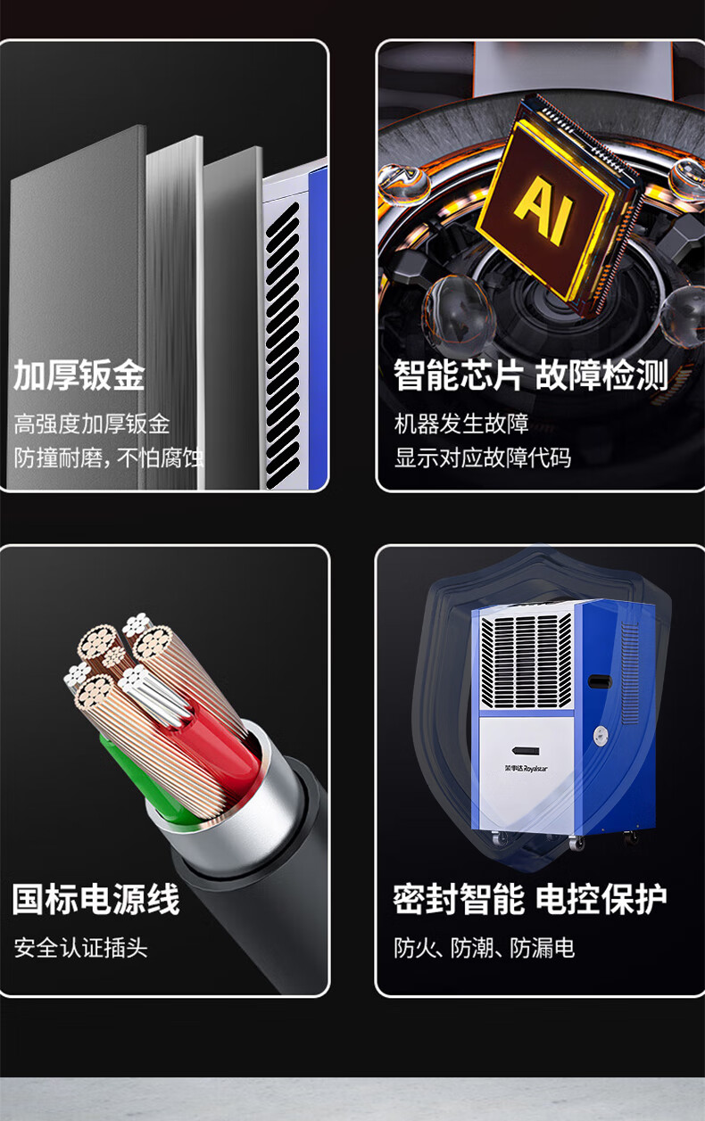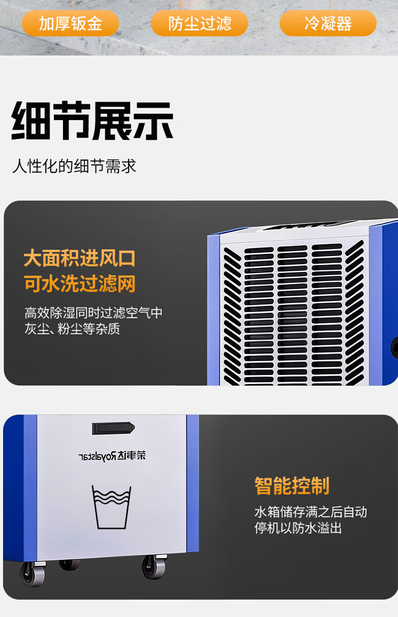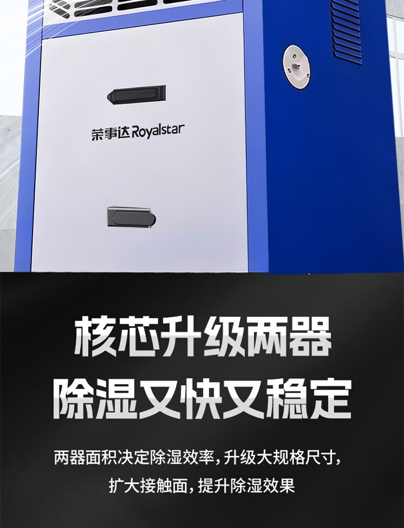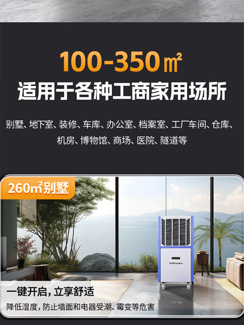 Royalstar industrial dehumidifier has a dehumidification capacity of 90 liters/day and is suitable for 120-180 square meters. It is the first choice for commercial industrial dehumidification RSD-CS890L.