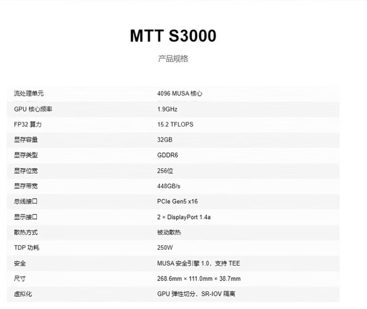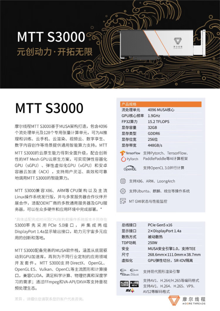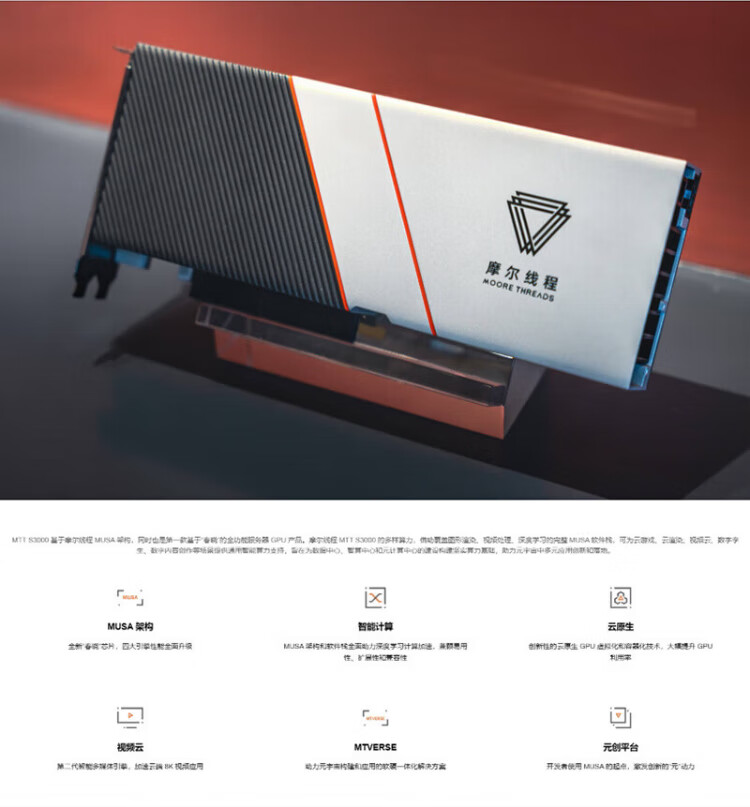 MOORE THREADS MTT S3000 32GB data center-level GPU graphics card cloud rendering optimization 80% CPU load reduction AI training inference 4096MUSA core industrial packaging