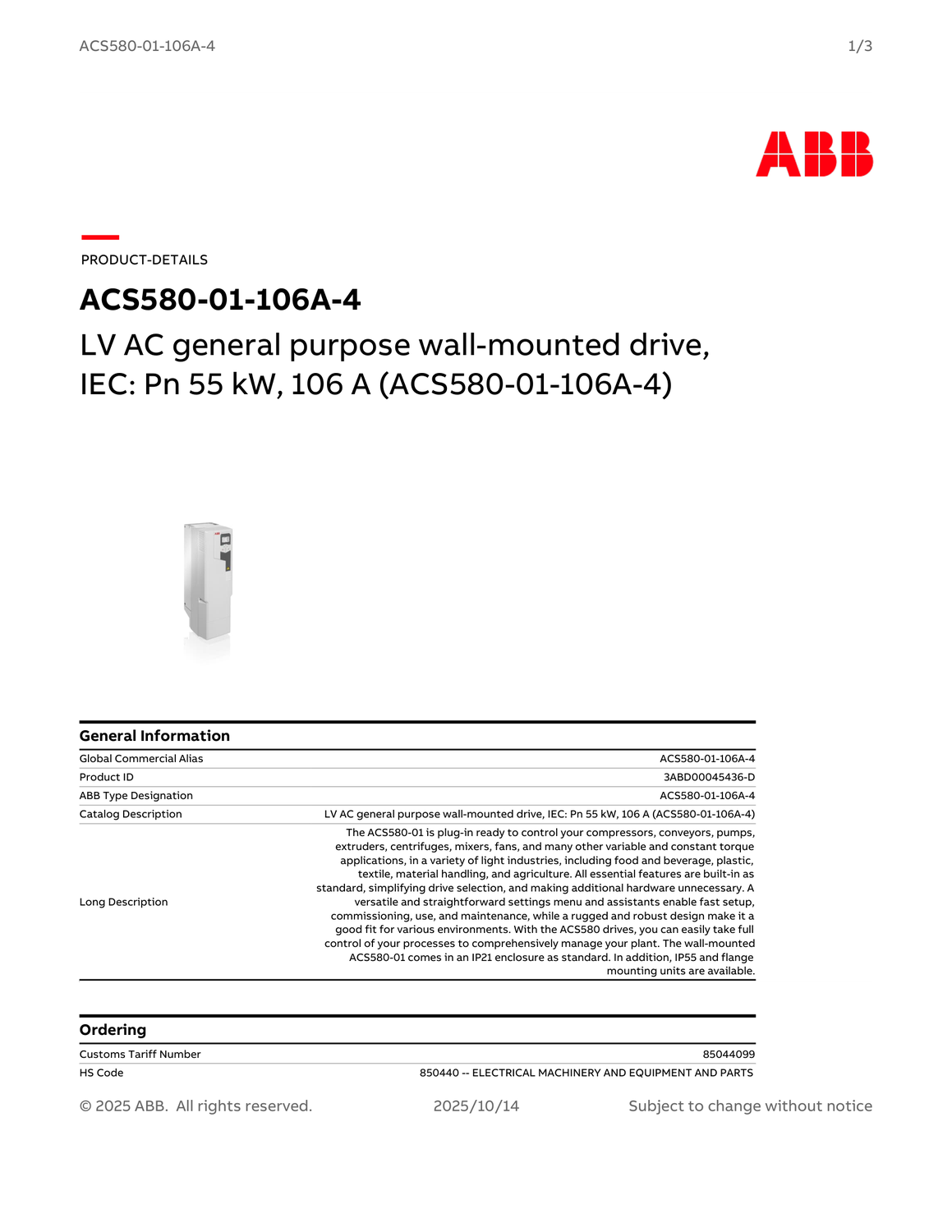 Abb inverter 55KW ACS580-01-106A-4 three-phase adjustable industrial product including operation panel 3ABD0004543