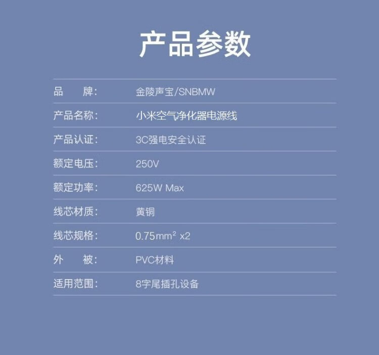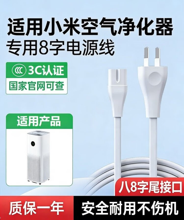 Jinling Shengbao Xiaomi air purifier power cord two-hole plug 5S/4Pro/4MAX/3/2S/Pro eight-eight-shaped round 2-hole Mijia fan sweeping robot charging cable white 1.5m