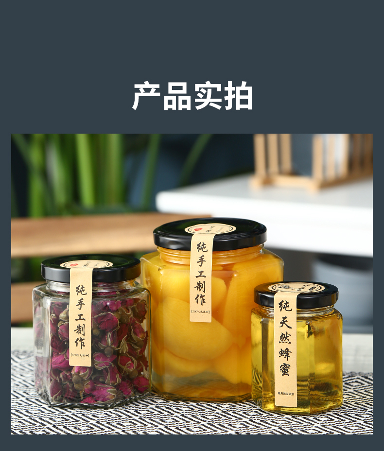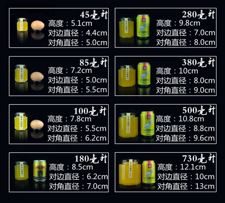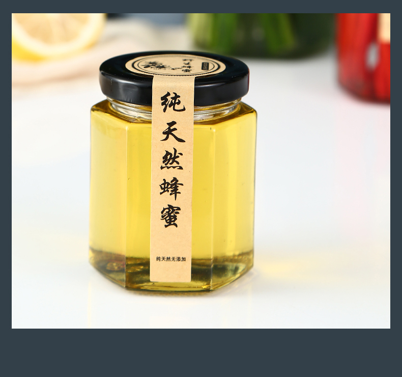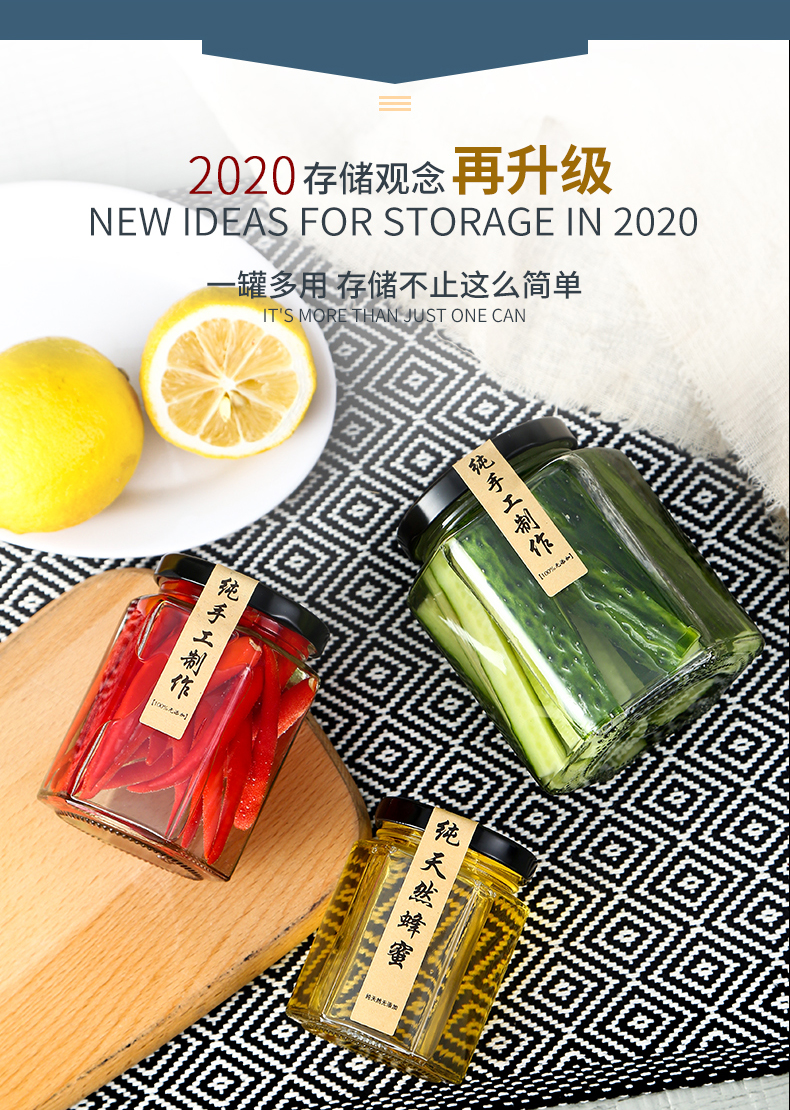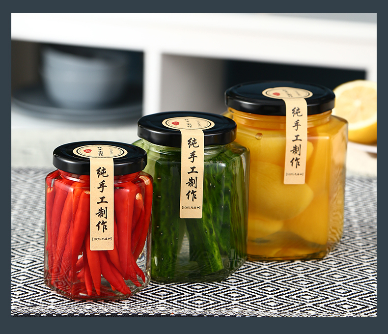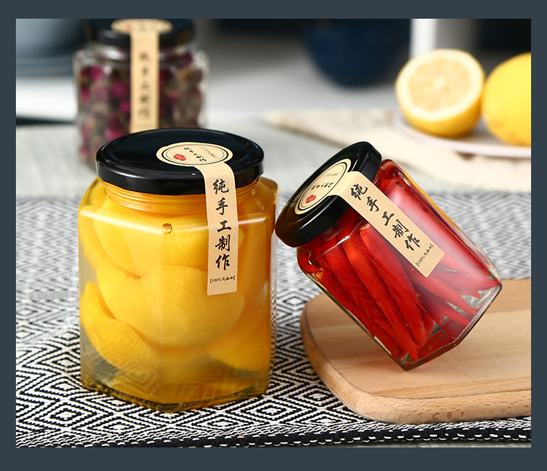 Hexagonal hexagonal glass bottle sealed jar honey bottle packaging small jam vegetable lemon paste can bottle with lid wholesale 6 180 ml + foam box