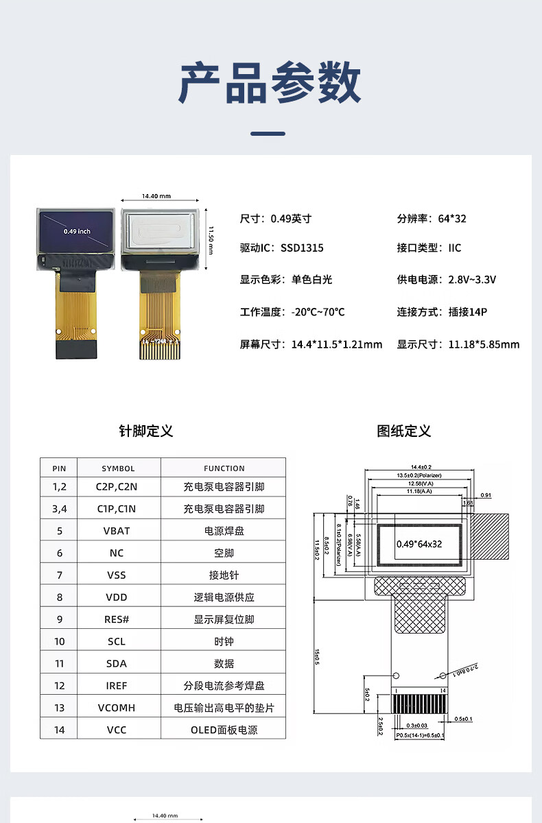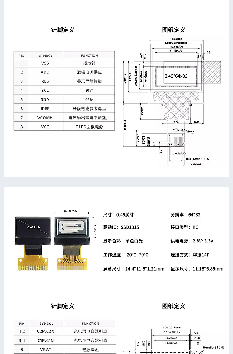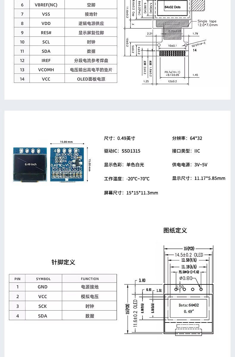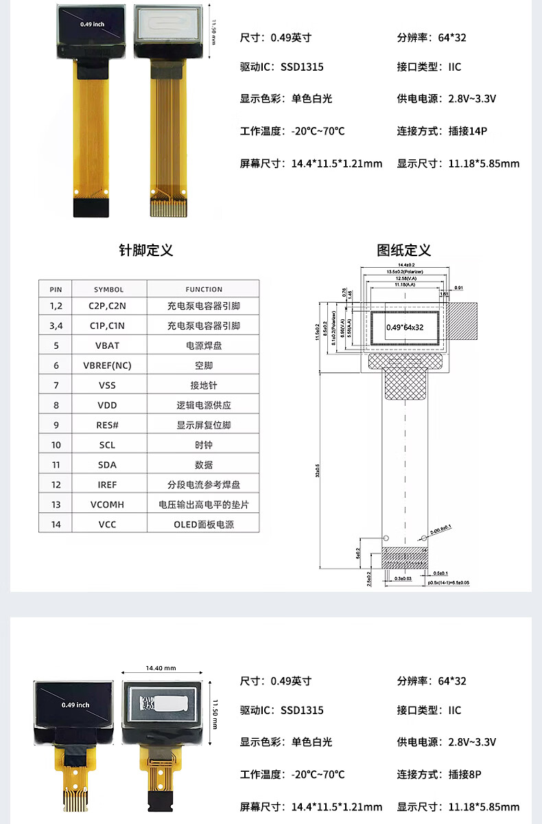 Renrun OLED monochrome LCD development board small screen 64*32 display module SSD1315 0.49 inch welding 14P 2 pieces RR-OLED0494