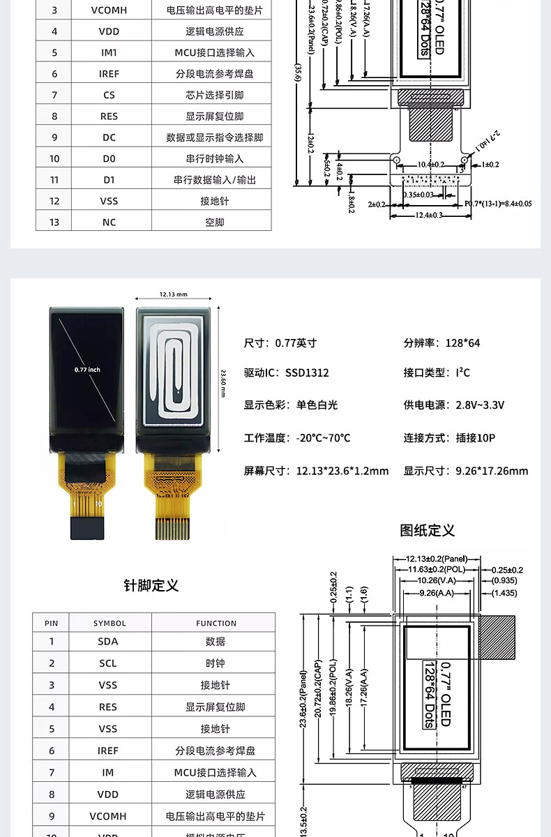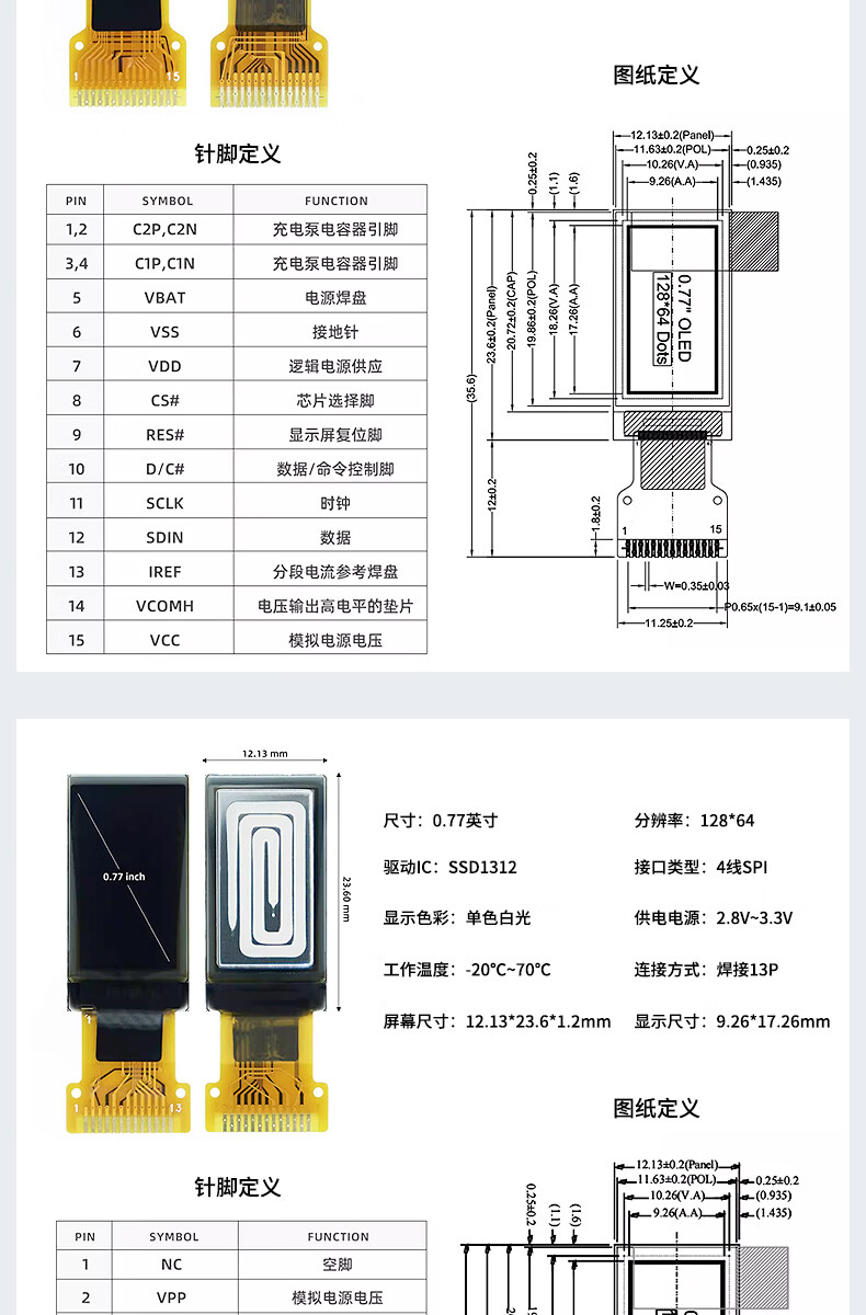 Renrun OLED monochrome LCD development board small screen 128*64 display module SSD1312 0.77 inch welding 15P 2 pieces RR-OLDE0773