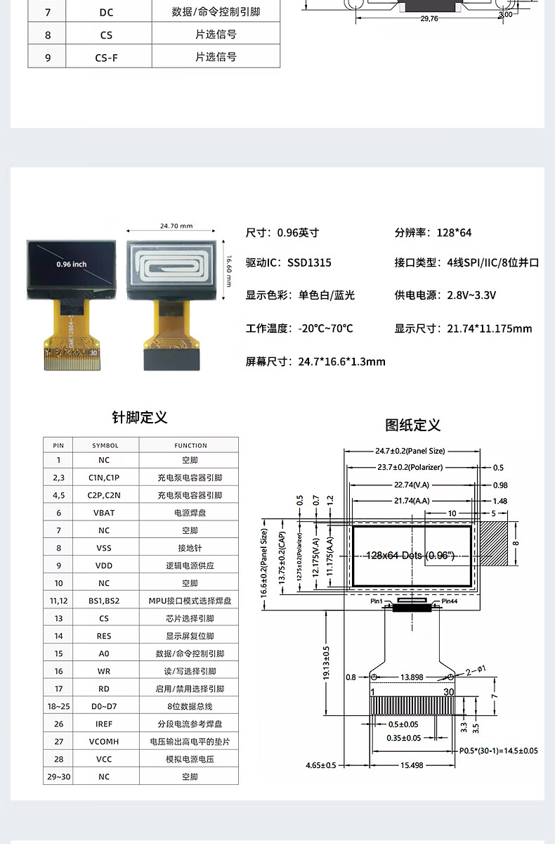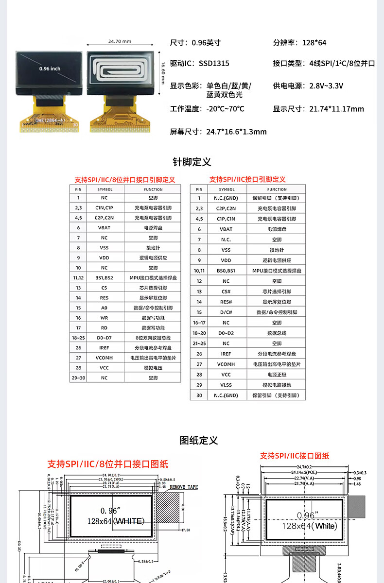 Renrun OLED monochrome LCD development board small screen 64x128 display module SSD1315 0.96-inch narrow edge 4-pin non-soldering pin module white light 2 pack RR-0961Z5