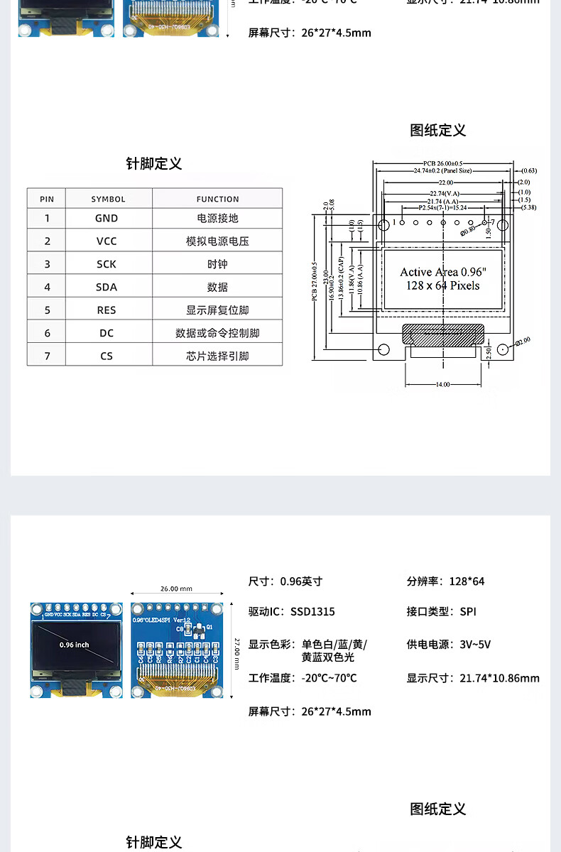 Renrun OLED monochrome LCD development board small screen 64x128 display module SSD1315 0.96-inch narrow edge 4-pin non-soldering pin module Blu-ray 2 pack RR-0961Z6