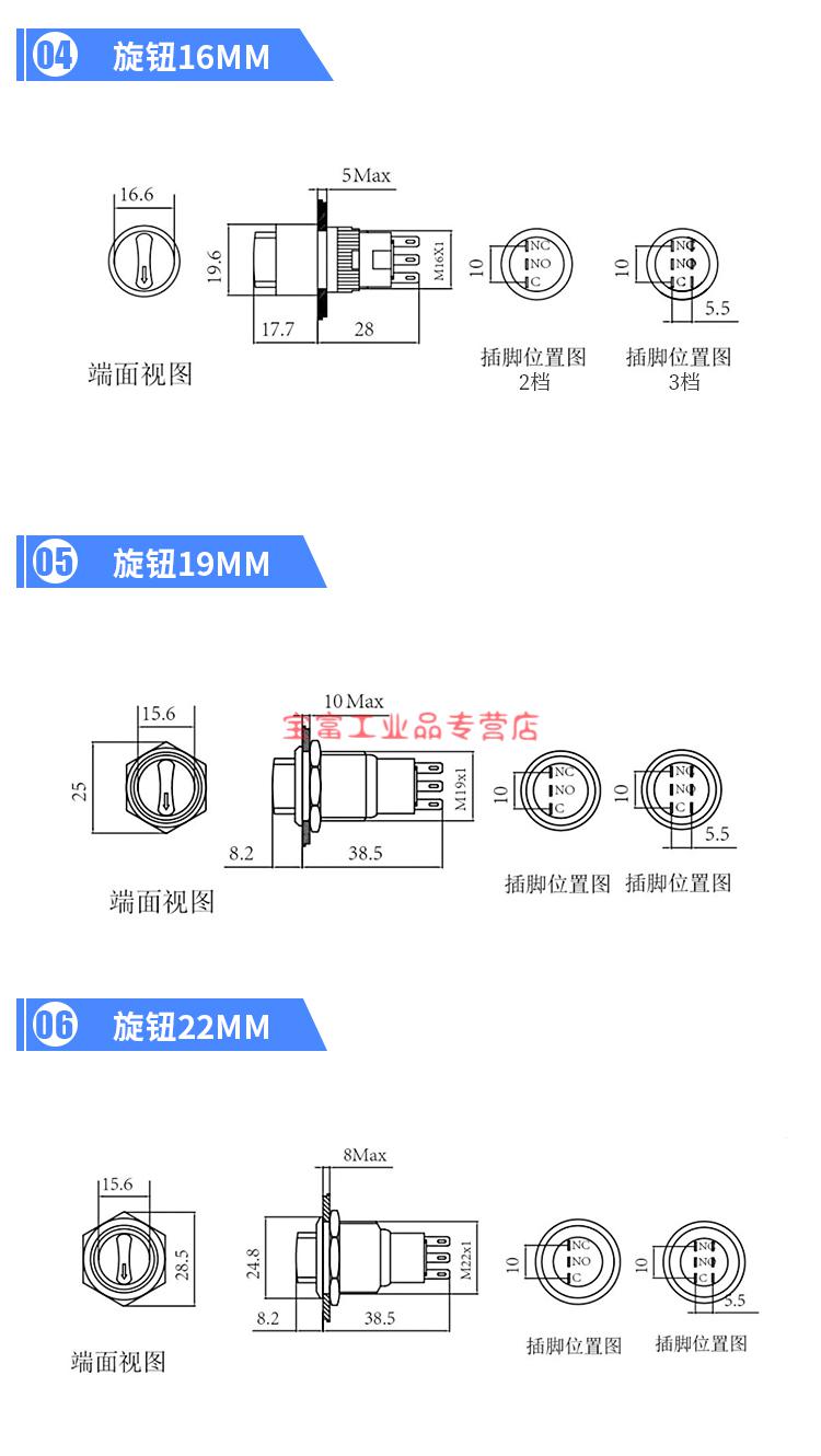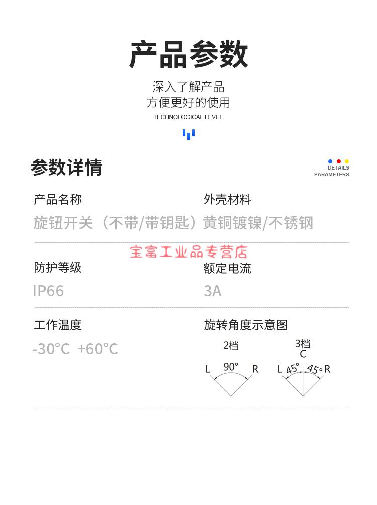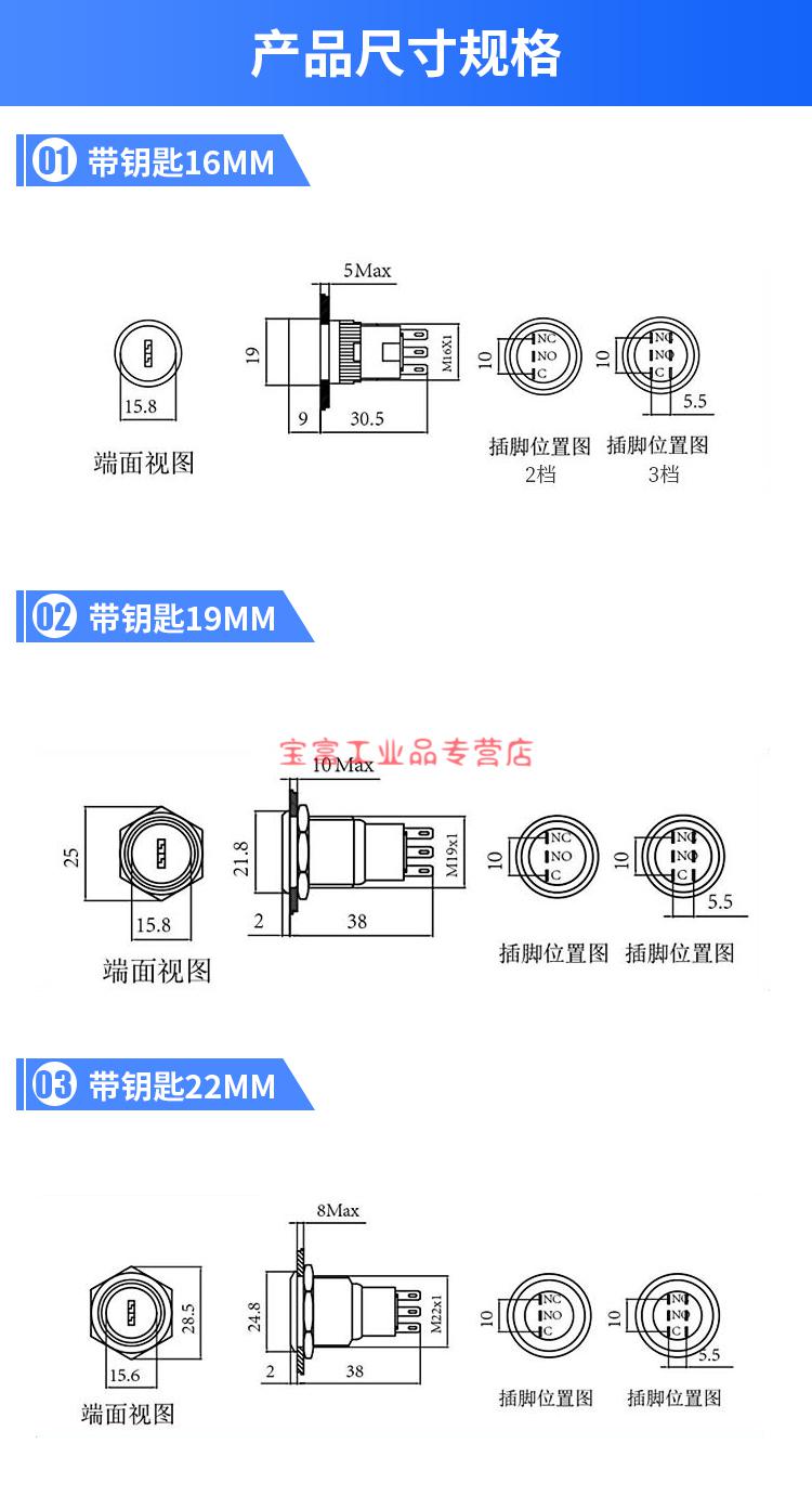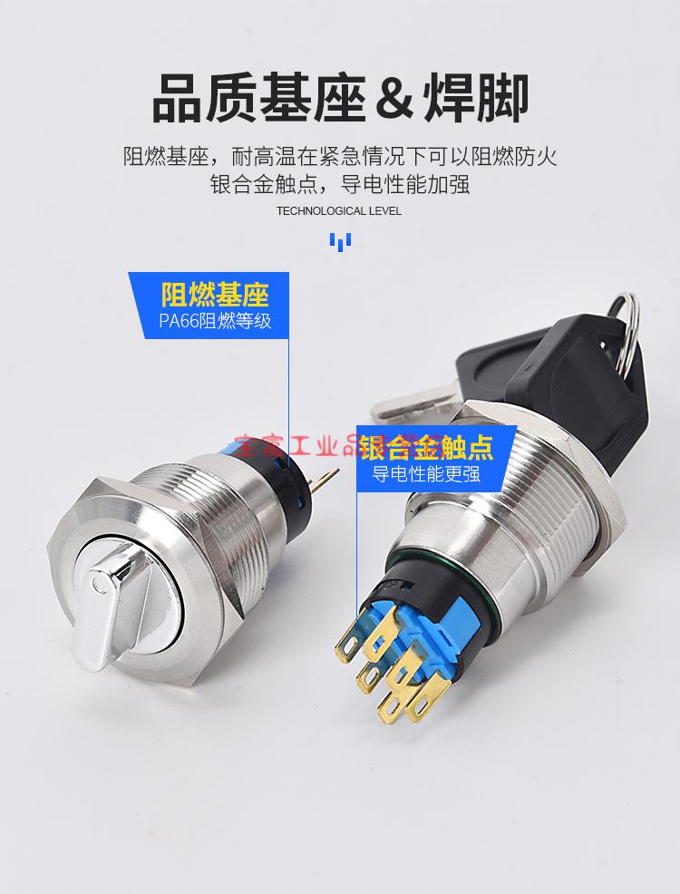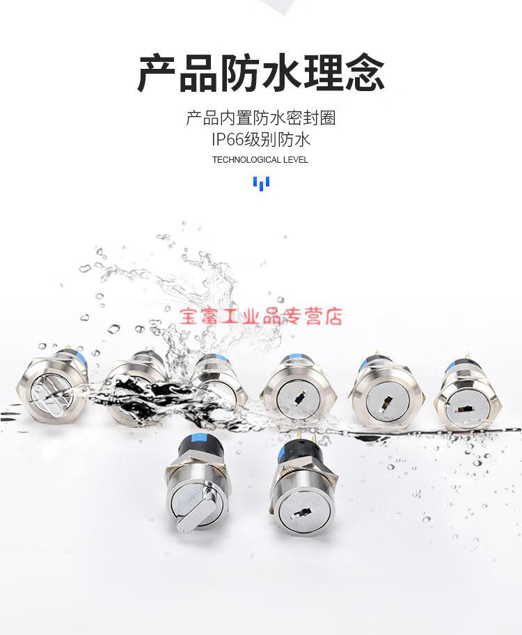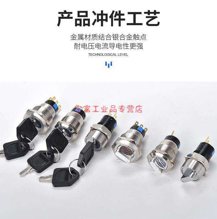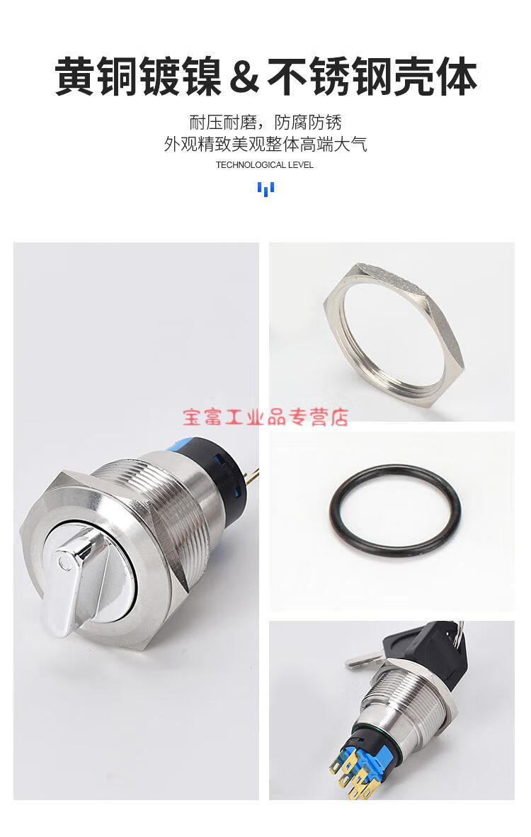 Metal knob switch 16 19 22mm second gear and third gear self-locking reset with key selection switch position button 16mm second gear/3 feet (with key)