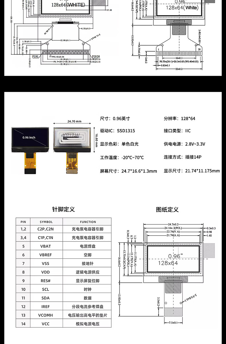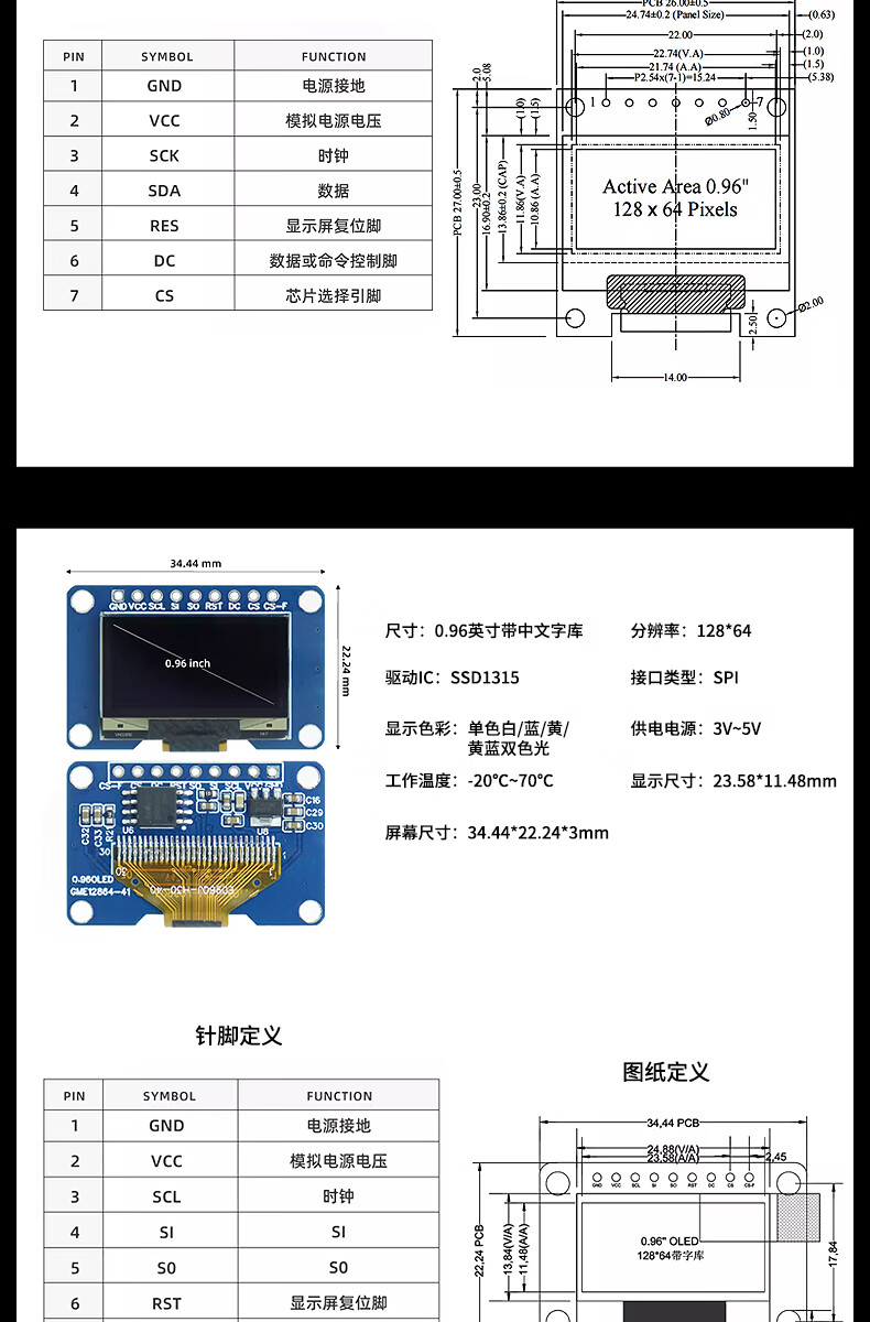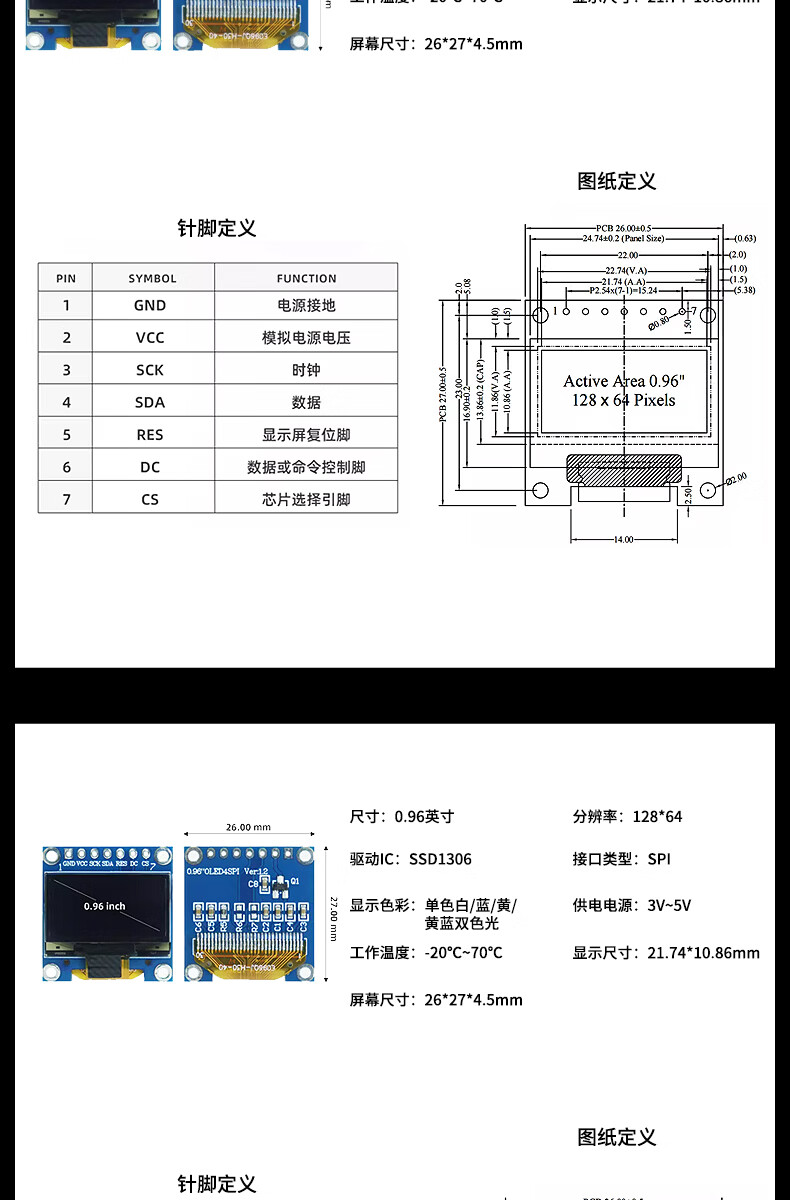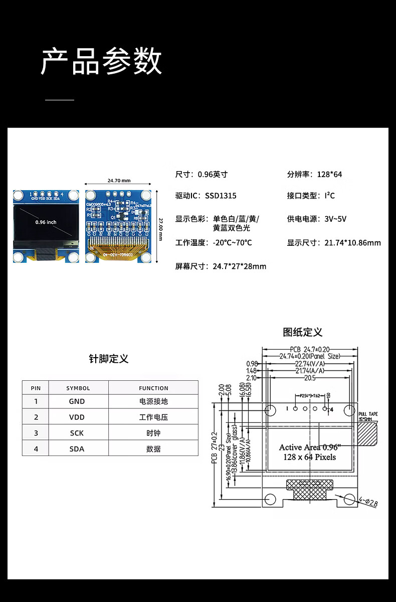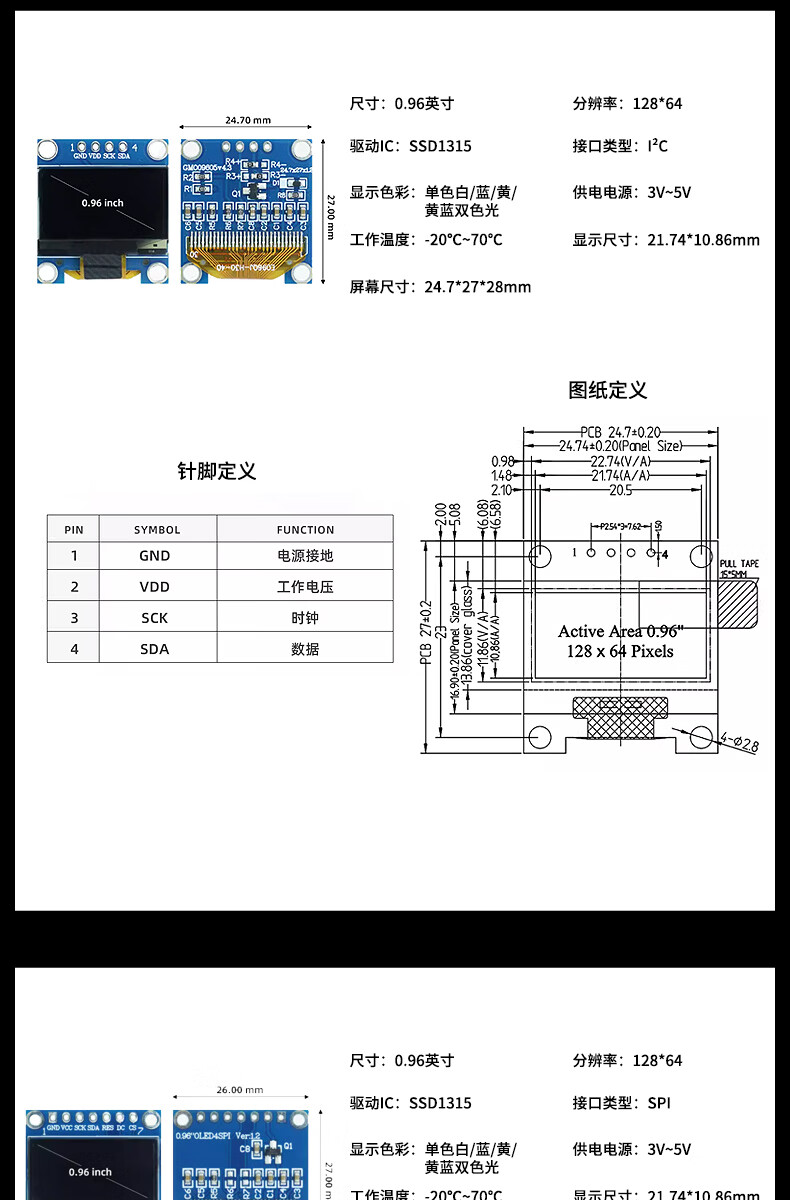 Jiudingxin monochrome OLED LCD screen development board bare screen small screen 64x128 IC chip SSD1315 0.96-inch narrow edge 9-pin non-soldering pin module with font yellow and blue 2 packs