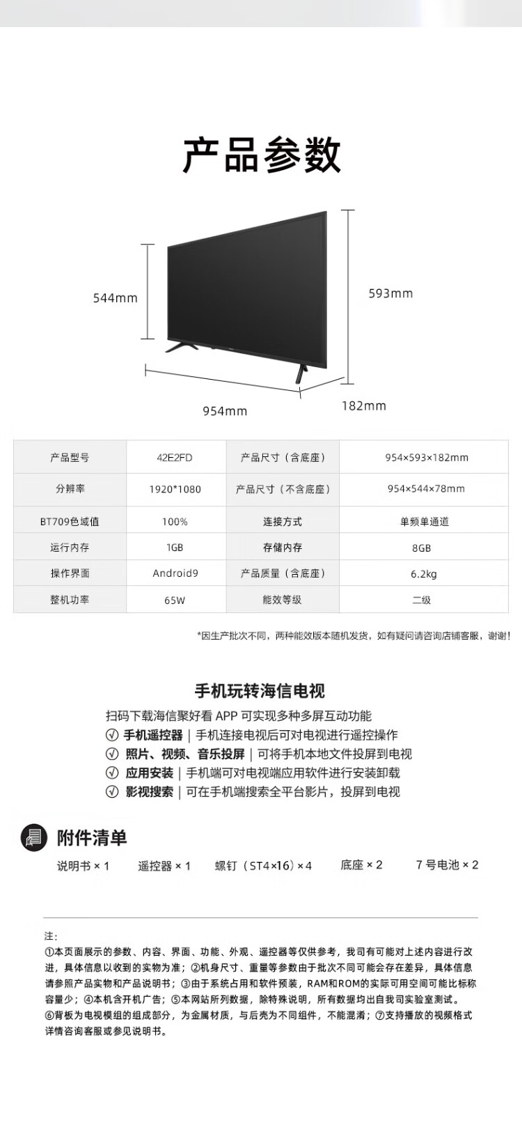 Hisense TV 42E2FD 42-inch 8G memory full HD high-power sound cavity WIFI smart ultra-thin flat-panel LCD TV 42-inch