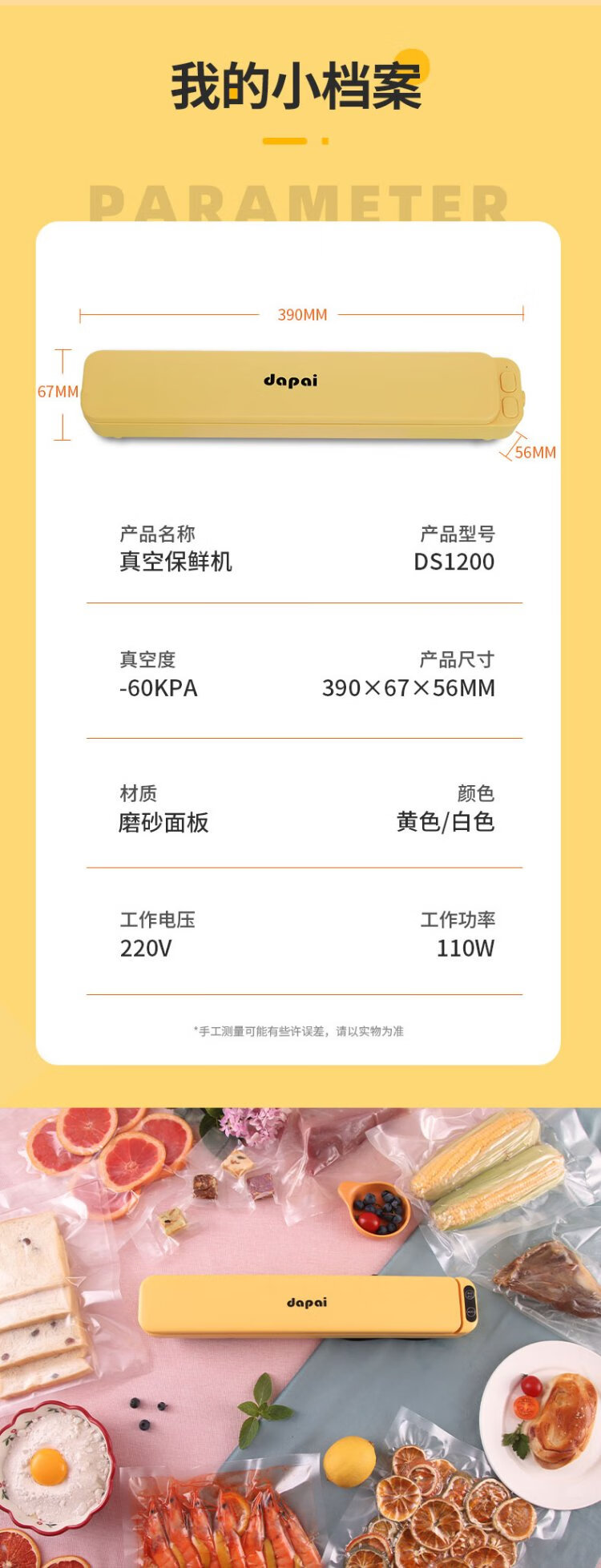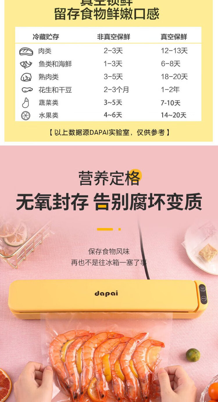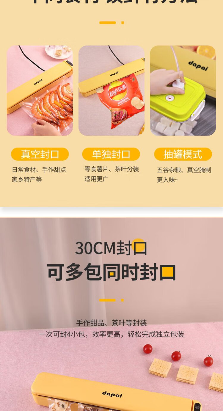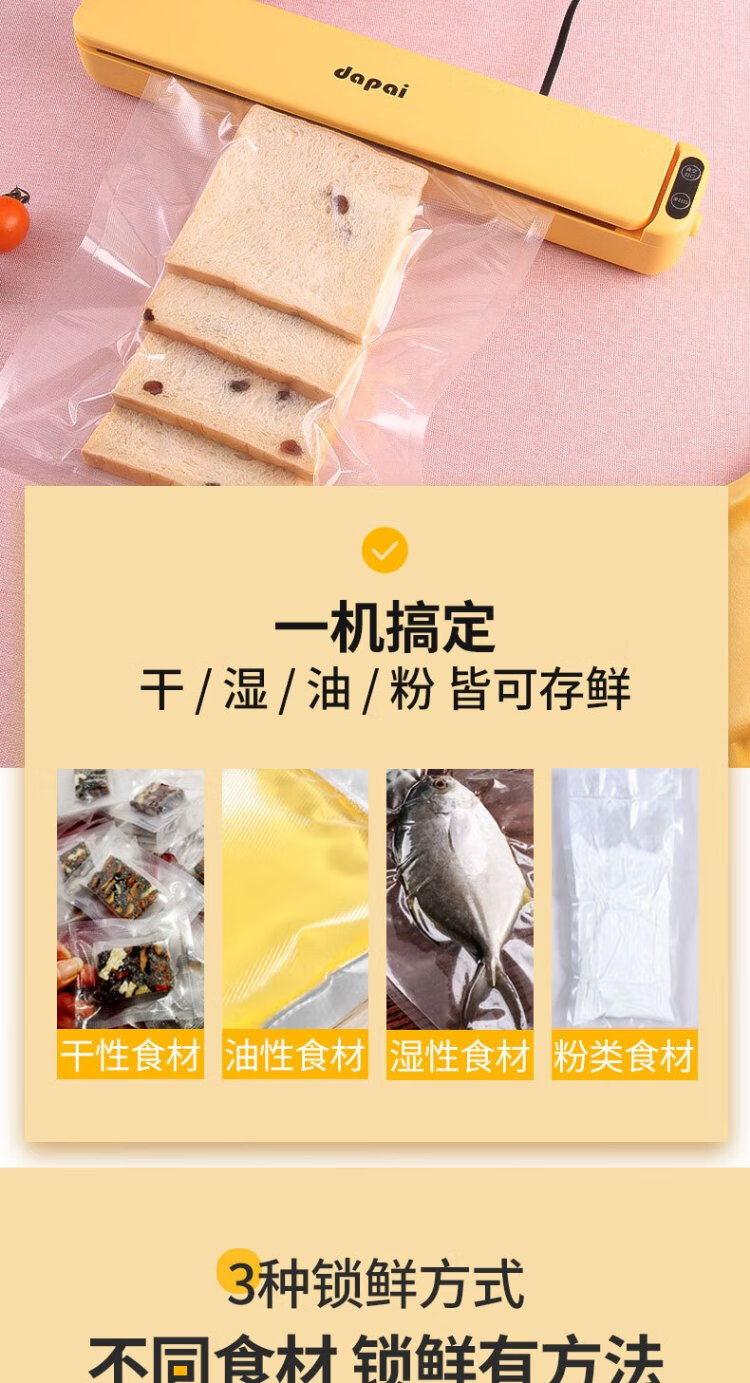 Dapai vacuum sealing machine, vacuum machine, food pumping and packaging machine, packaging machine, plastic sealing machine, snack preservation, dry and wet plastic sealing, small fully automatic compression artifact, vacuum sealing machine yellow model (one-click preservation)
