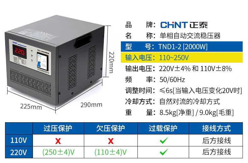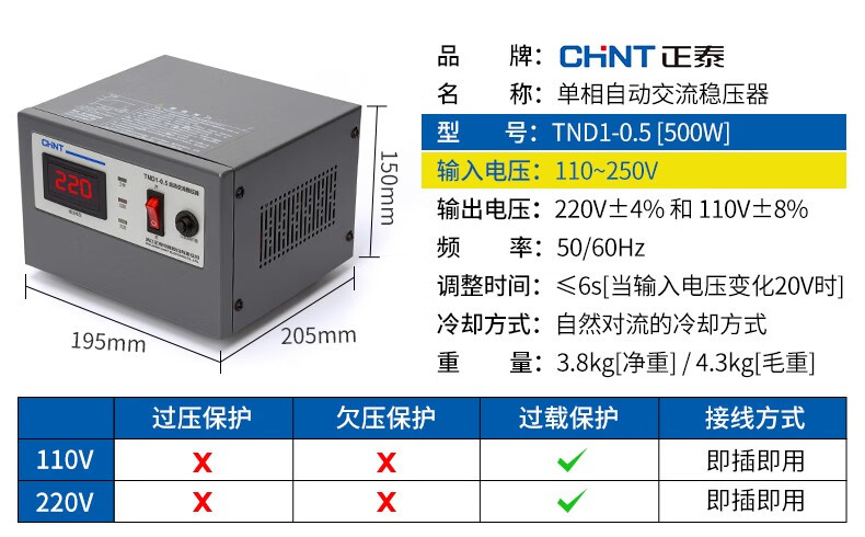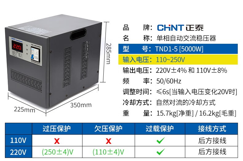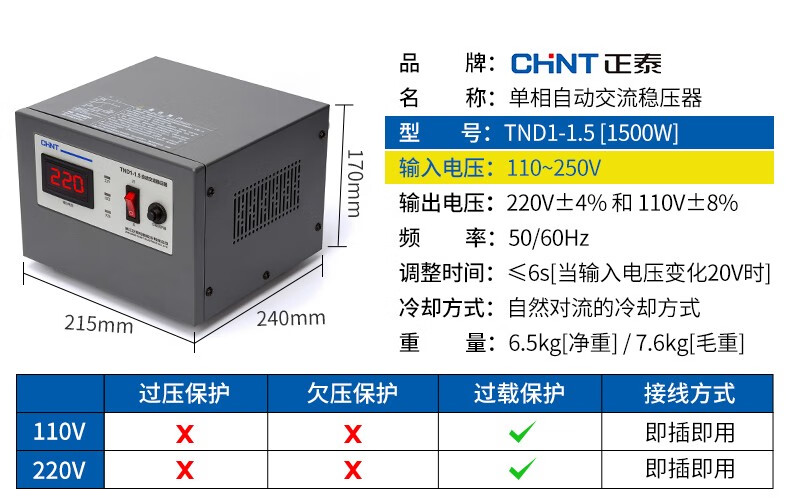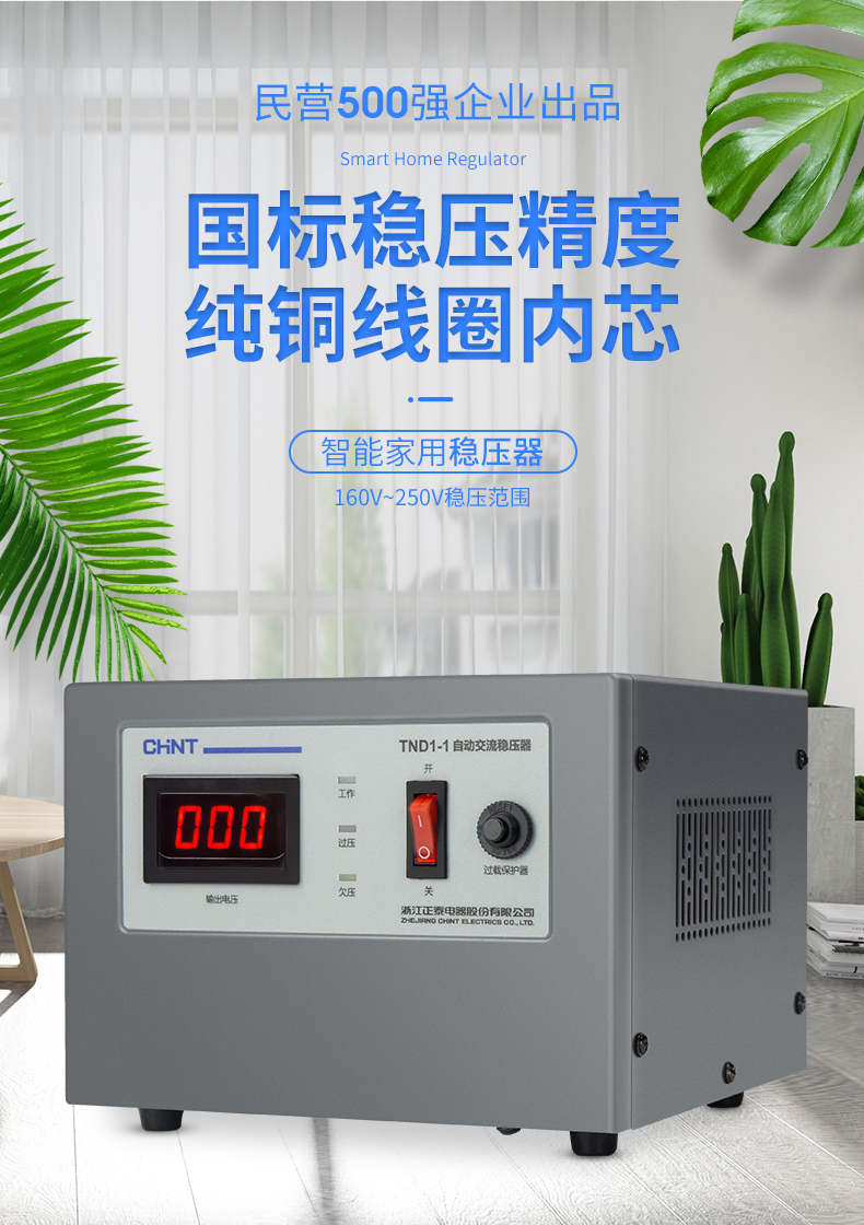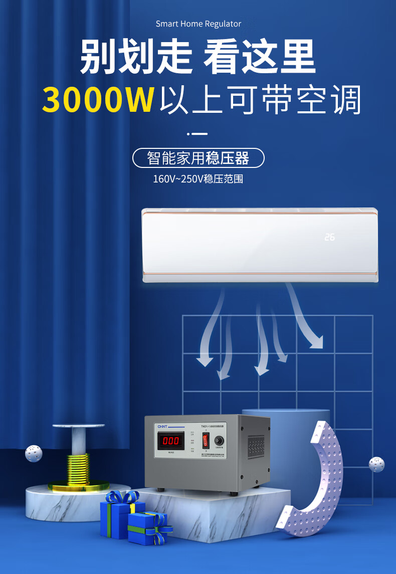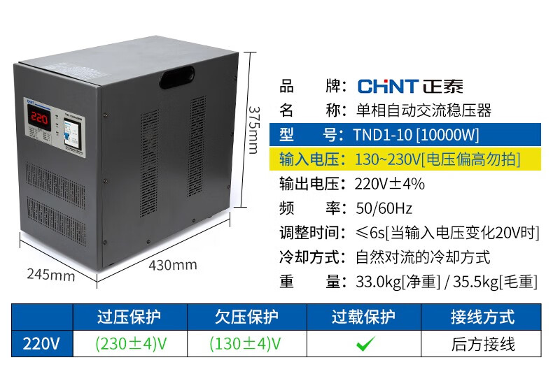 Chint (CHNT) ultra-low voltage single-phase automatic AC voltage stabilizer household power supply air conditioning computer input voltage 110V-250V vertical 15000W (voltage stabilization range 130-230V)