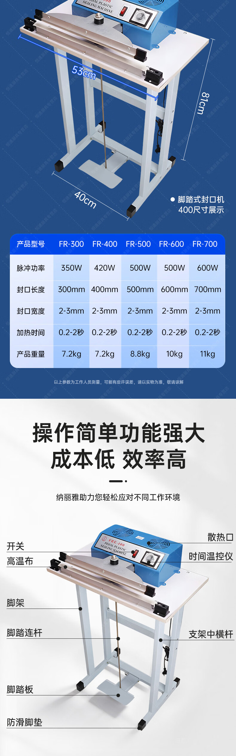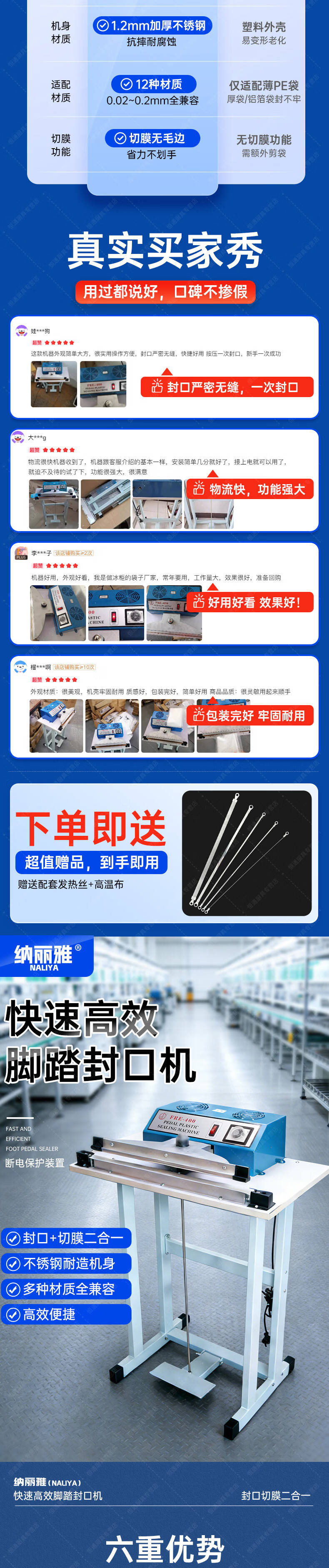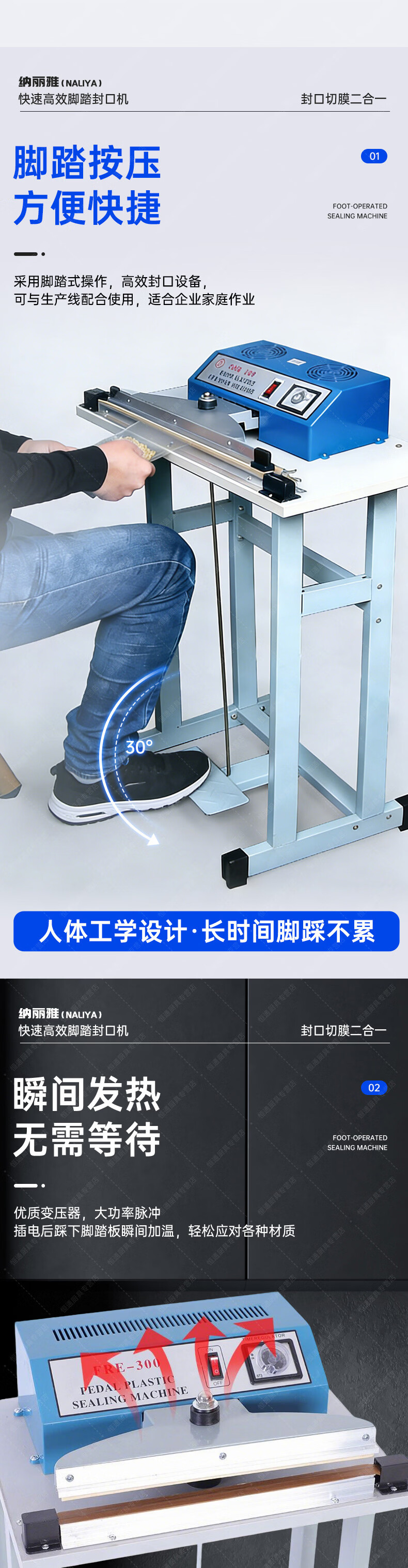 Naliya commercial sealing machine foot pedal plastic film sealing and cutting dual-purpose continuous shrink film aluminum foil bag quick packaging multi-functional vertical plastic packaging machine foot pedal 400 type 380mm width 2mm