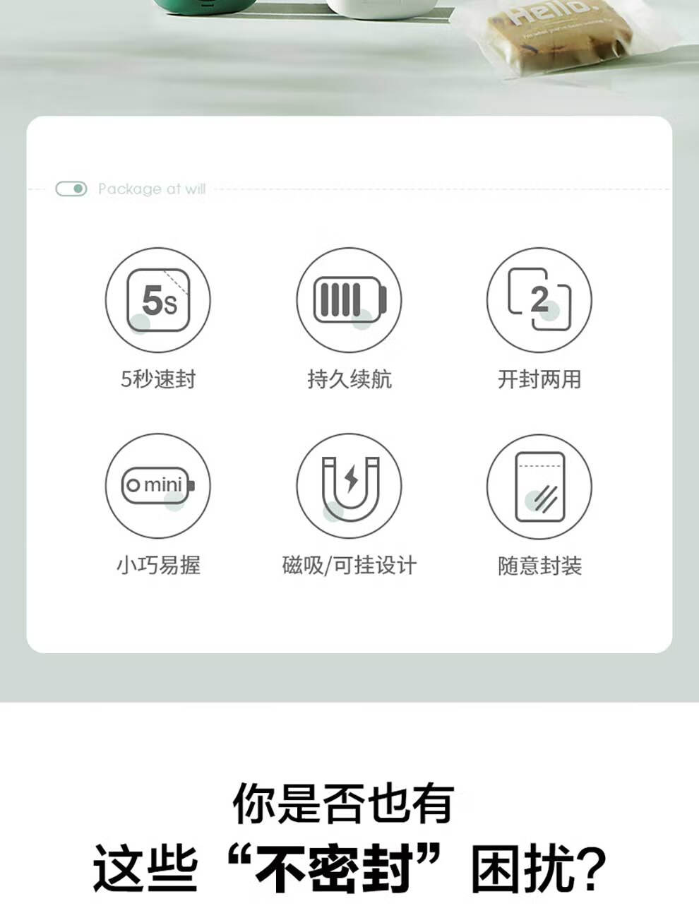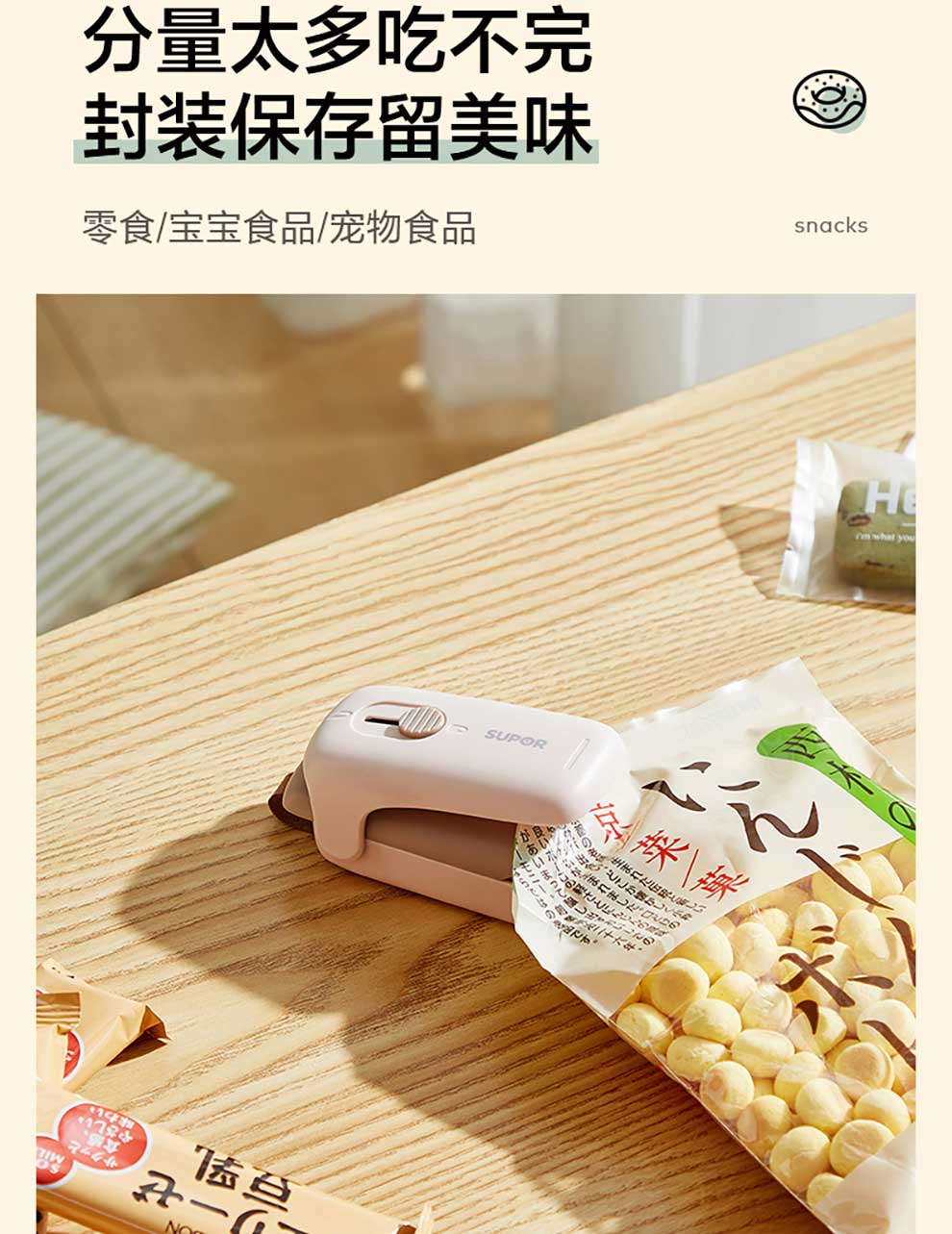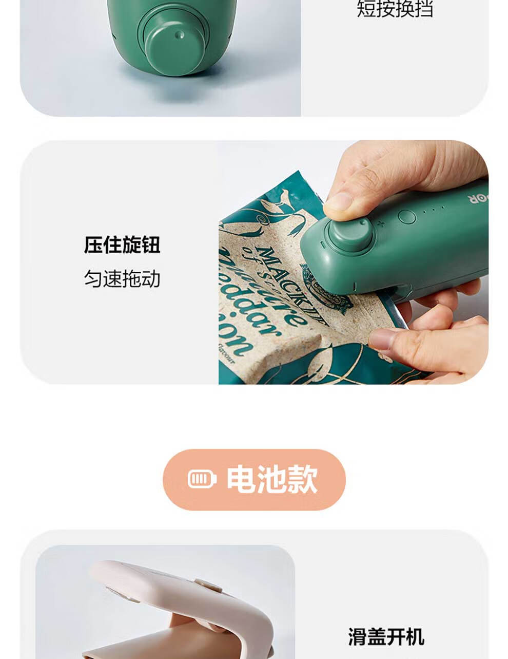 SUPOR sealing machine mini portable sealing clip household snack sealing machine sealing machine plastic sealing machine hand pressure heat sealing machine battery style fog white practice bag + battery