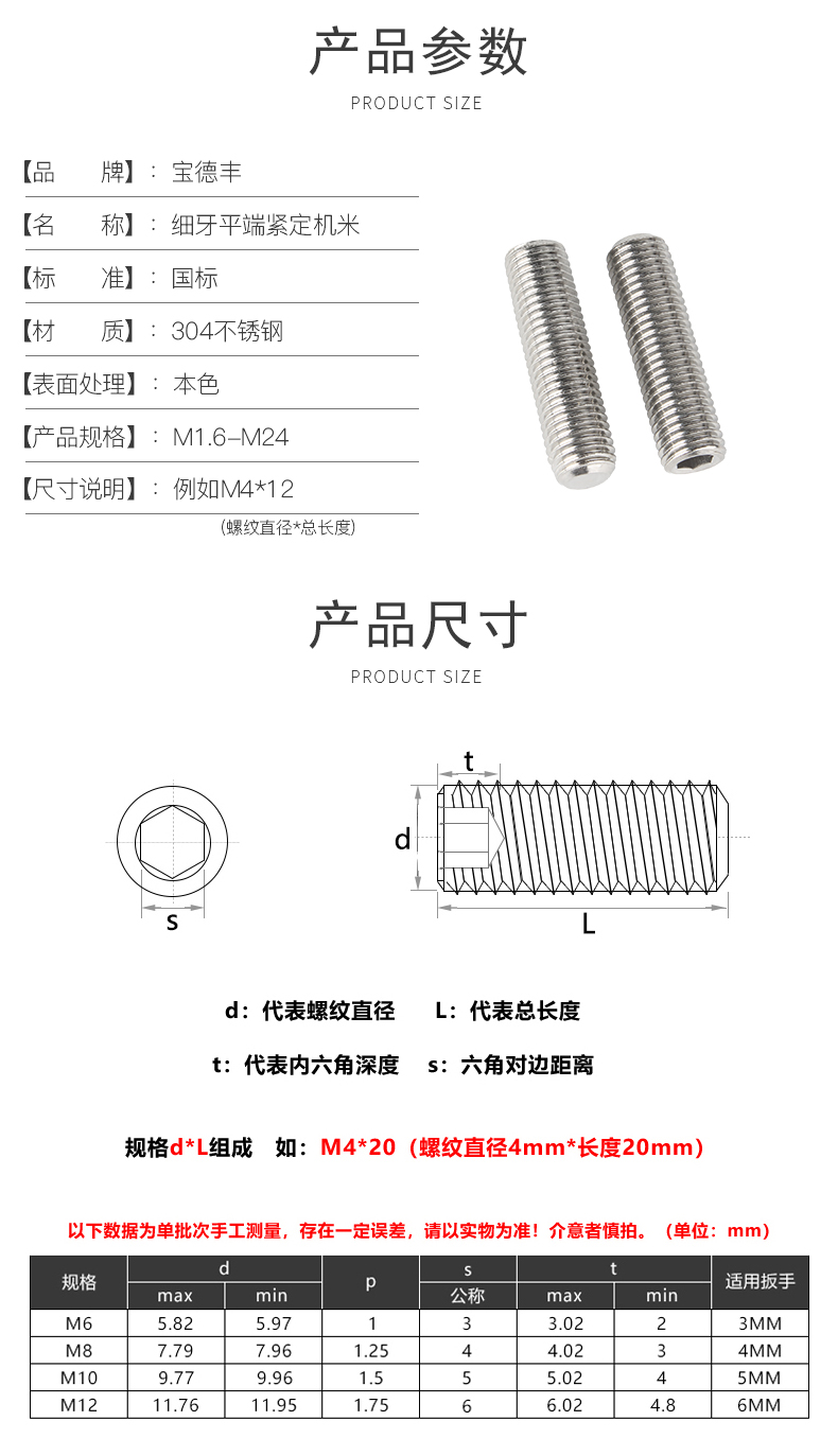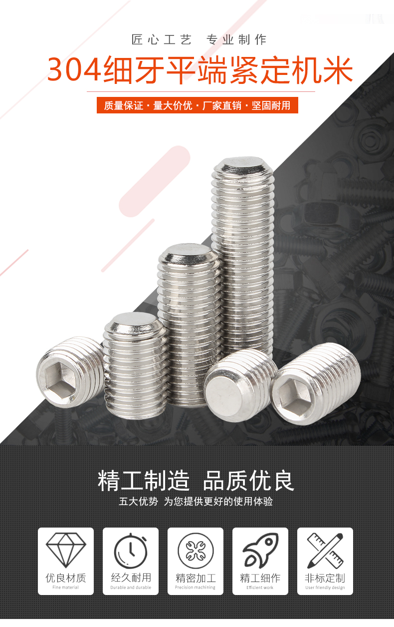 Baodefeng 304 stainless steel fine tooth set screw concave end headless hexagon socket screw flat end tightening machine meter top screw national standard fastener standard parts M7X1.0X10 concave end 10 pieces