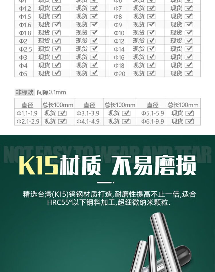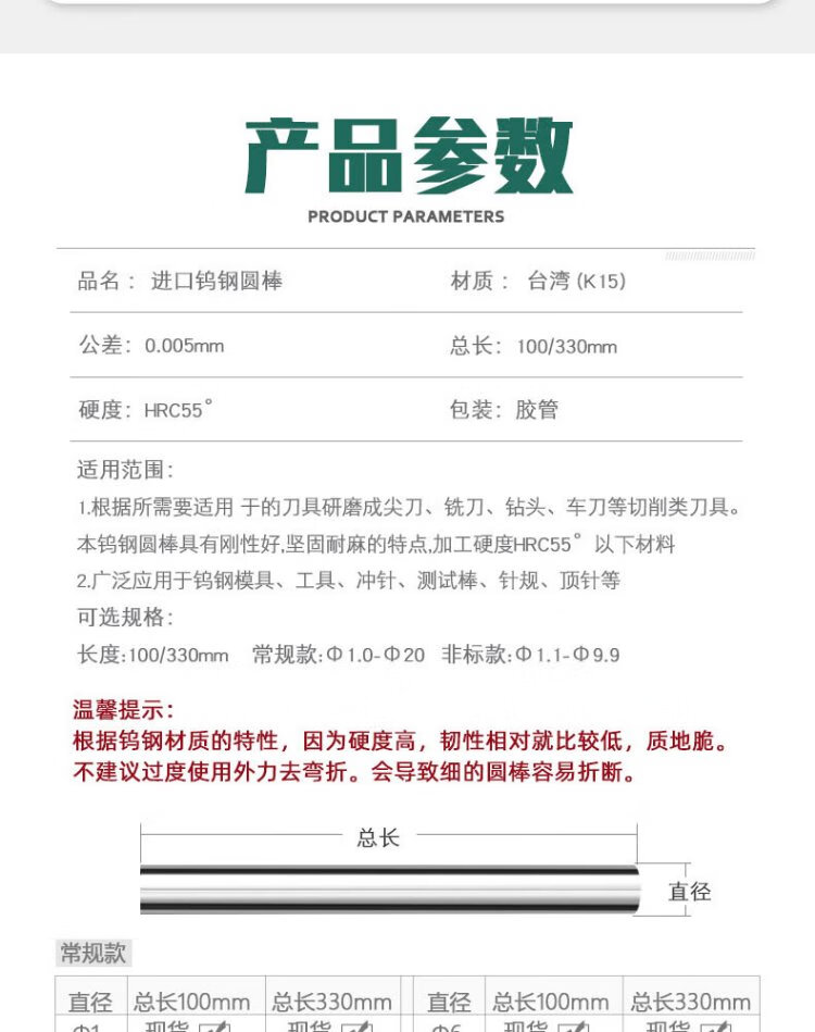 K15 tungsten steel rod round rod length 100mm imported carbide rod diameter 0.3-40mm super hard turning tool rod 2.5*100-K15 Taiwan model