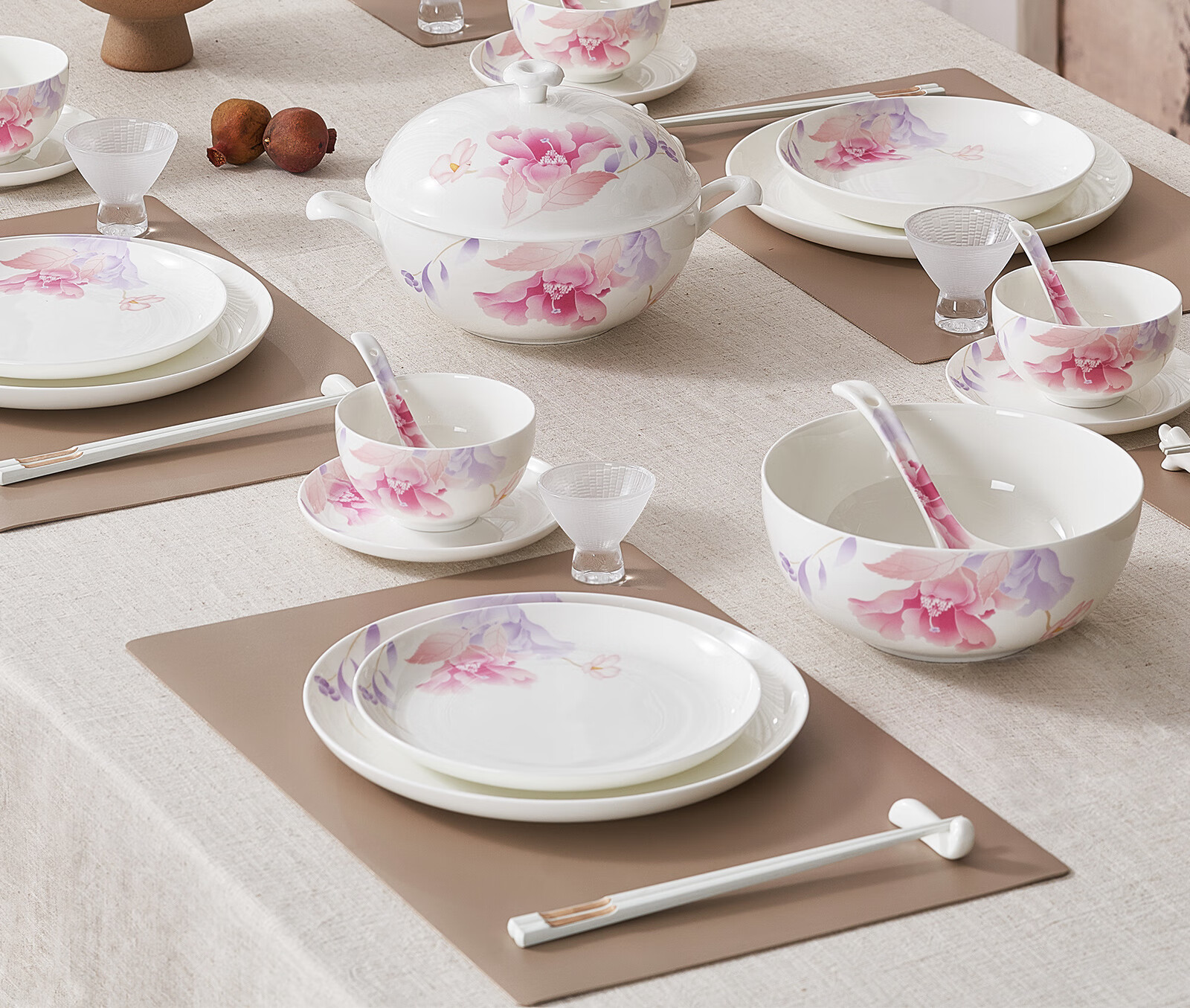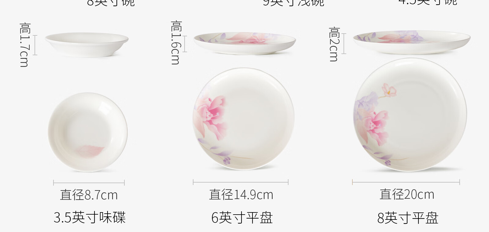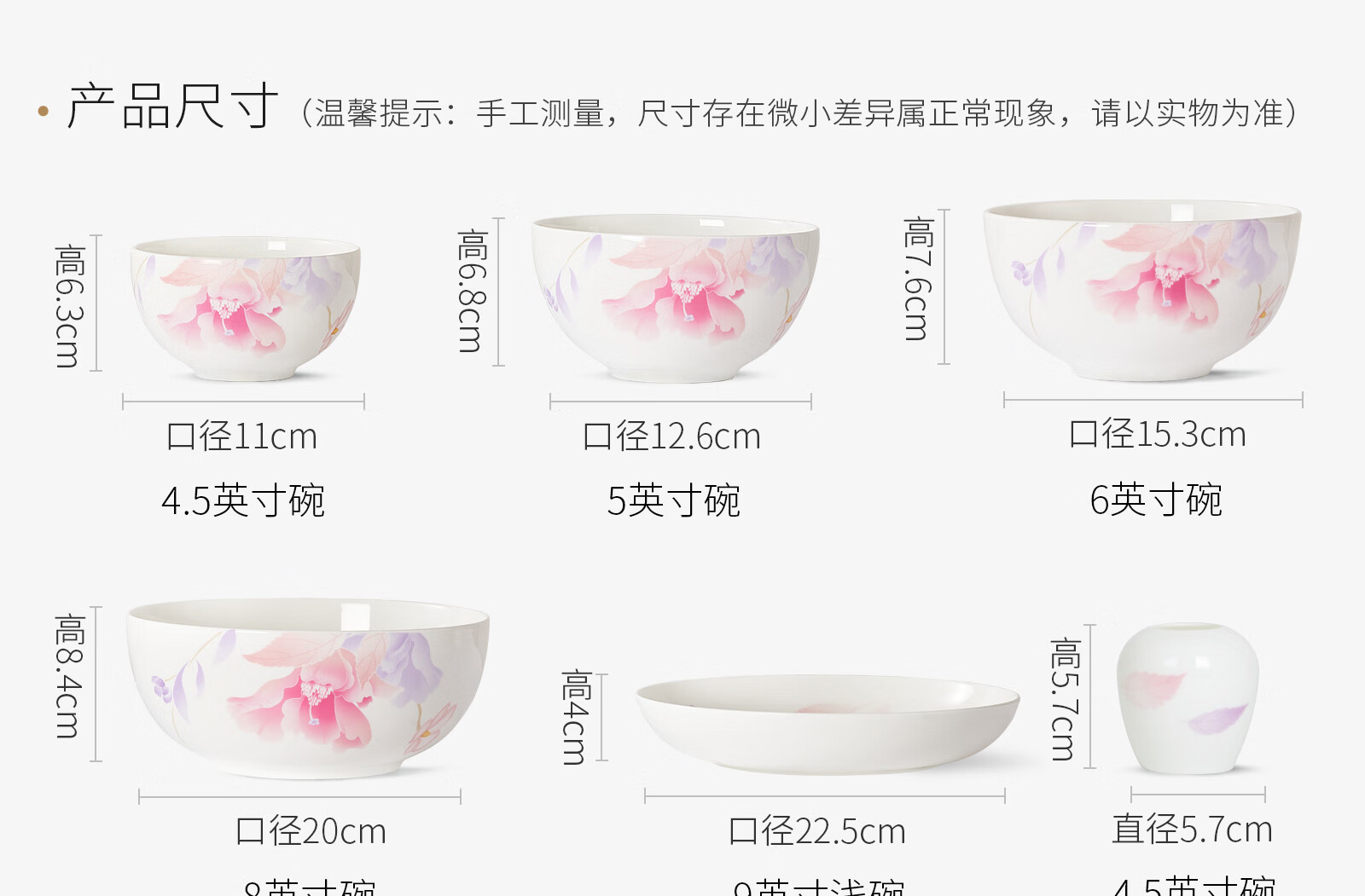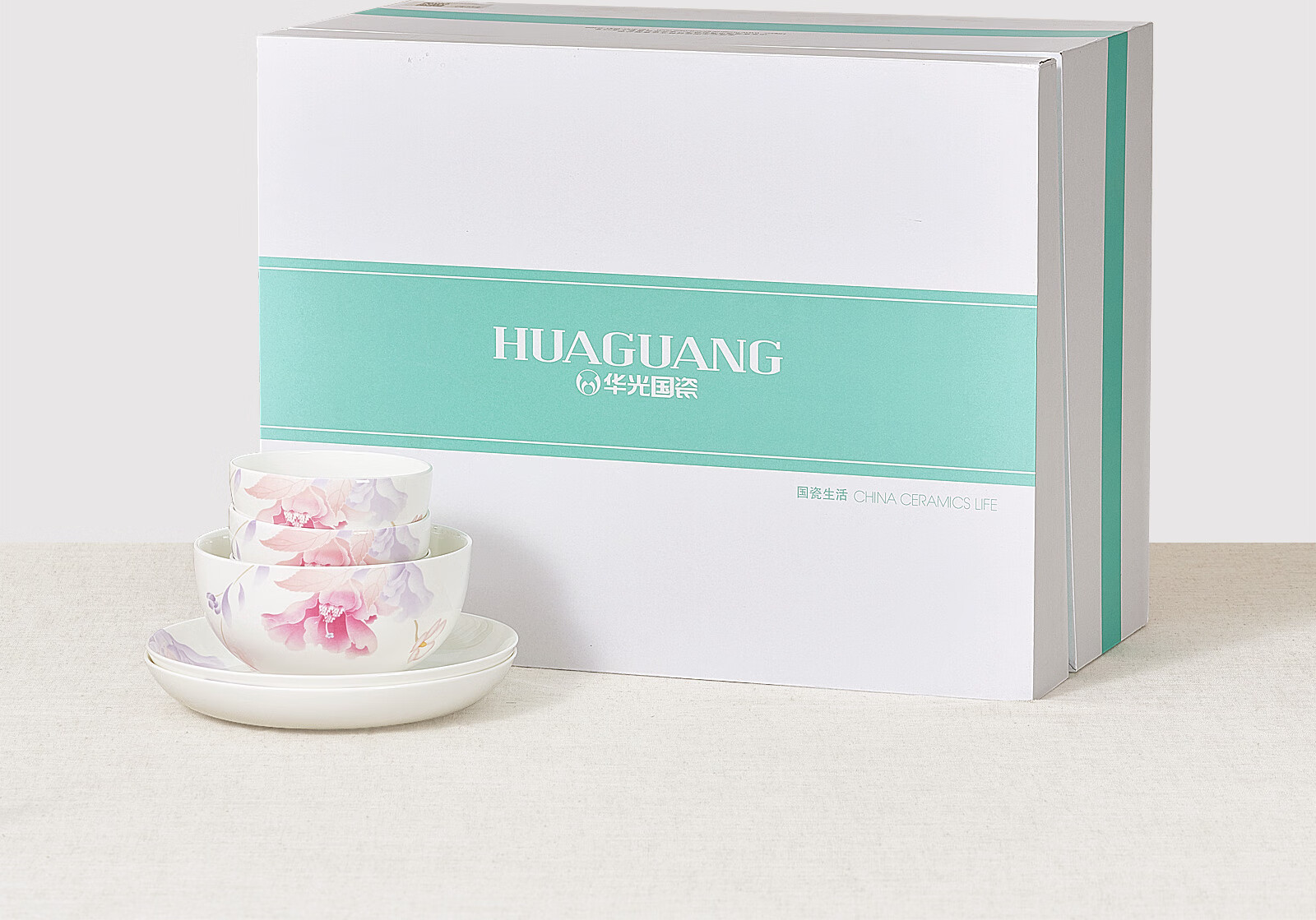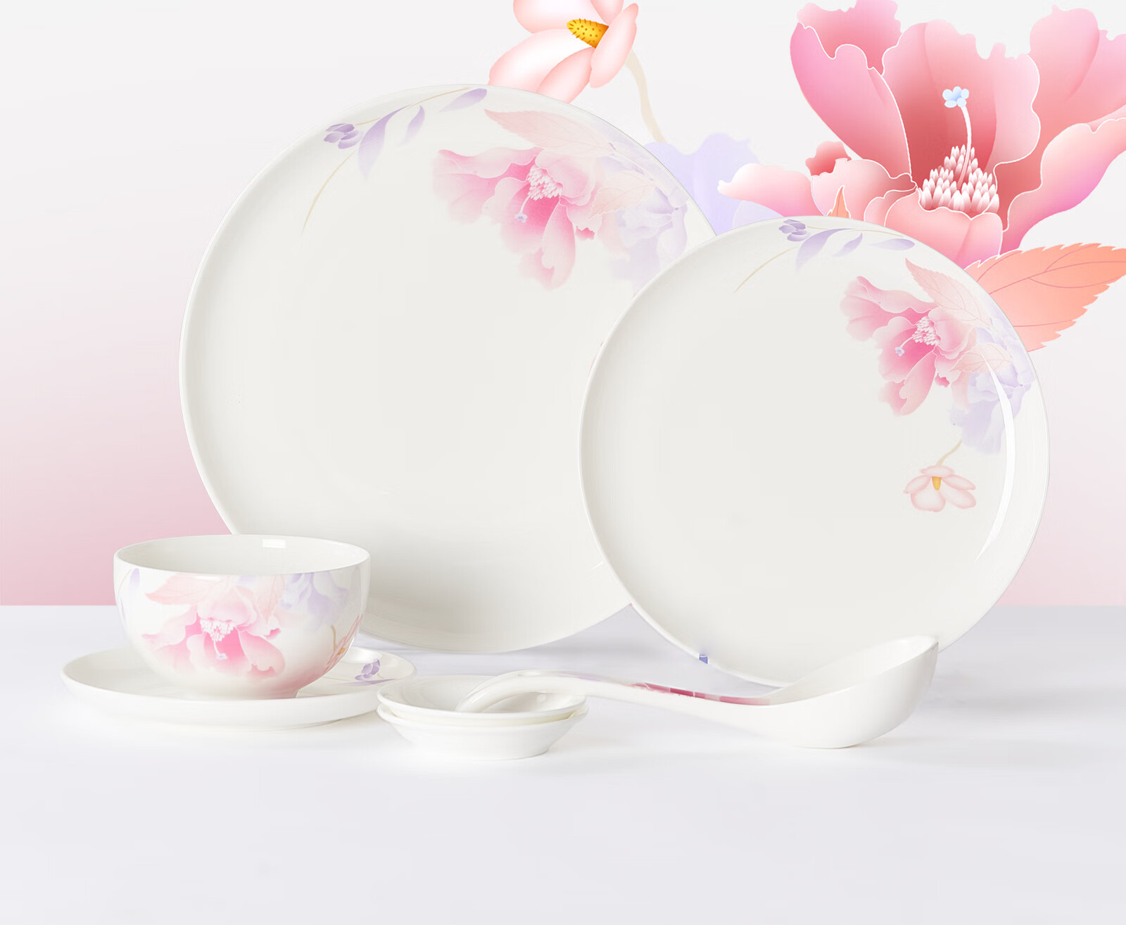 Huaguang National Porcelain Bowl and Plate Tableware Set Antibacterial Bone China Tableware and Dish Set Housewarming and Wedding Gift Flowers and Full Moon Suitable for 4 people Antibacterial Gift Box 22 pieces