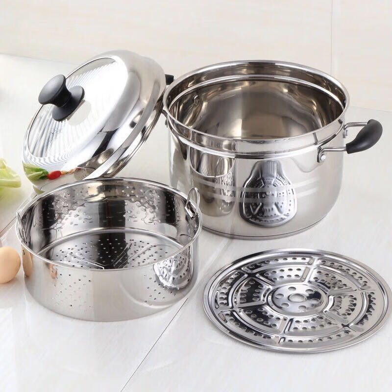 Stainless steel thickened Japanese steamer soup pot double bottom pot steamer steamer grid rice rice soup rice steamer Tailanshi 22cm (with steamer) one layer suitable for 1-2 people thickened double bottom pot