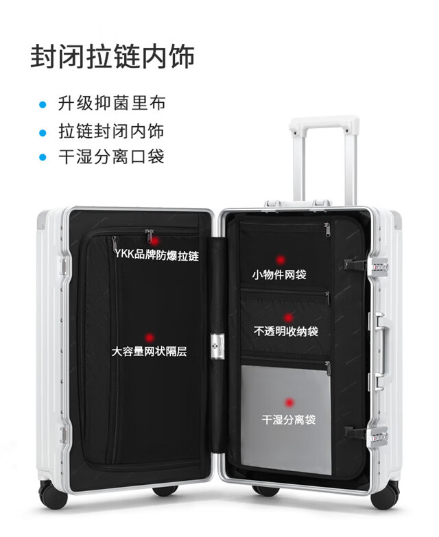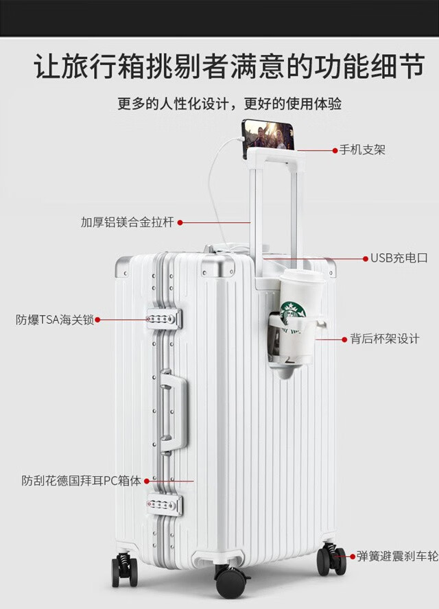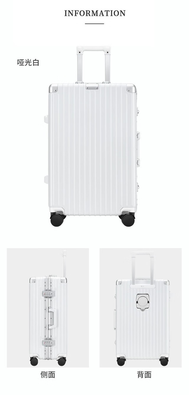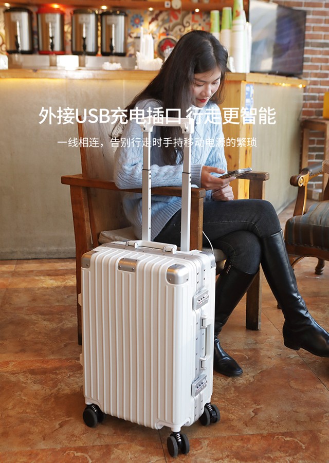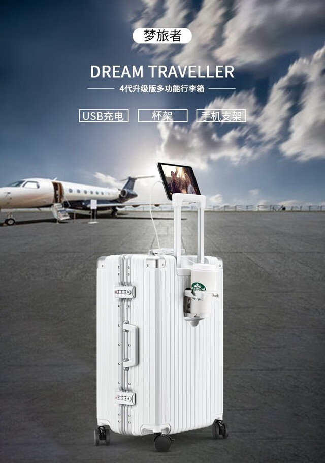Dream Traveler multi-functional suitcase with high appearance, aluminum frame, large capacity trolley case, universal wheel suitcase, password box for male and female students, matte white buckle, 20 inches (carry-on case + USB charging)