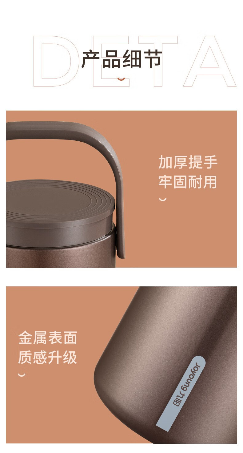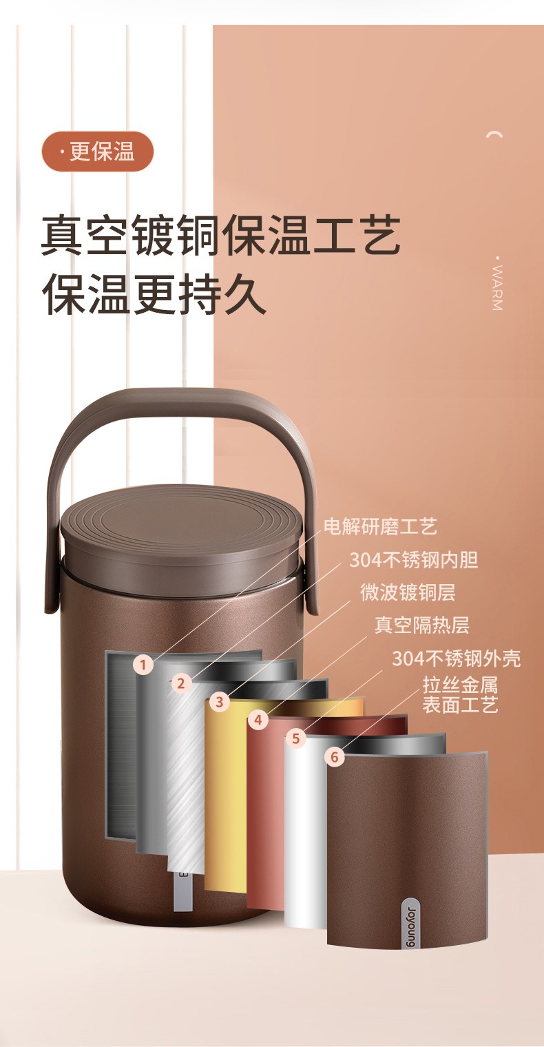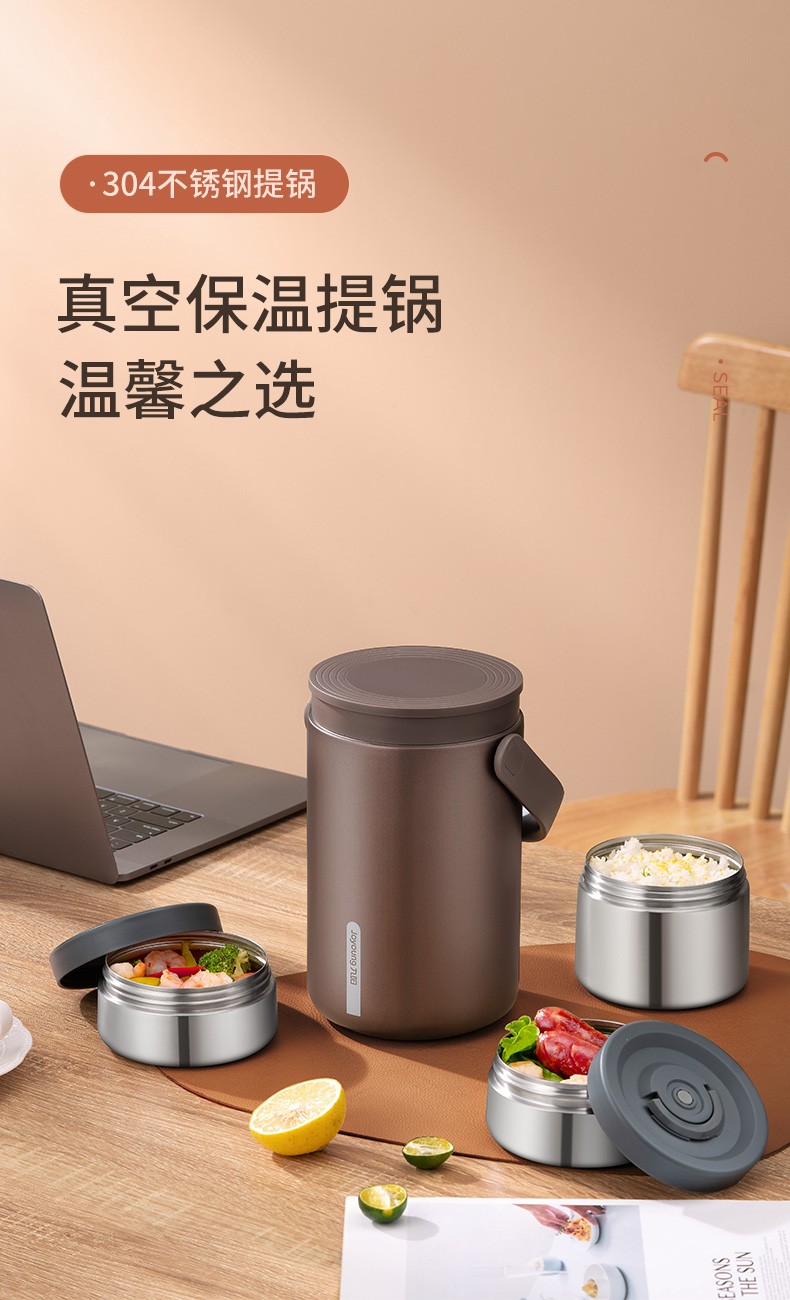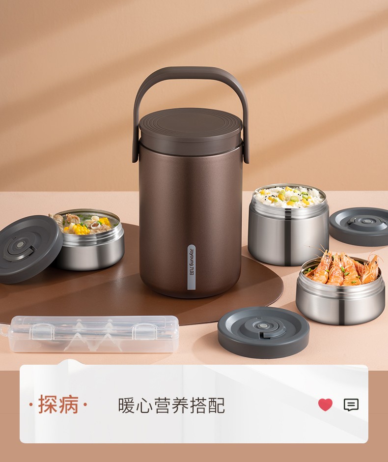 Joyoung Insulated Multi-layer 304 Stainless Steel Student Large Capacity Pot Lunch Box Three Compartments Sealed Insulated - WR765 Brown 2L
